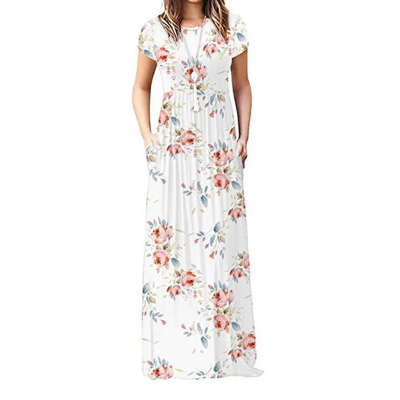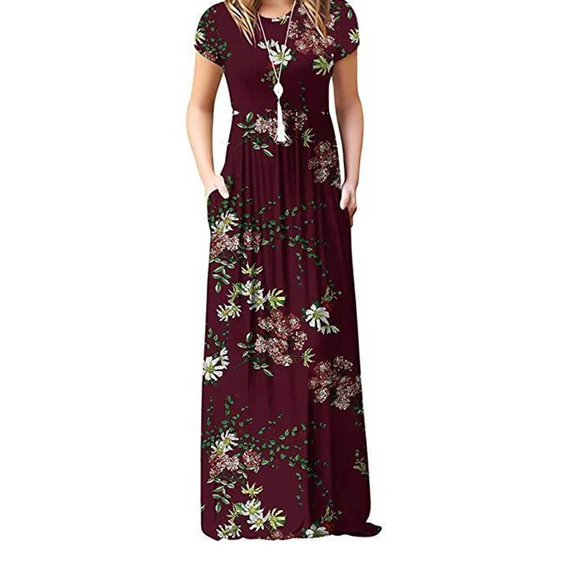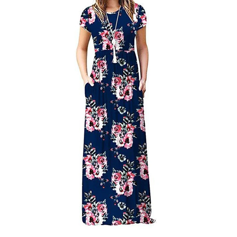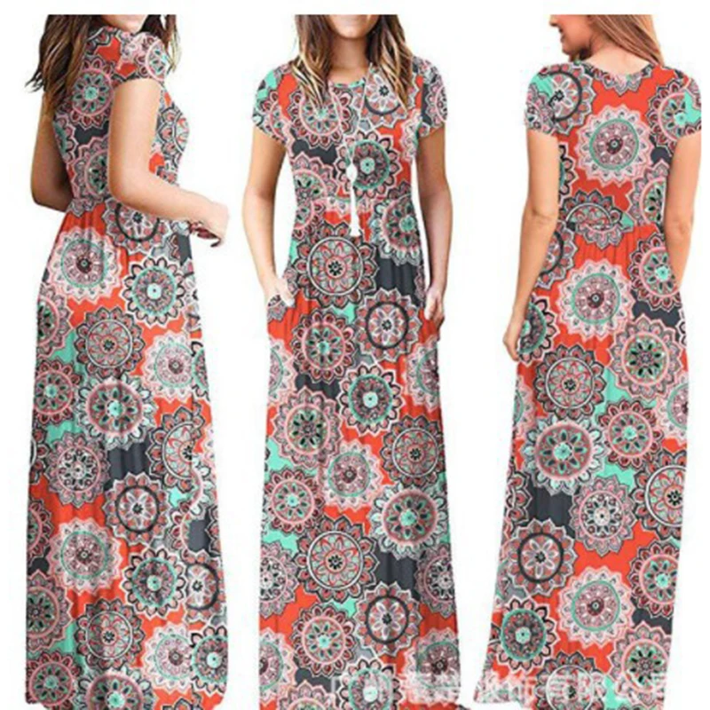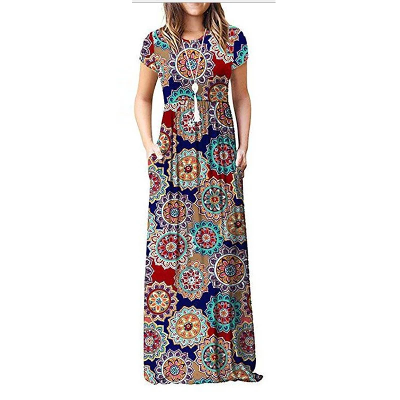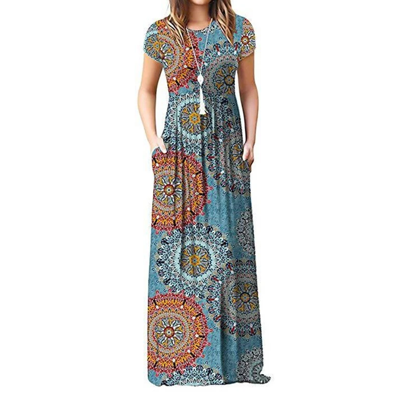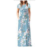 Vintage Women Floral Print A-line Maxi Dress Summer Fashion O Neck Short Sleeve Pocket Long Dresses Elegant Ladies Boho Vestidos