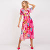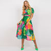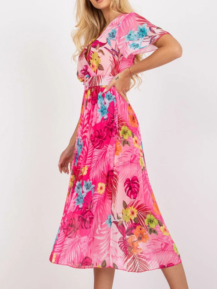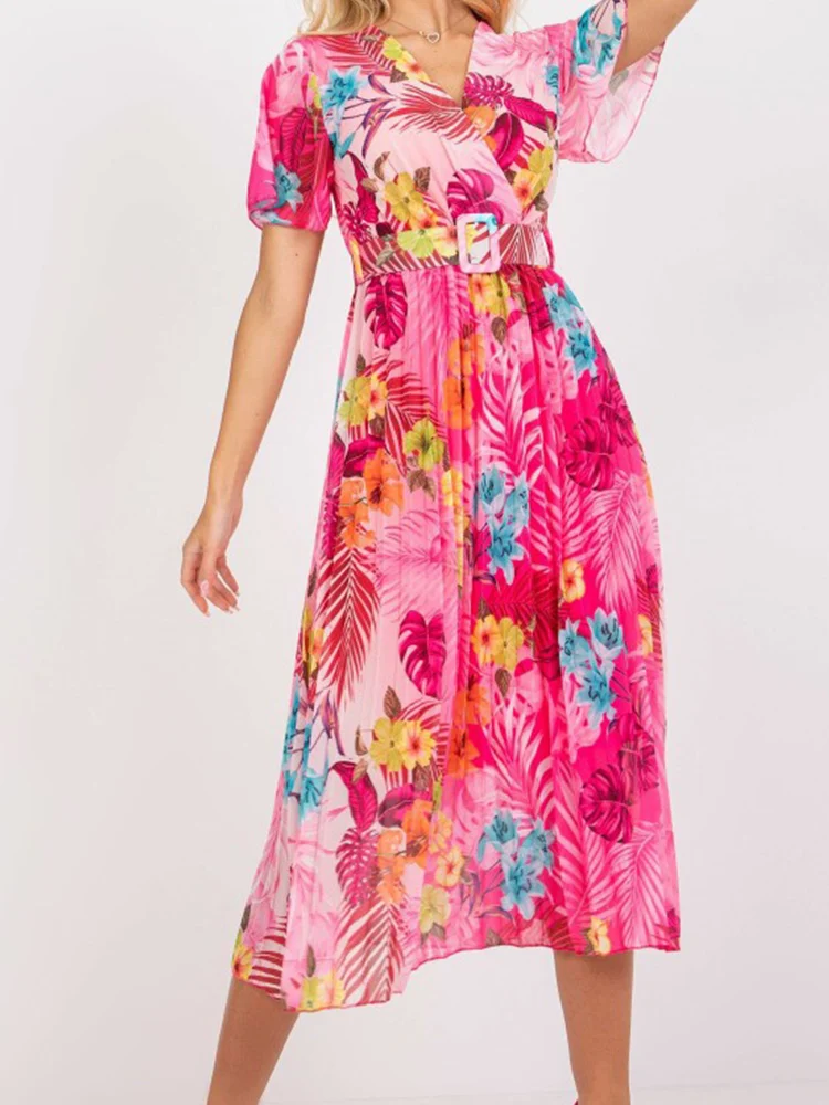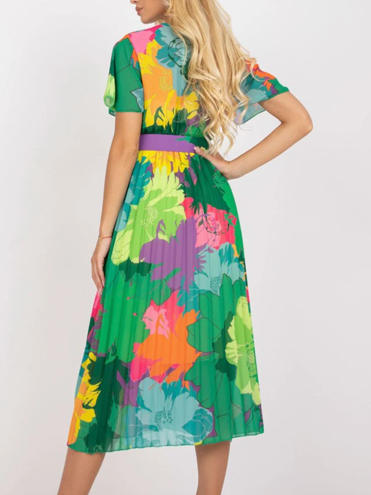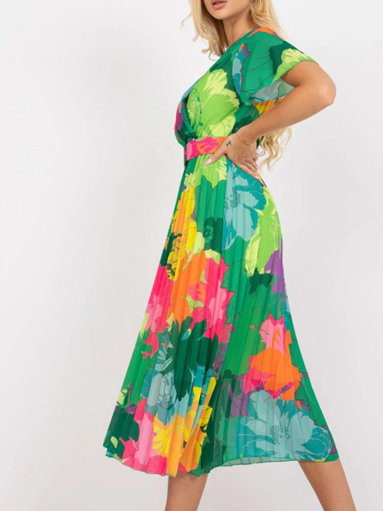 Vintage Women Floral Print Pleated Slim Midi Dress Summer Fashion V Neck Short Sleeve A-line Party Dress Elegant Laides Vestidos