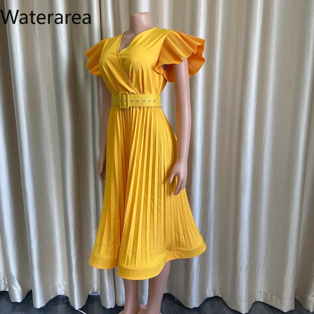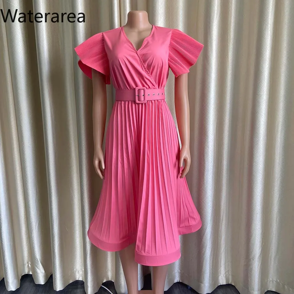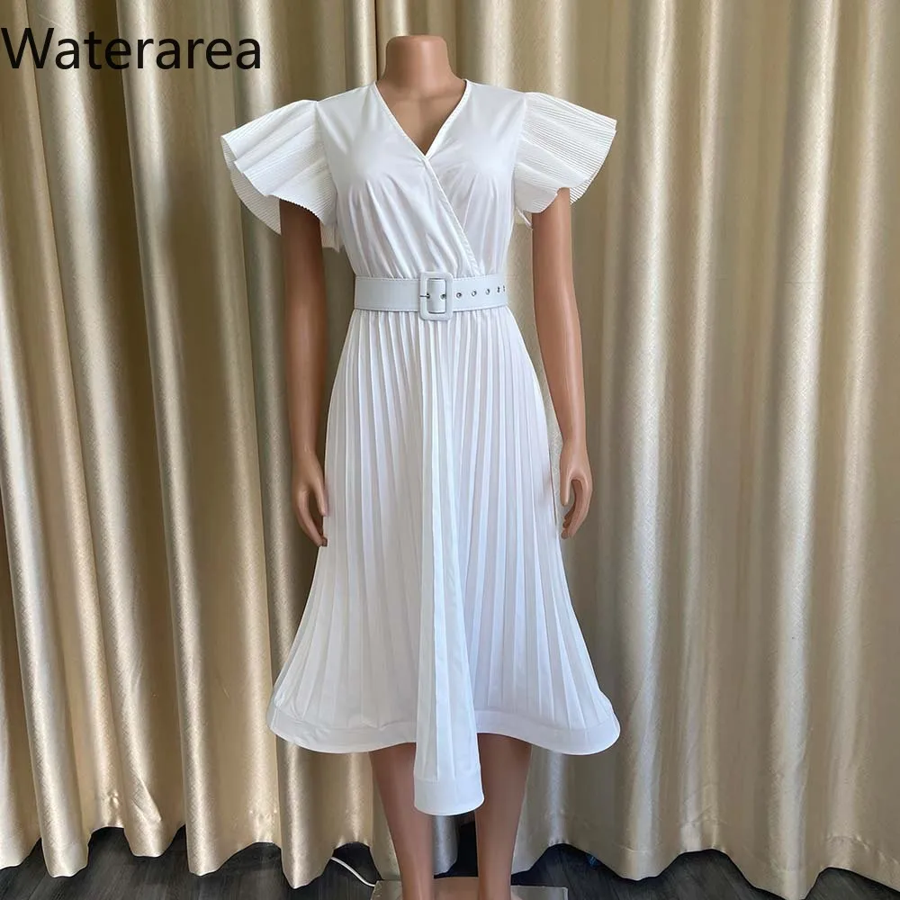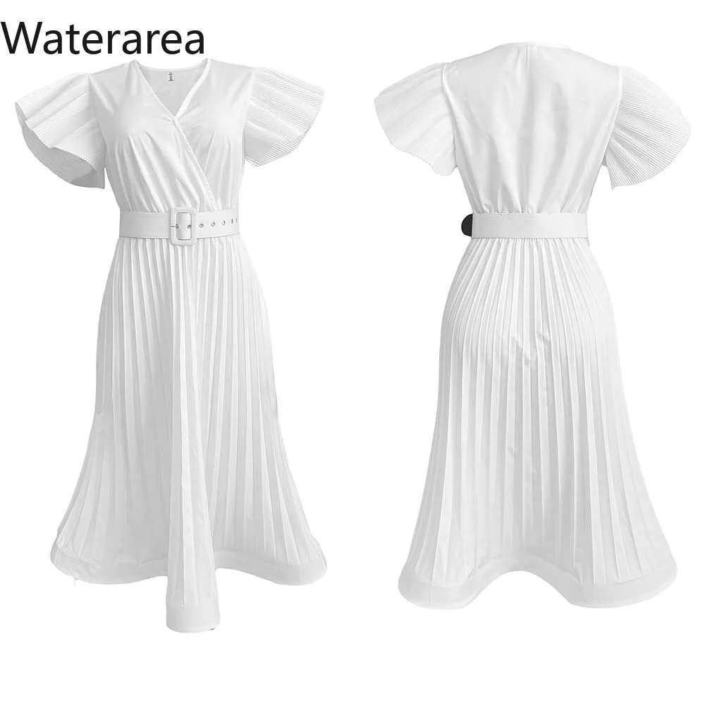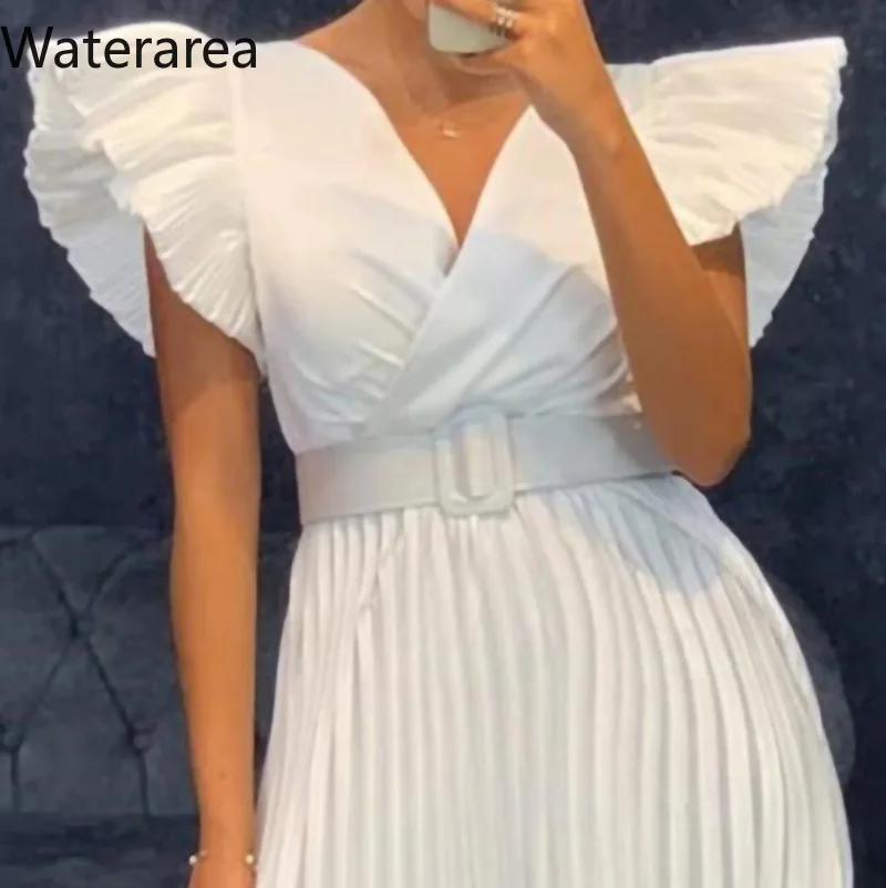 Waterarea New Summer V-Neck Flying Sleeves Dresses Casaul High Waist Belt Pleated Dress Sweet Fashion A-line Loose Dress Women