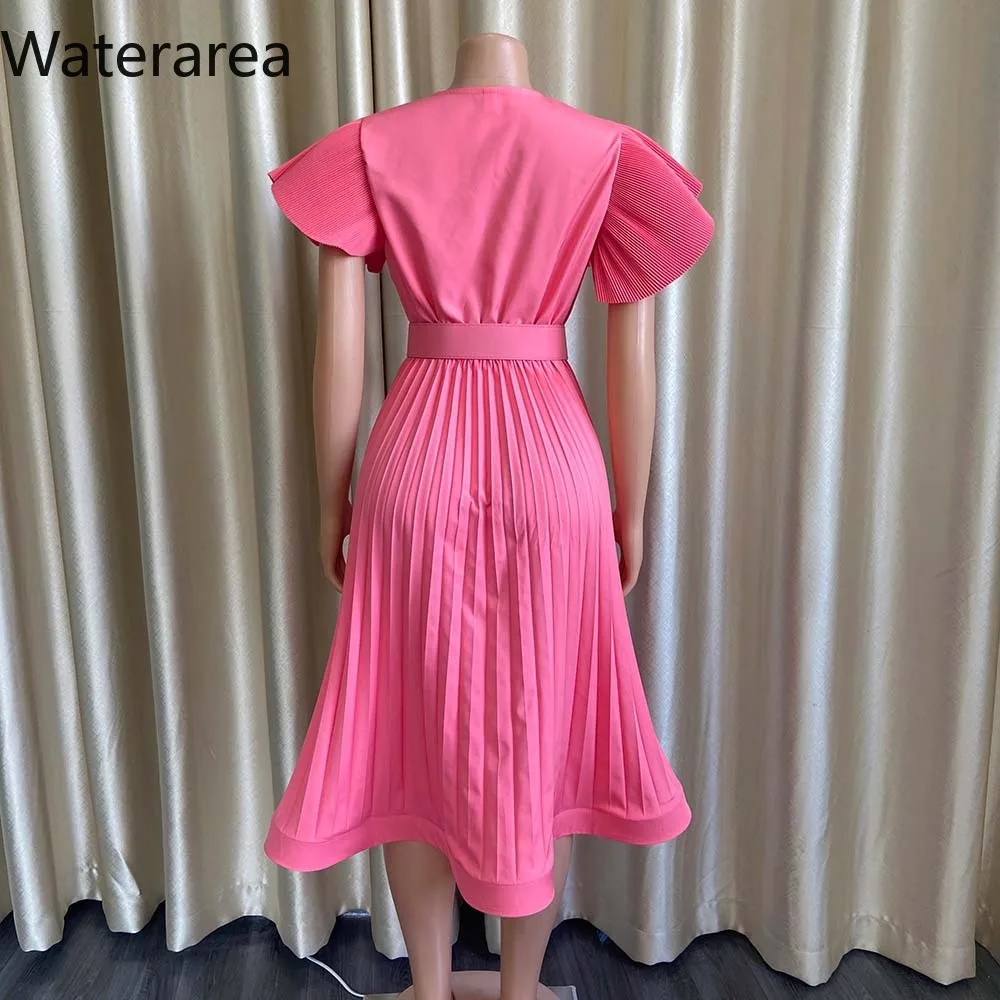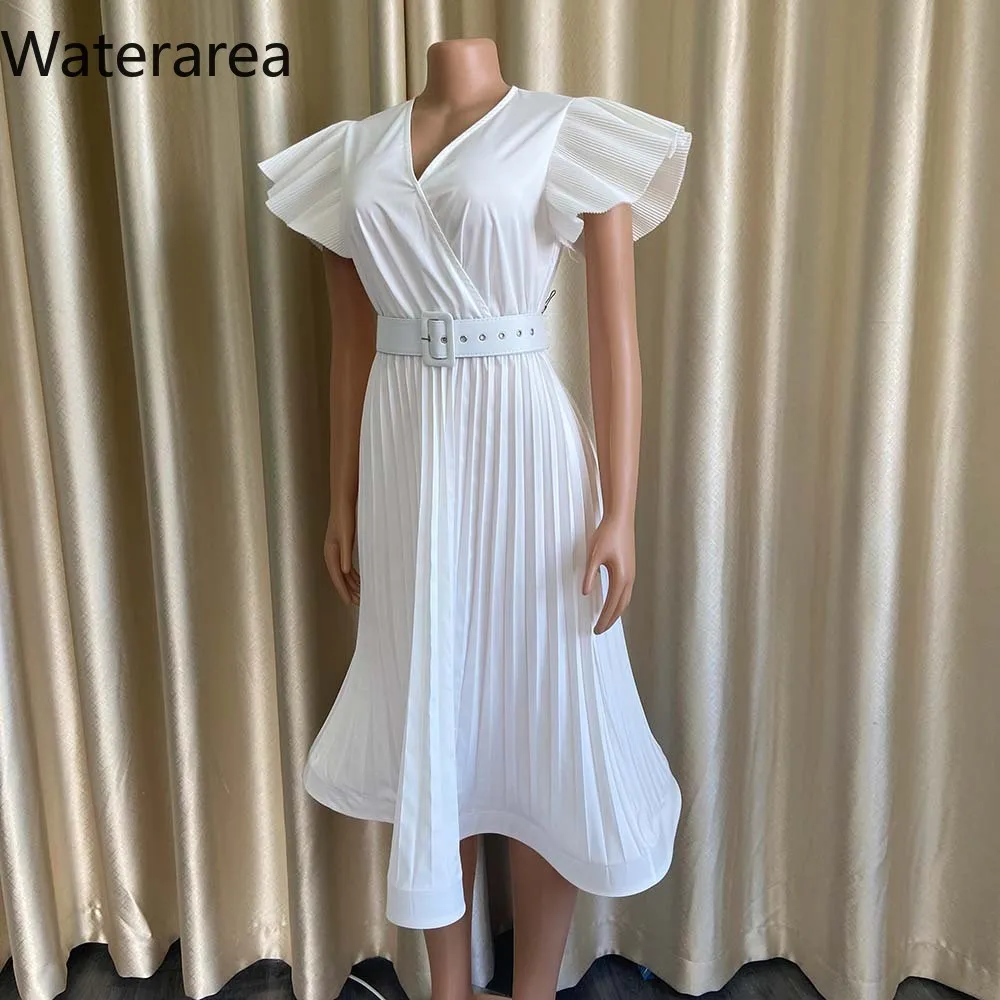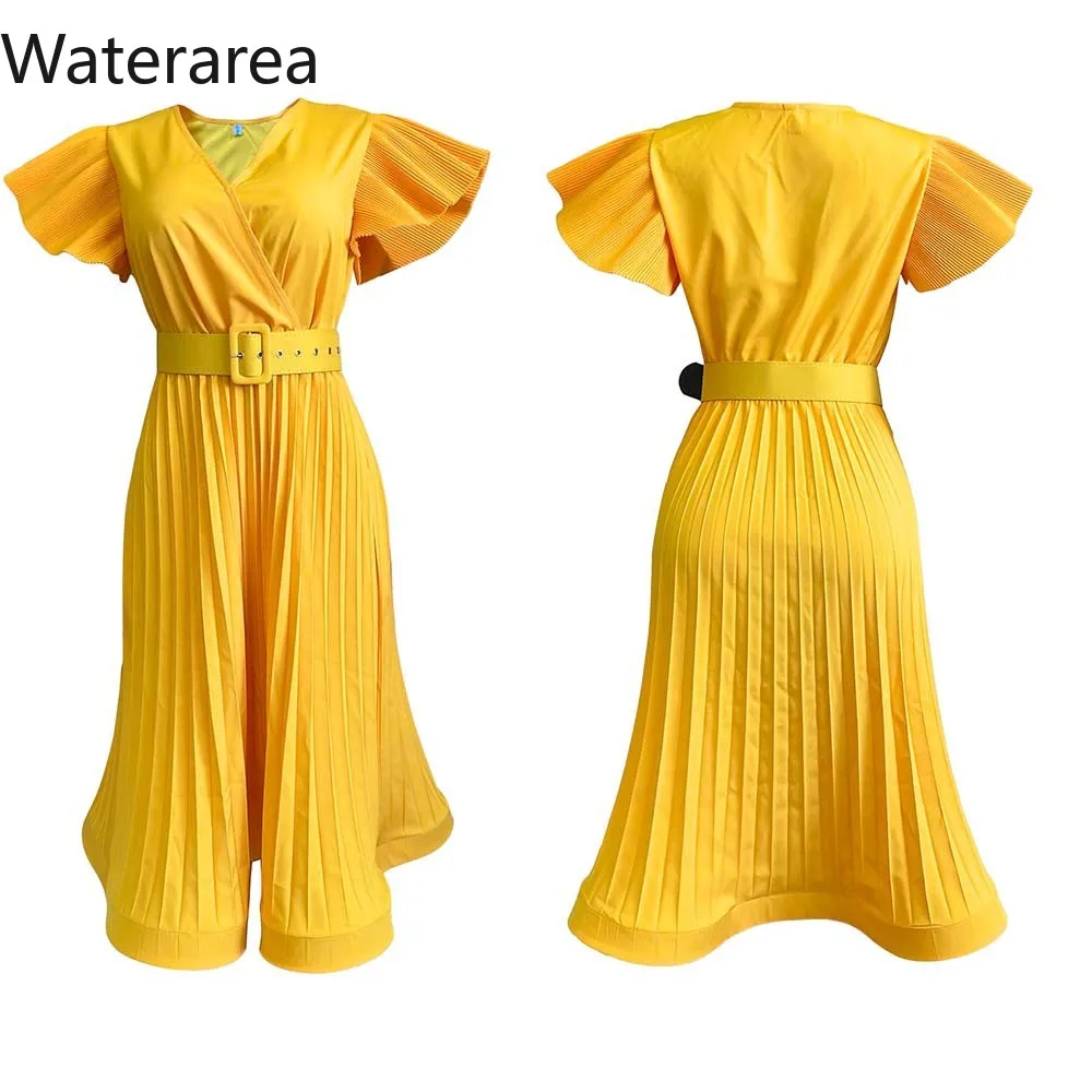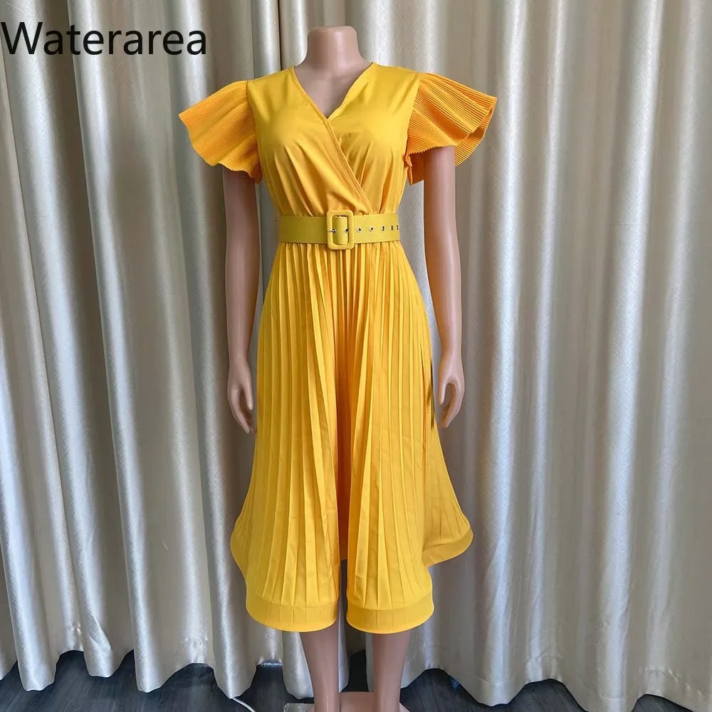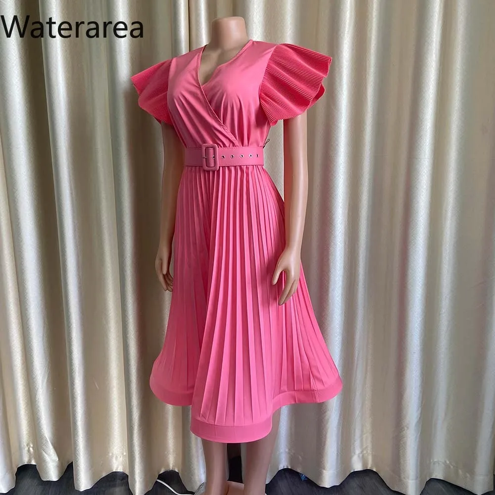 Waterarea New Summer V-Neck Flying Sleeves Dresses Casaul High Waist Belt Pleated Dress Sweet Fashion A-line Loose Dress Women