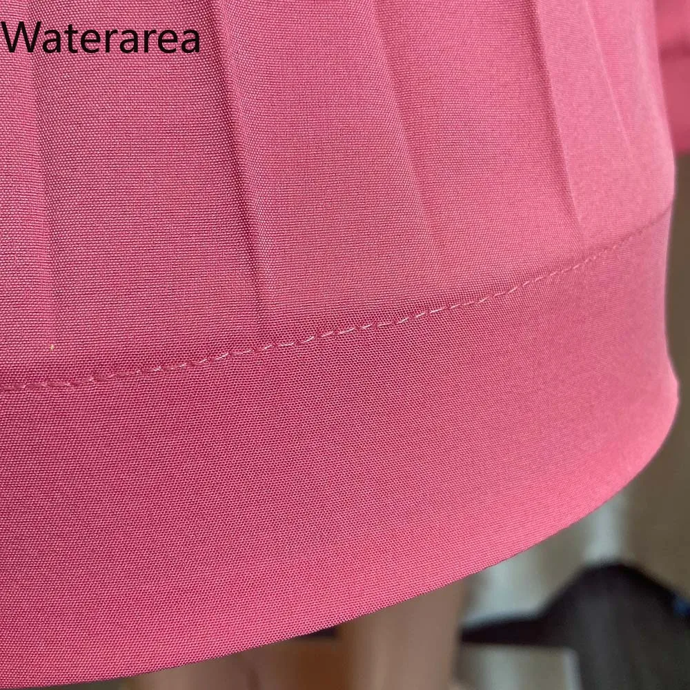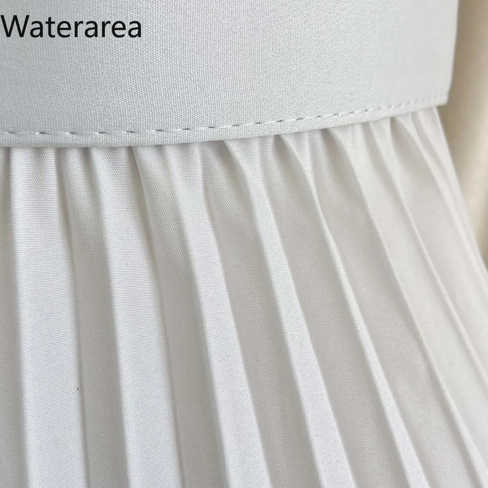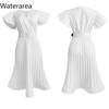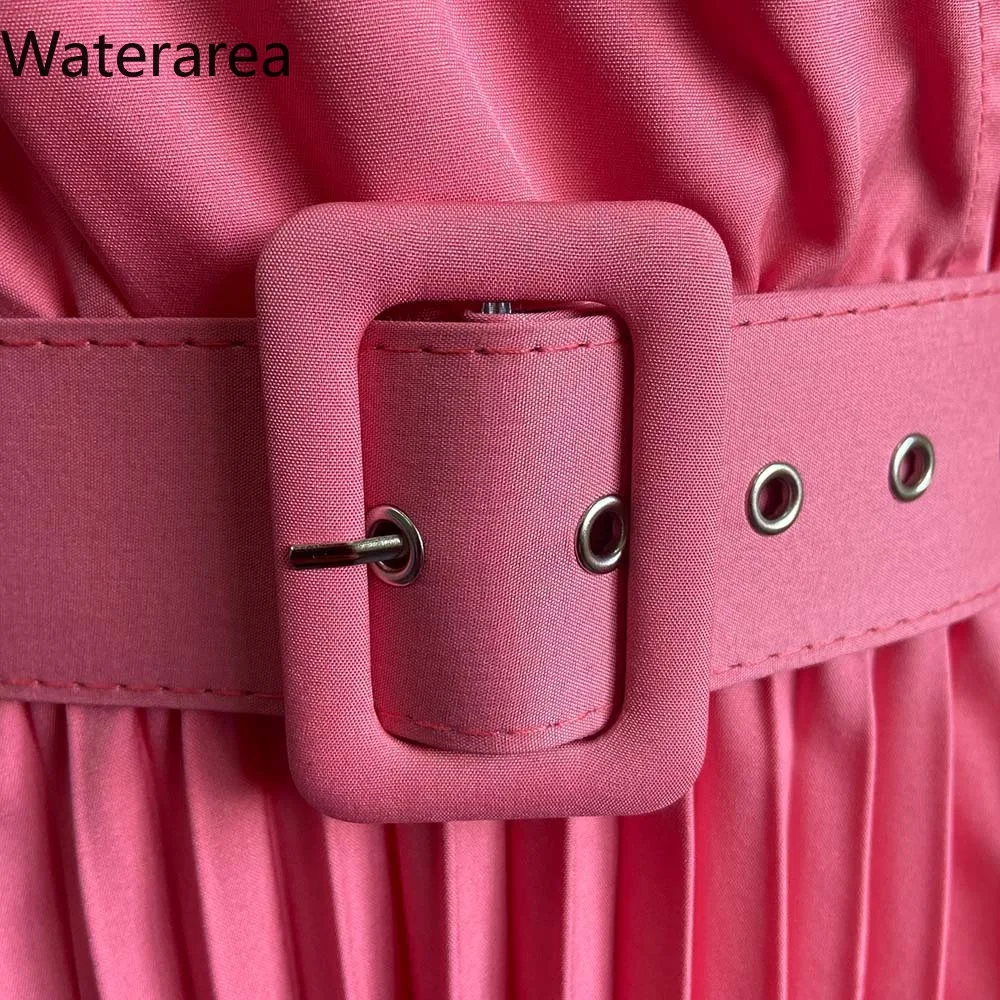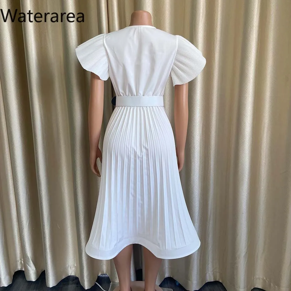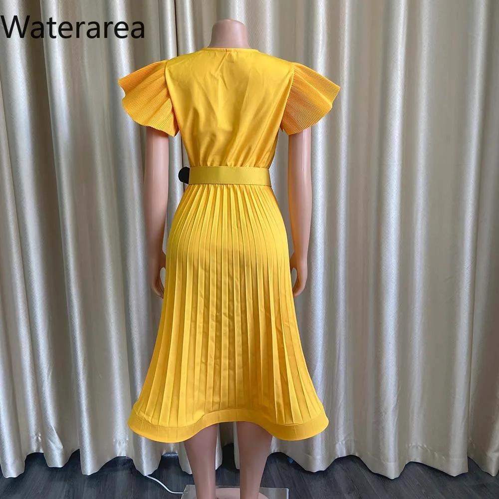 Waterarea New Summer V-Neck Flying Sleeves Dresses Casaul High Waist Belt Pleated Dress Sweet Fashion A-line Loose Dress Women