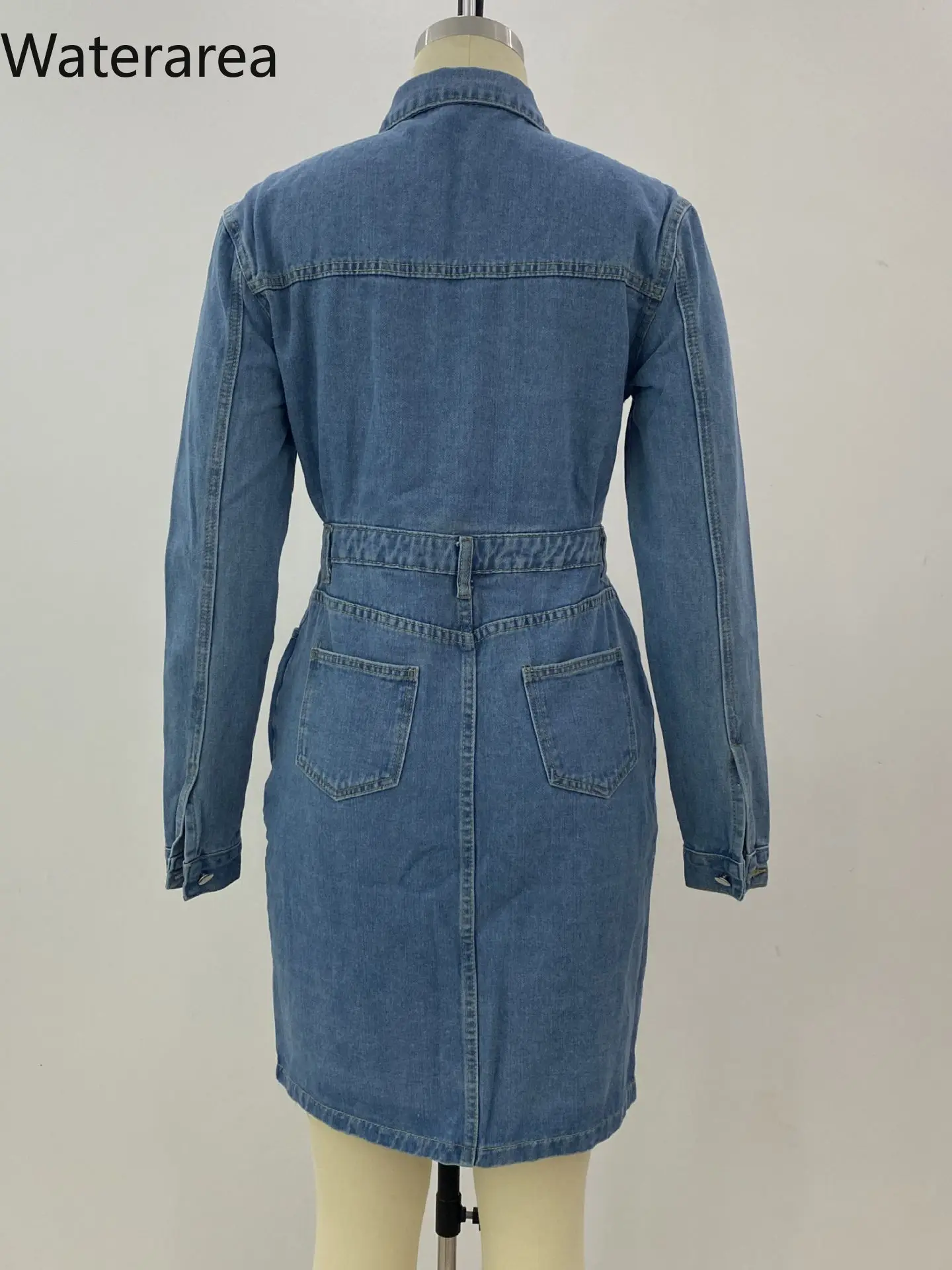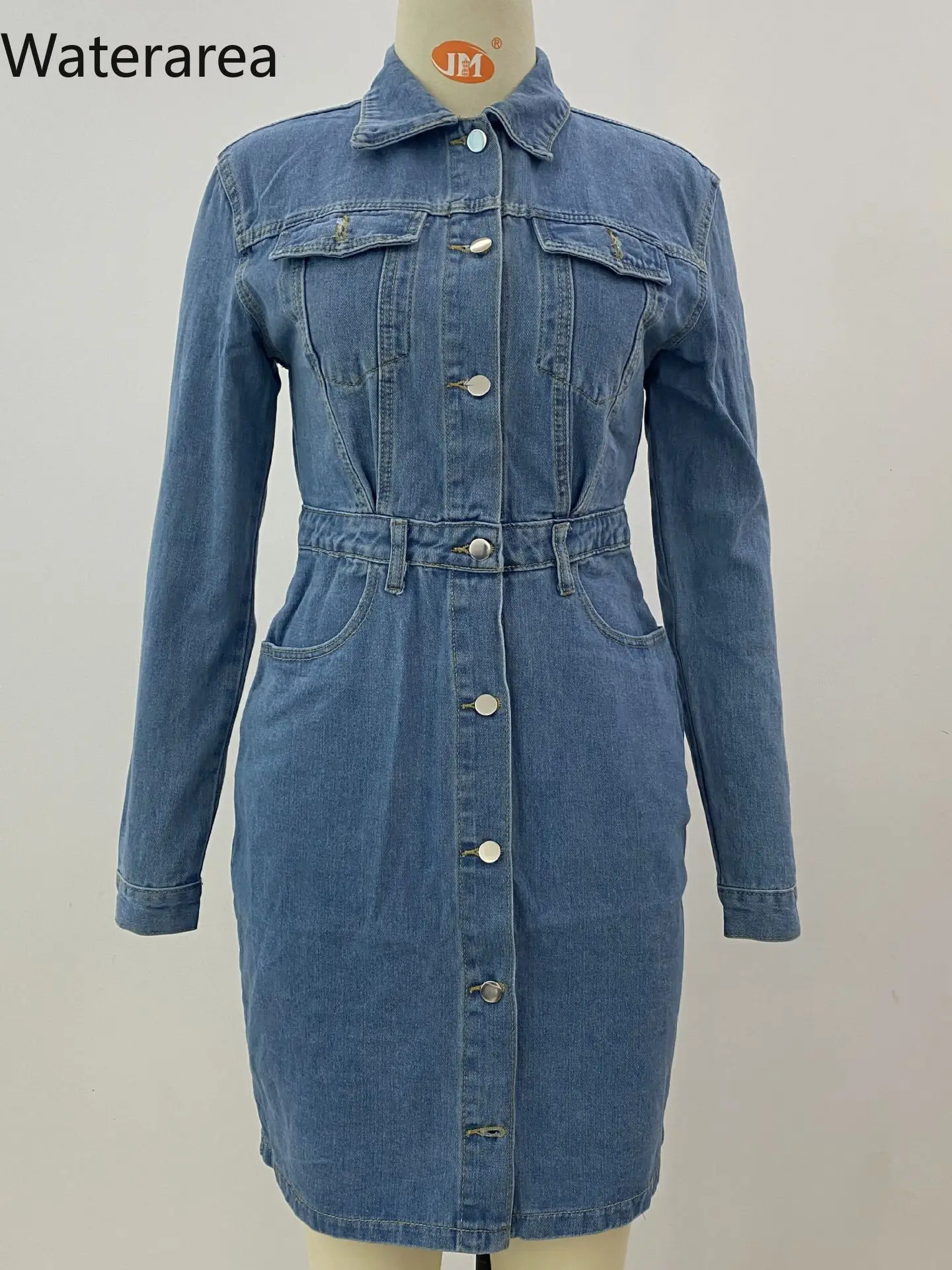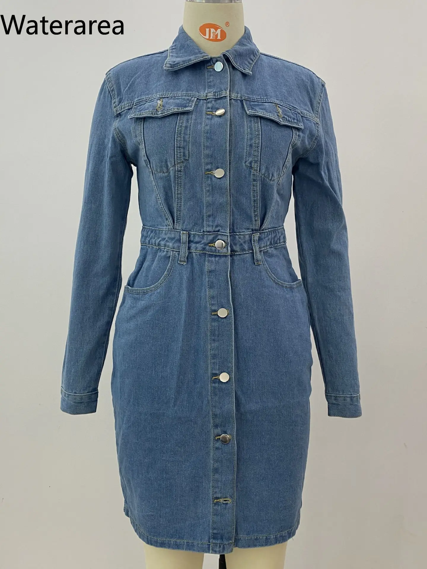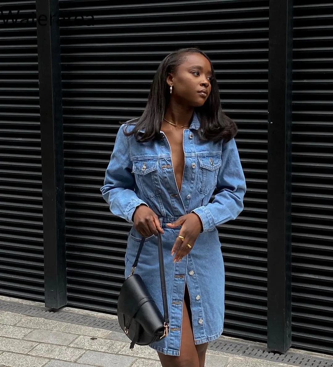 Waterarea Retro INS Women's Dresses Fashion Sexy Sleeves Denim Pencil Dress High Stree Single Breated Denim Windbreaker Coat