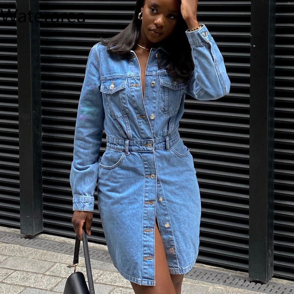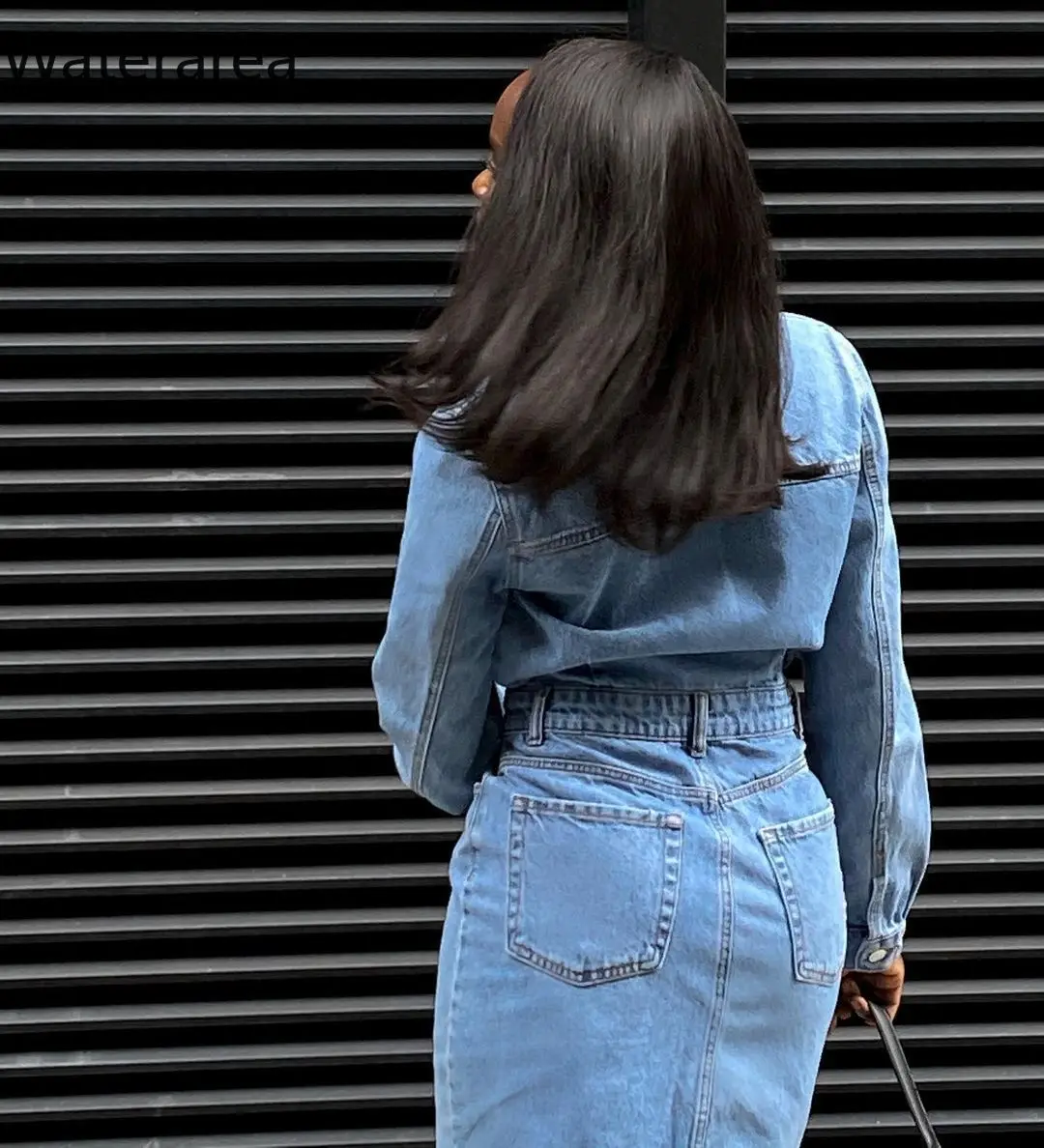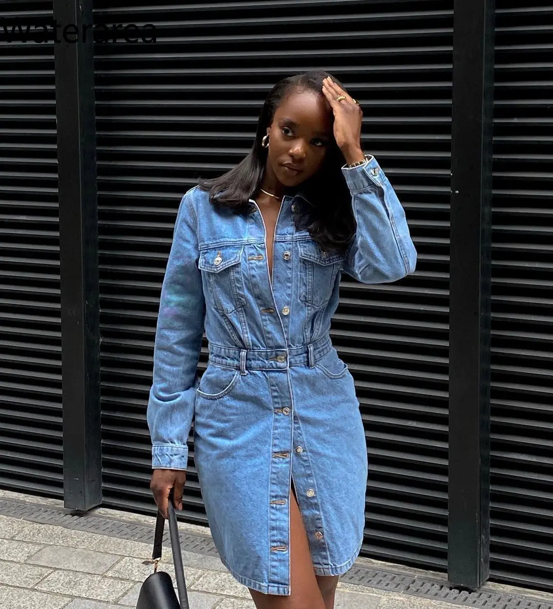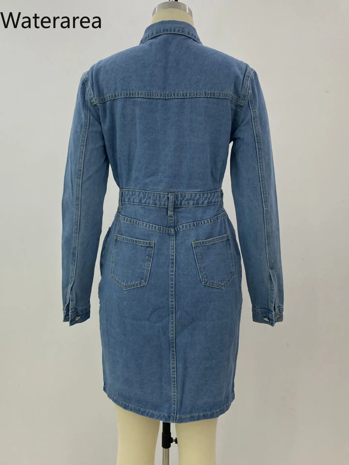 Waterarea Retro INS Women's Dresses Fashion Sexy Sleeves Denim Pencil Dress High Stree Single Breated Denim Windbreaker Coat