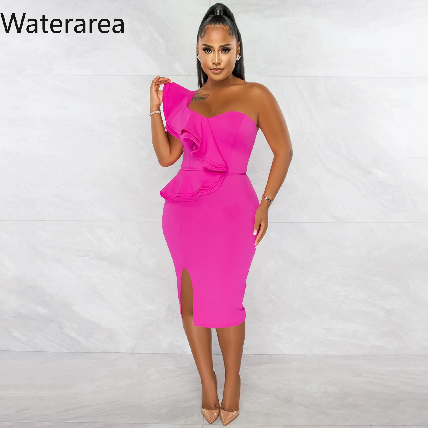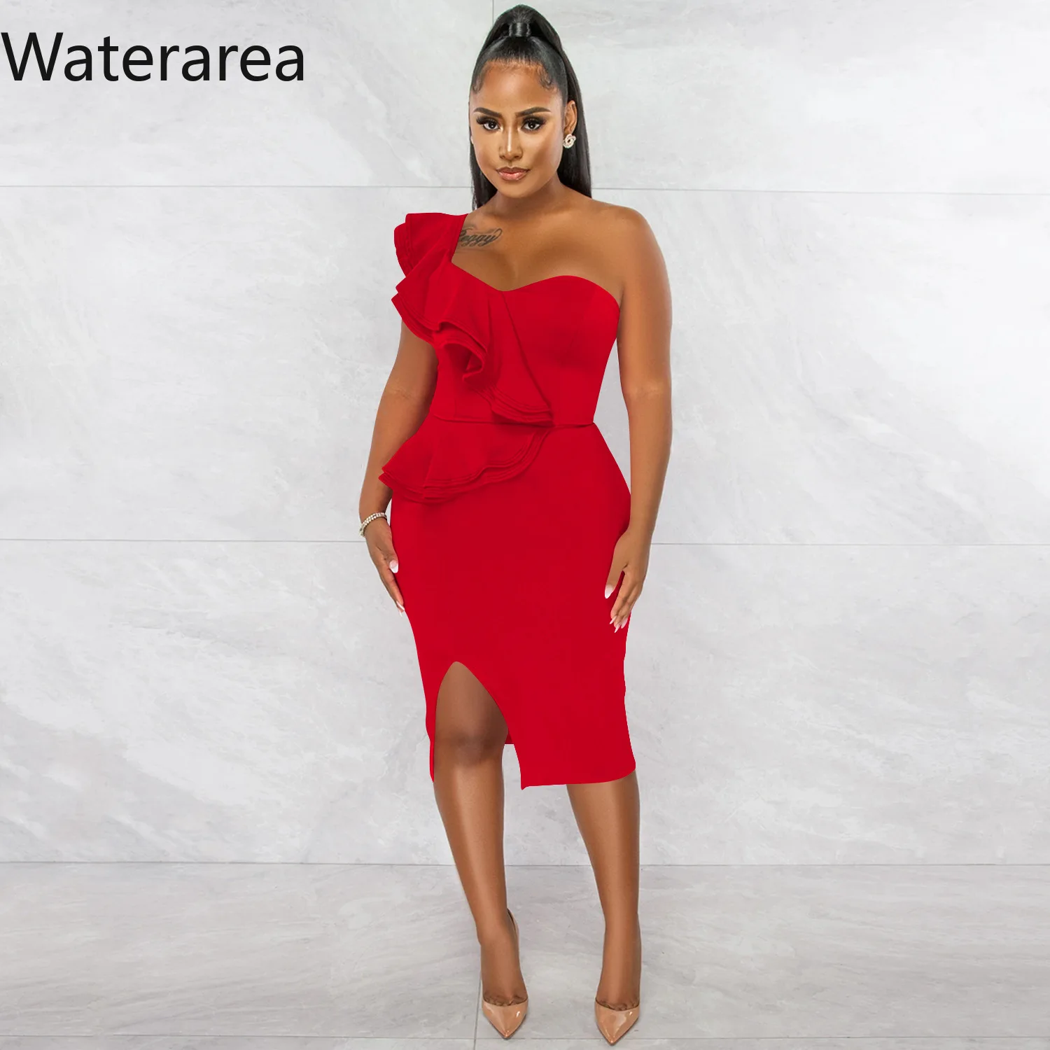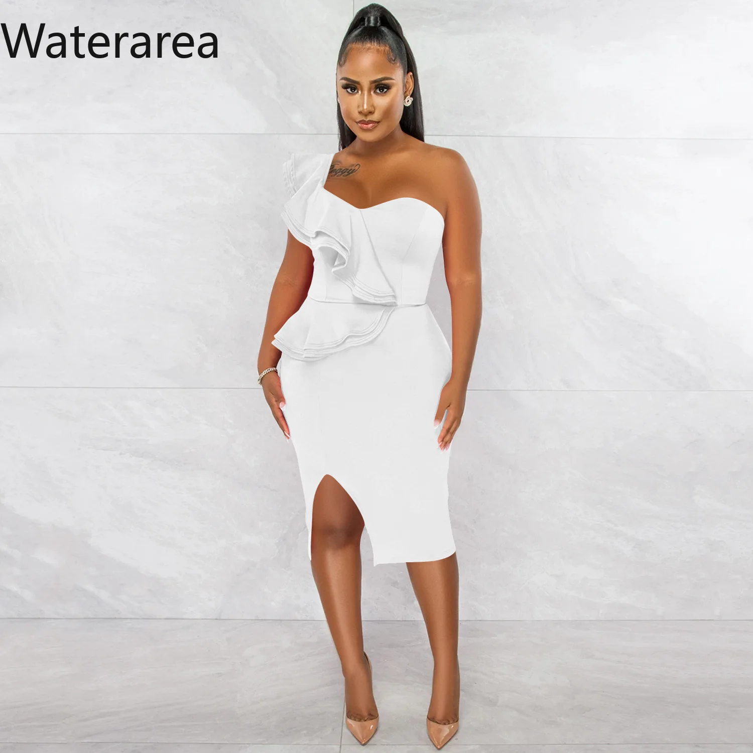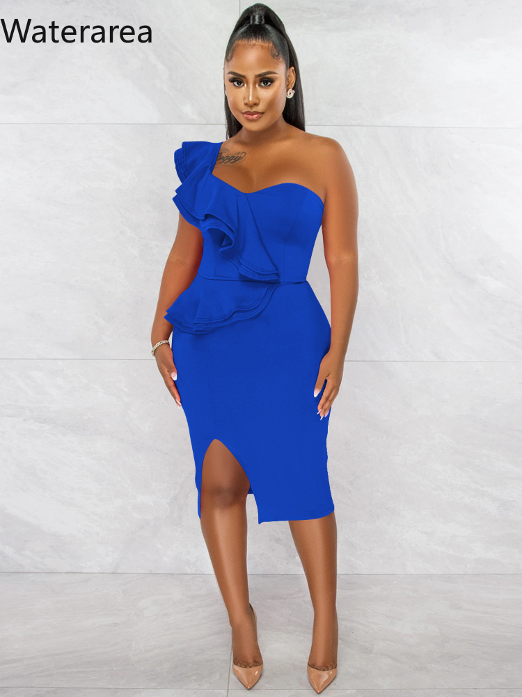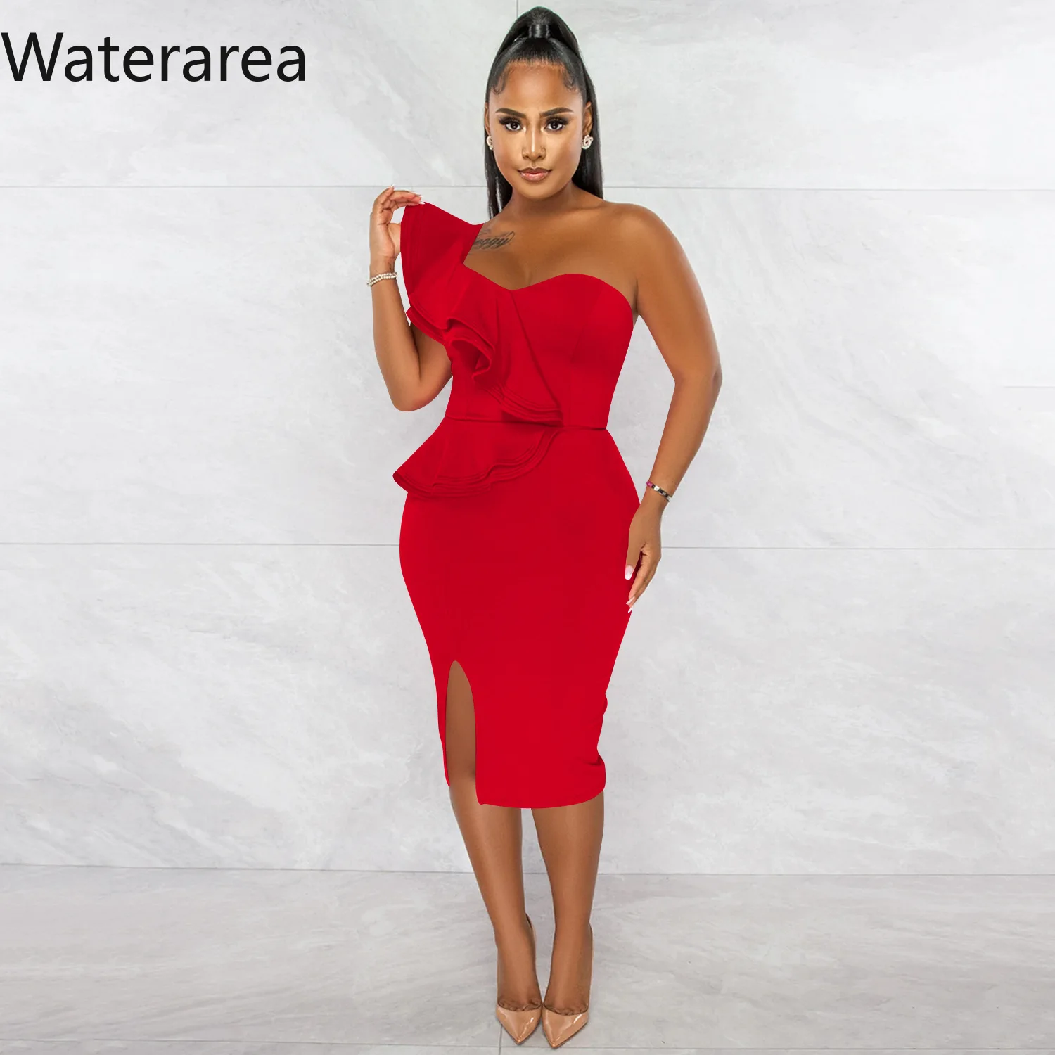 Waterarea Solid Women's Dresses Fashion Ruffles Sexy Inclined Shoulder Midi Dress Split Pencil Dress Elegant Evening Party Dress