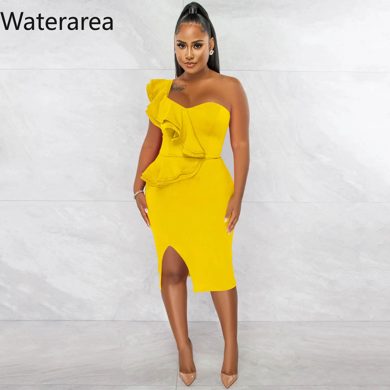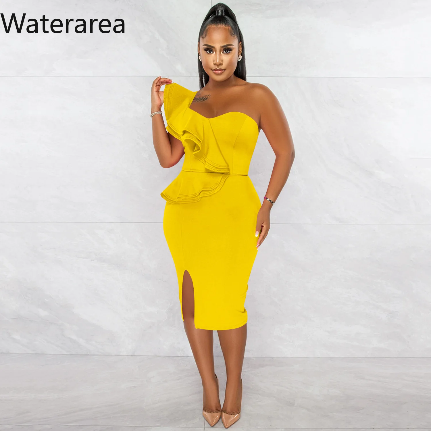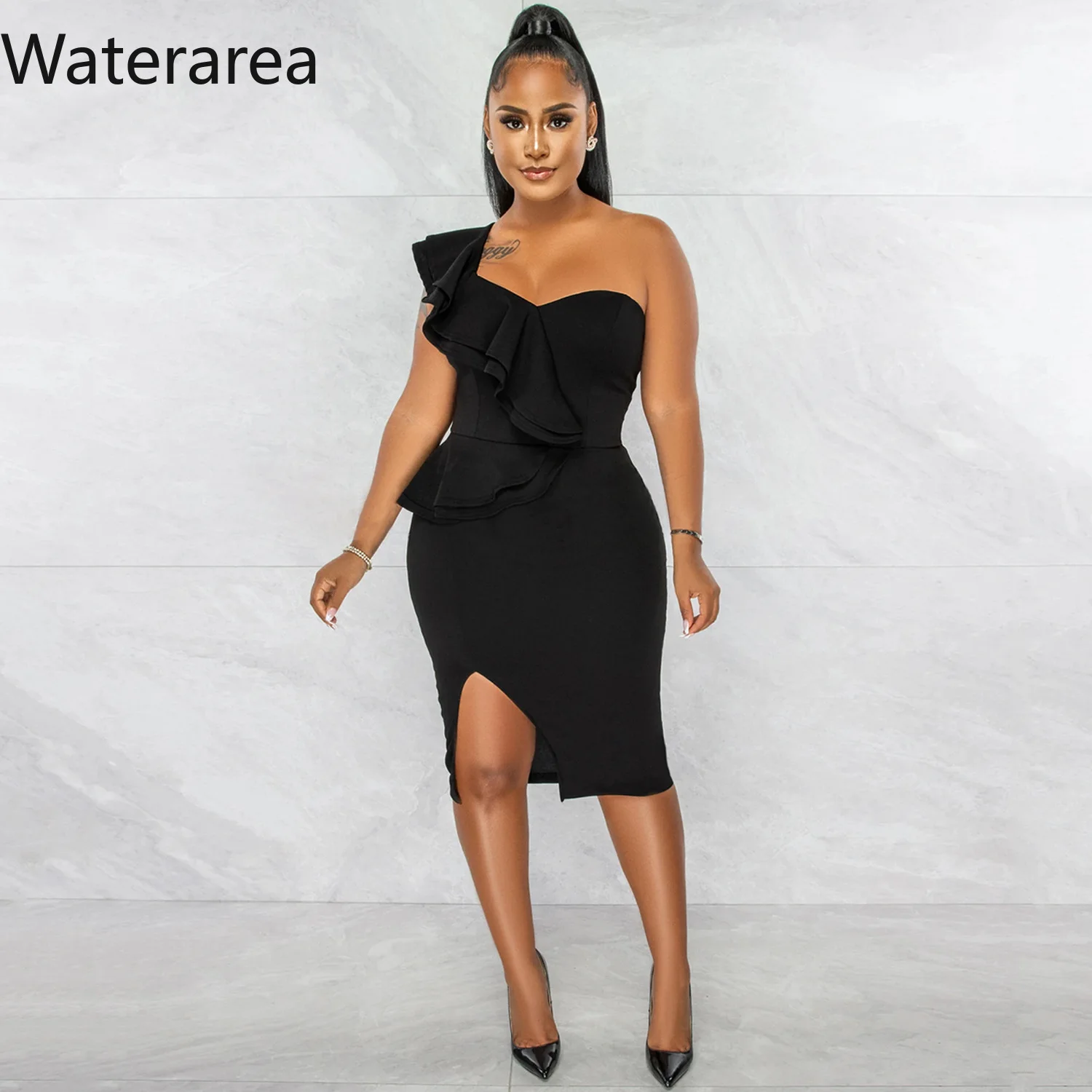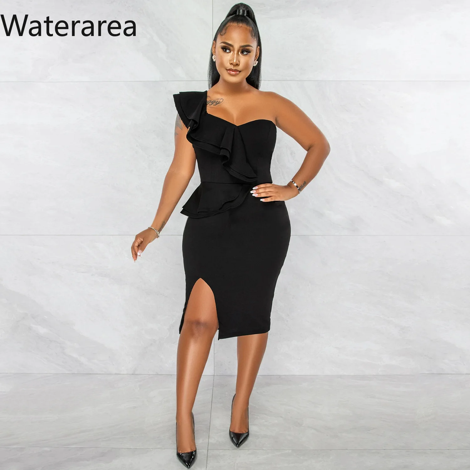 Waterarea Solid Women's Dresses Fashion Ruffles Sexy Inclined Shoulder Midi Dress Split Pencil Dress Elegant Evening Party Dress