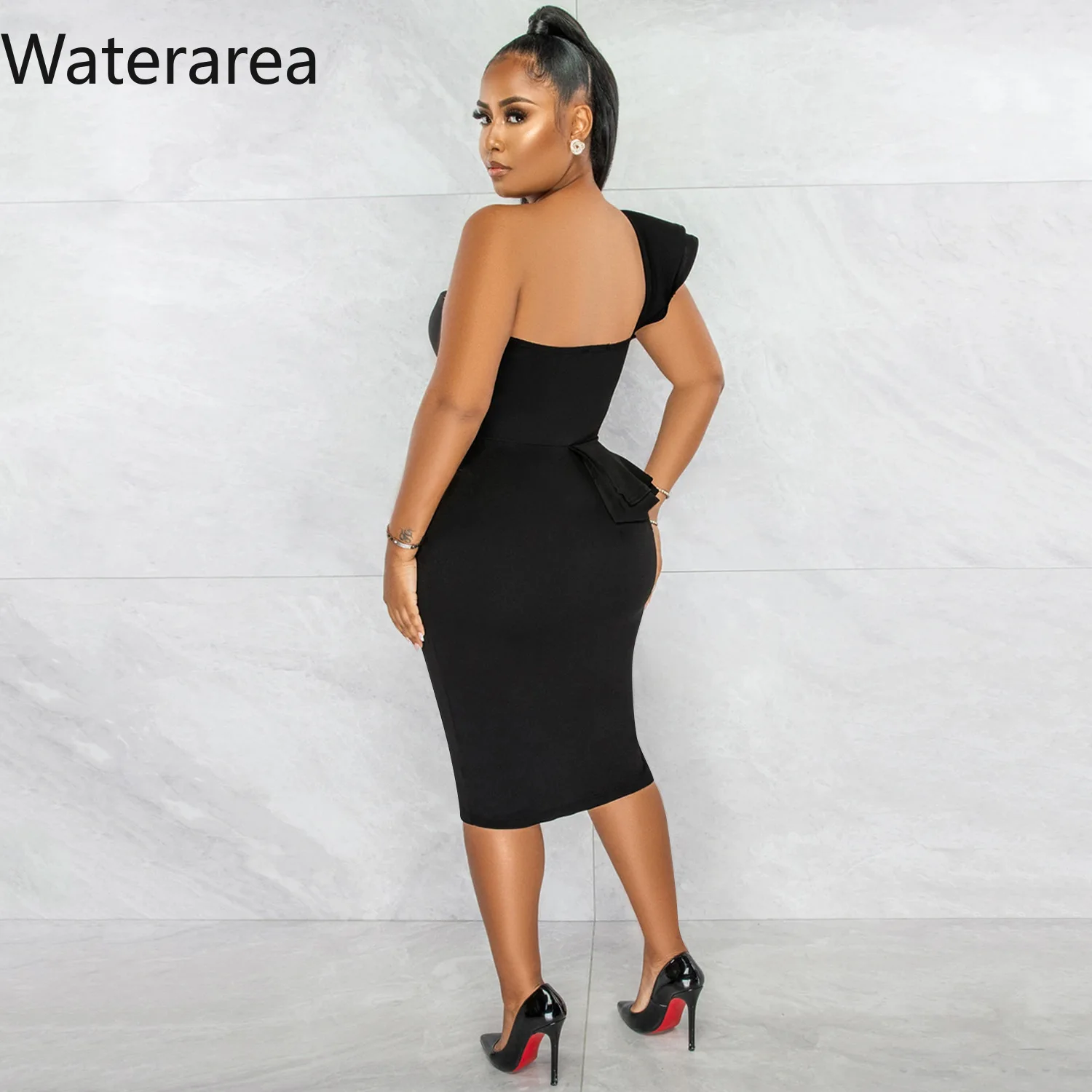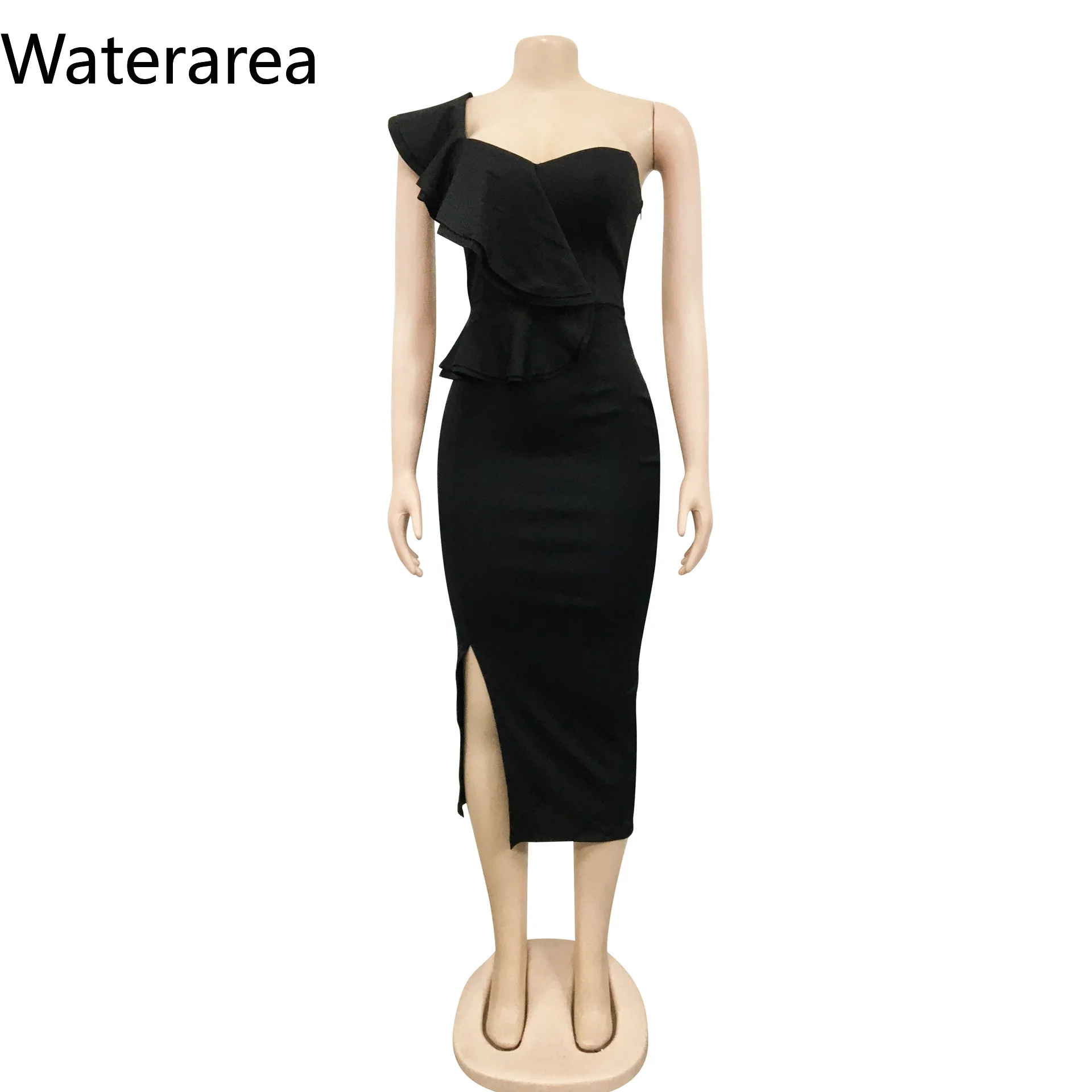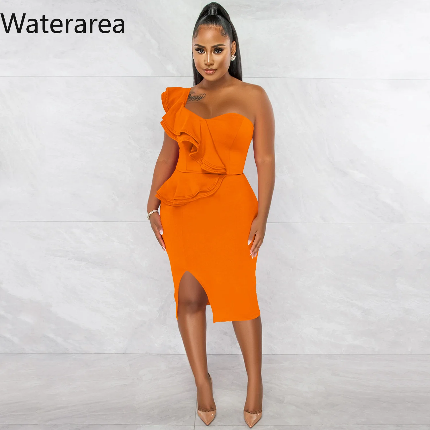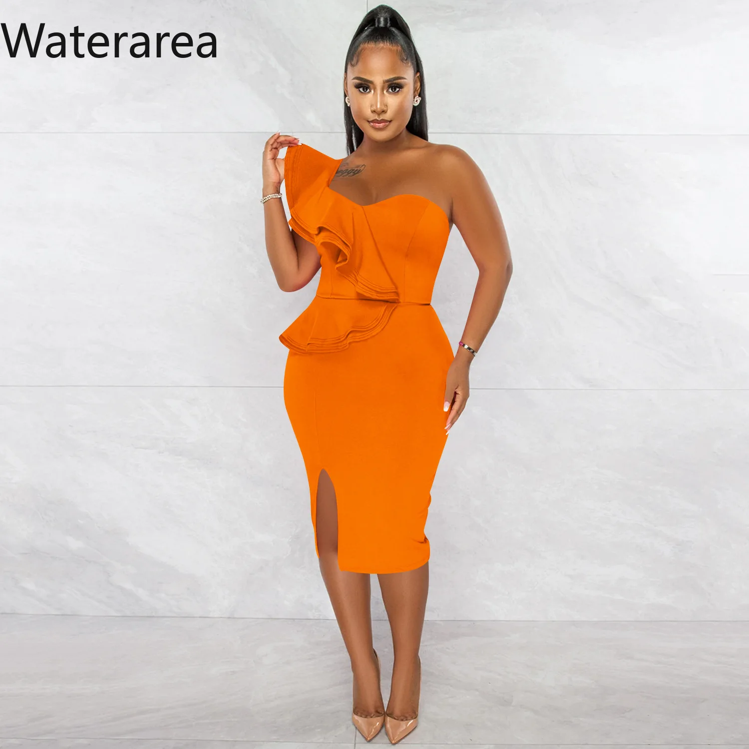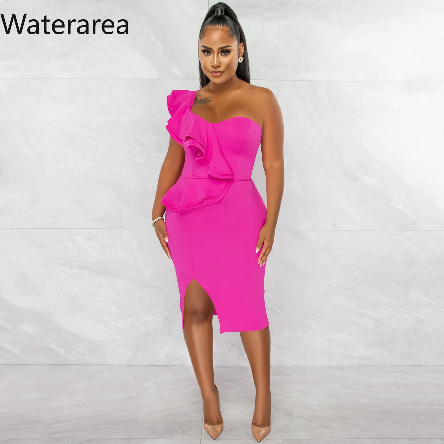 Waterarea Solid Women's Dresses Fashion Ruffles Sexy Inclined Shoulder Midi Dress Split Pencil Dress Elegant Evening Party Dress