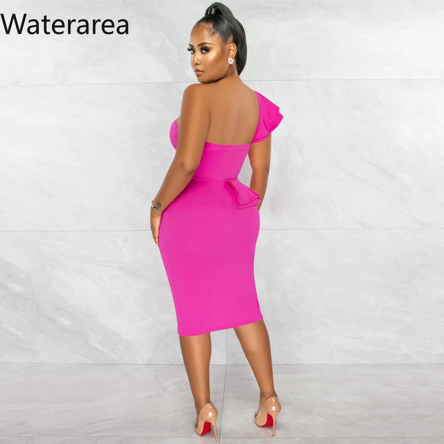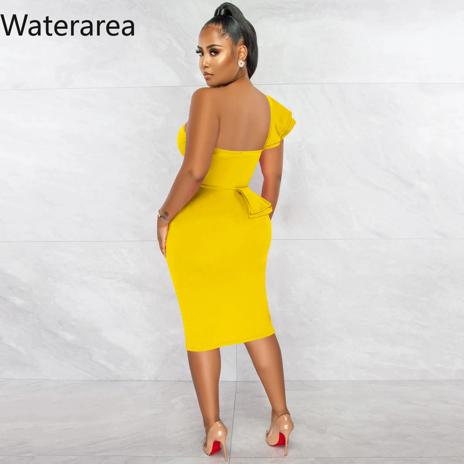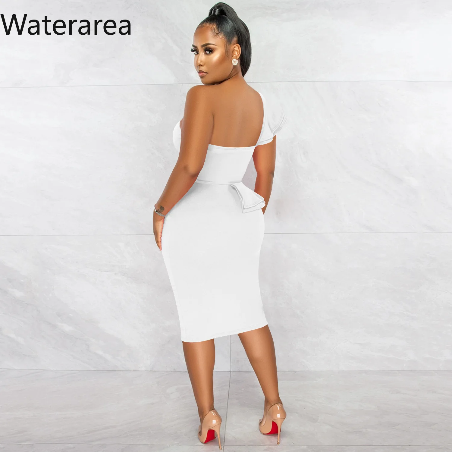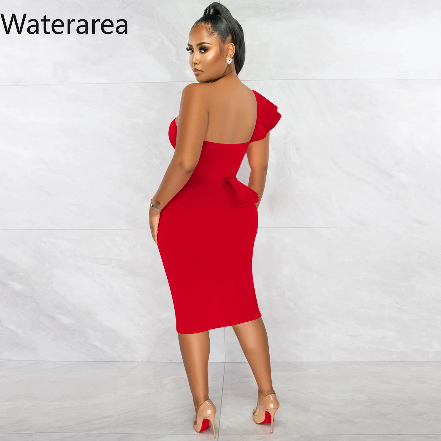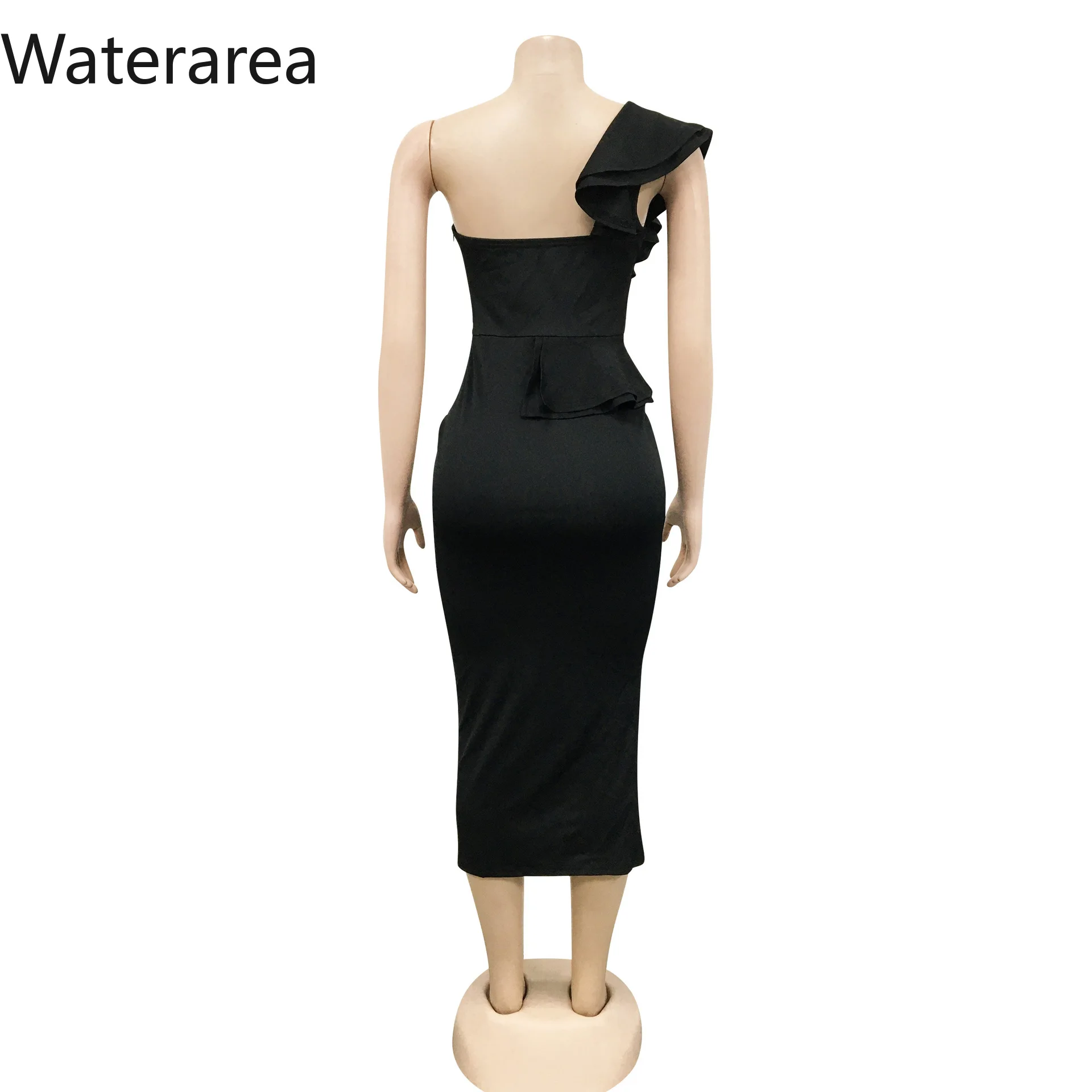 Waterarea Solid Women's Dresses Fashion Ruffles Sexy Inclined Shoulder Midi Dress Split Pencil Dress Elegant Evening Party Dress