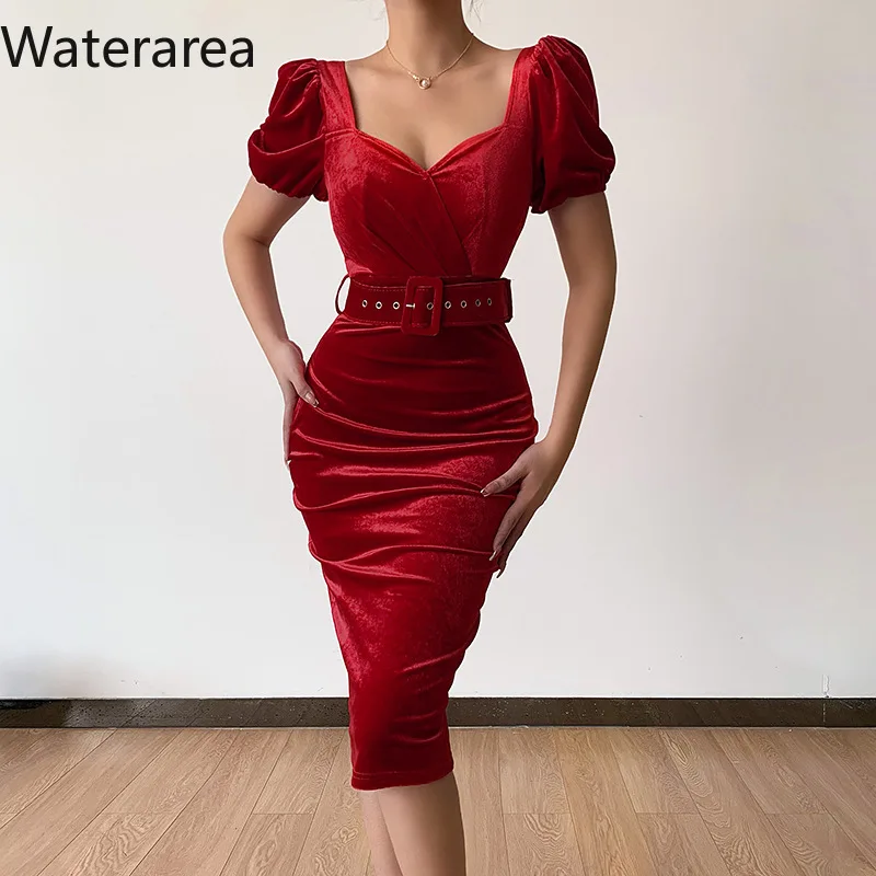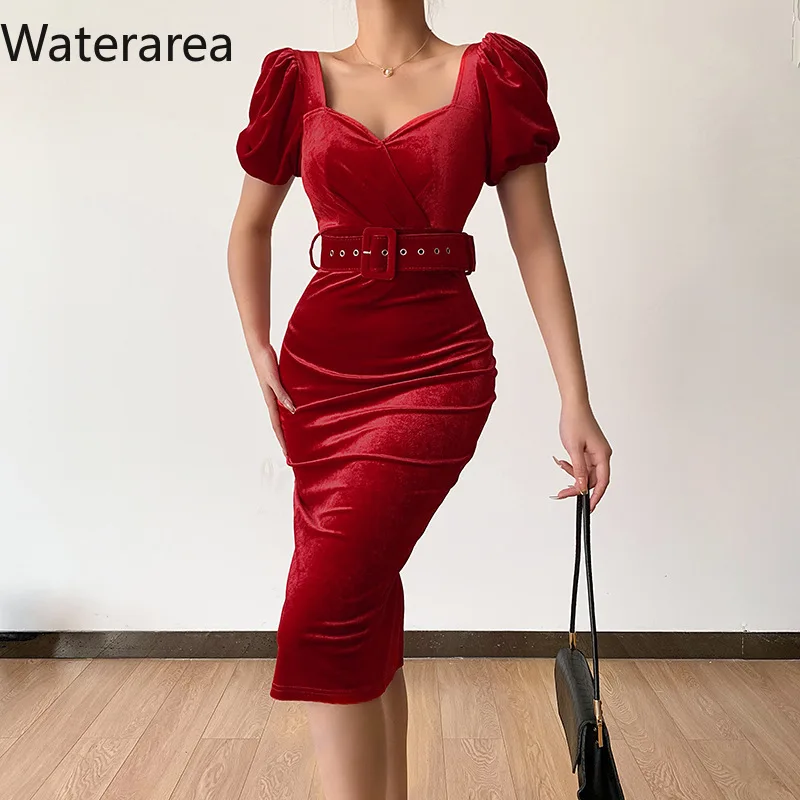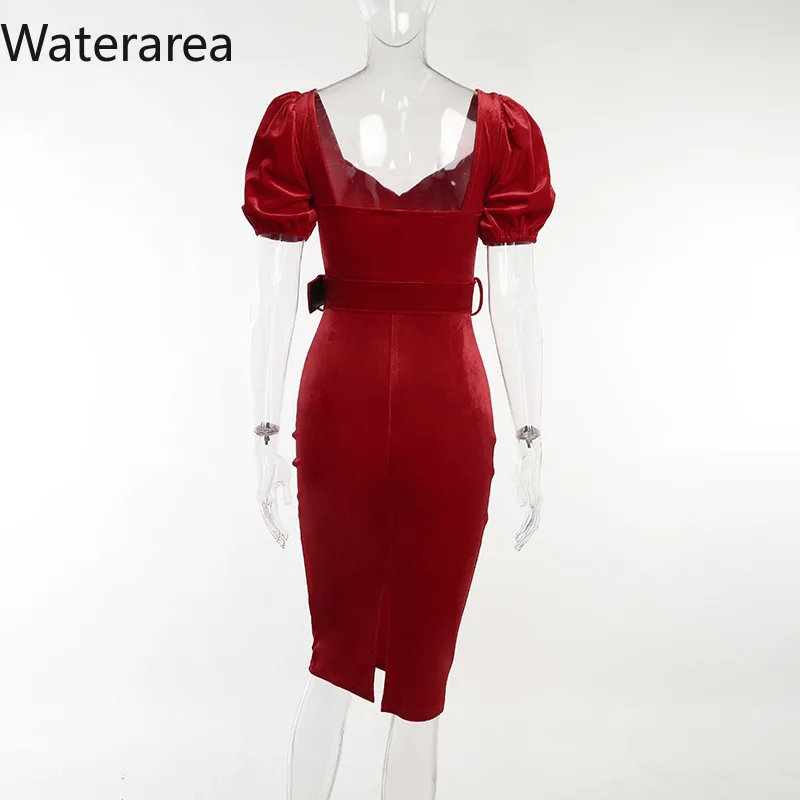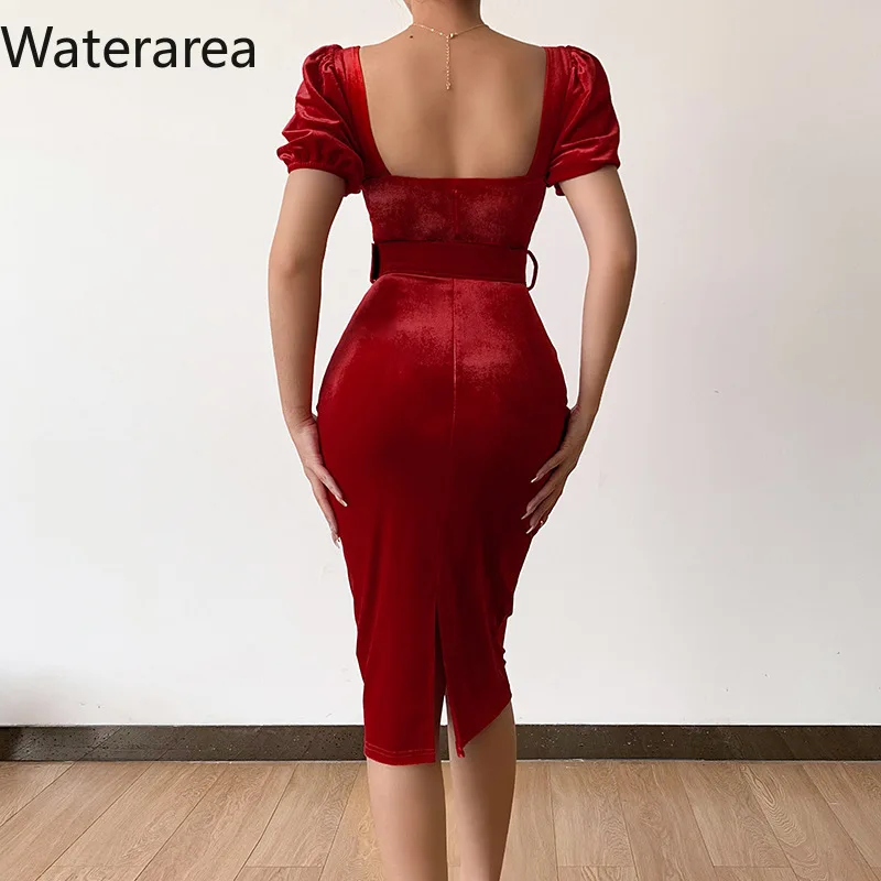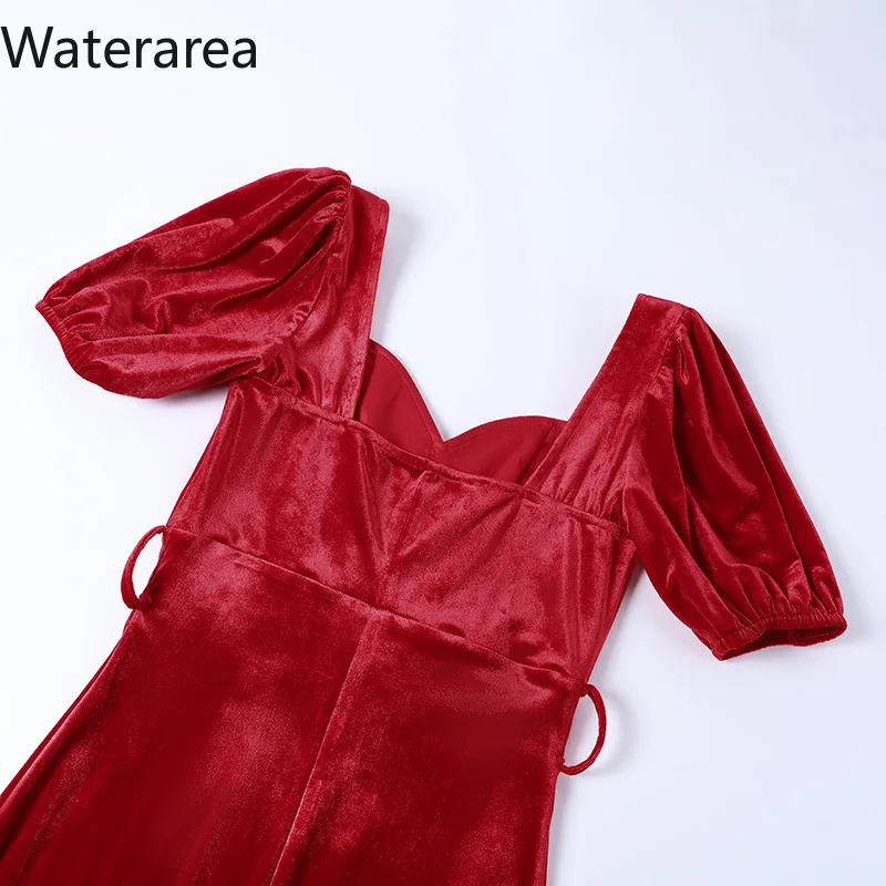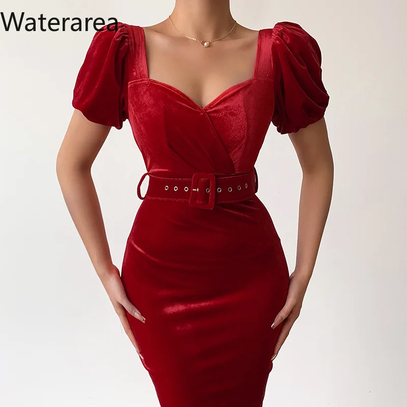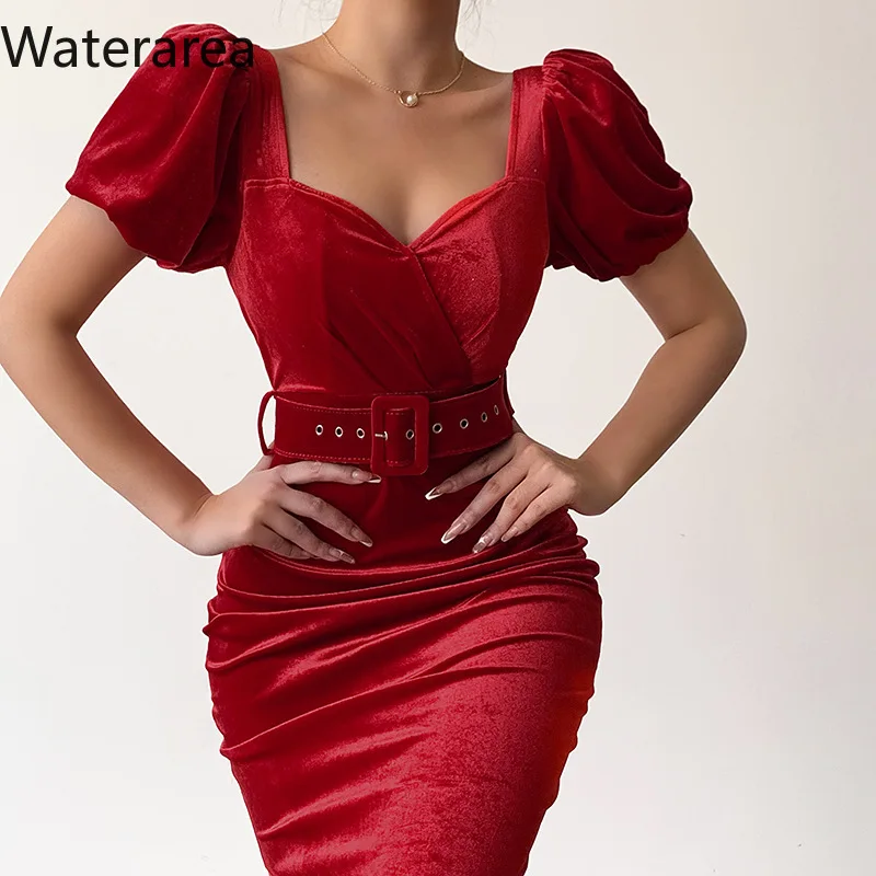 Waterarea Velvet Women Dress for New Year 2022 Fashion Elegants Sexy Fuff Sleeves Midi Dress Evening Party High Split Vestido