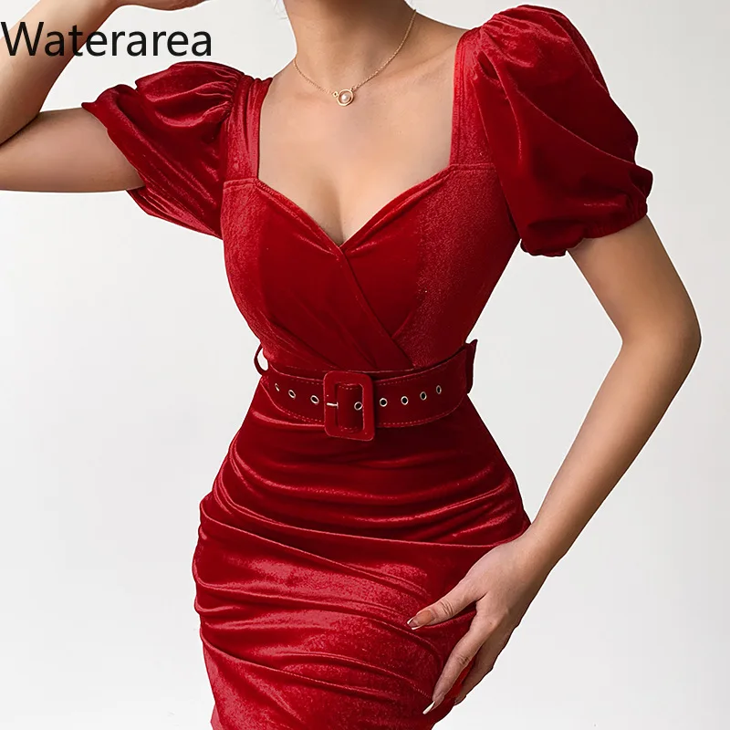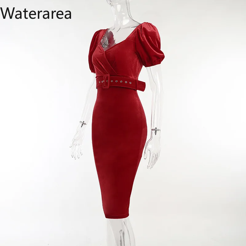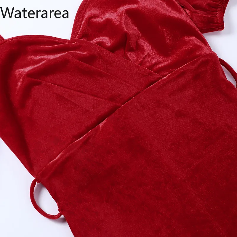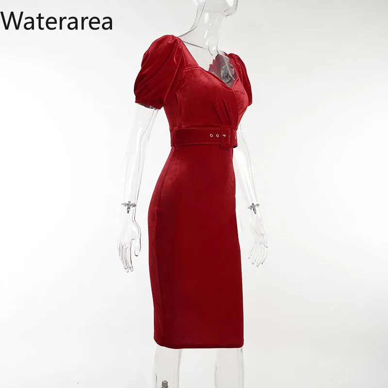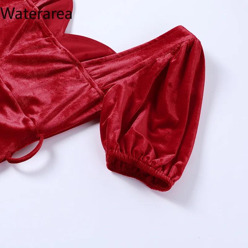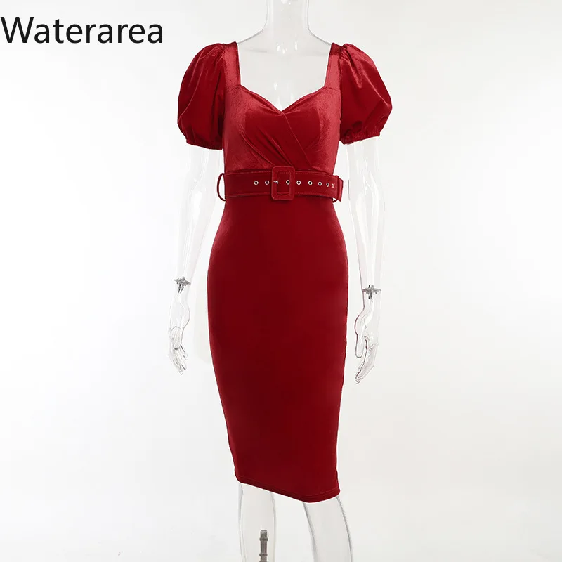 Waterarea Velvet Women Dress for New Year 2022 Fashion Elegants Sexy Fuff Sleeves Midi Dress Evening Party High Split Vestido