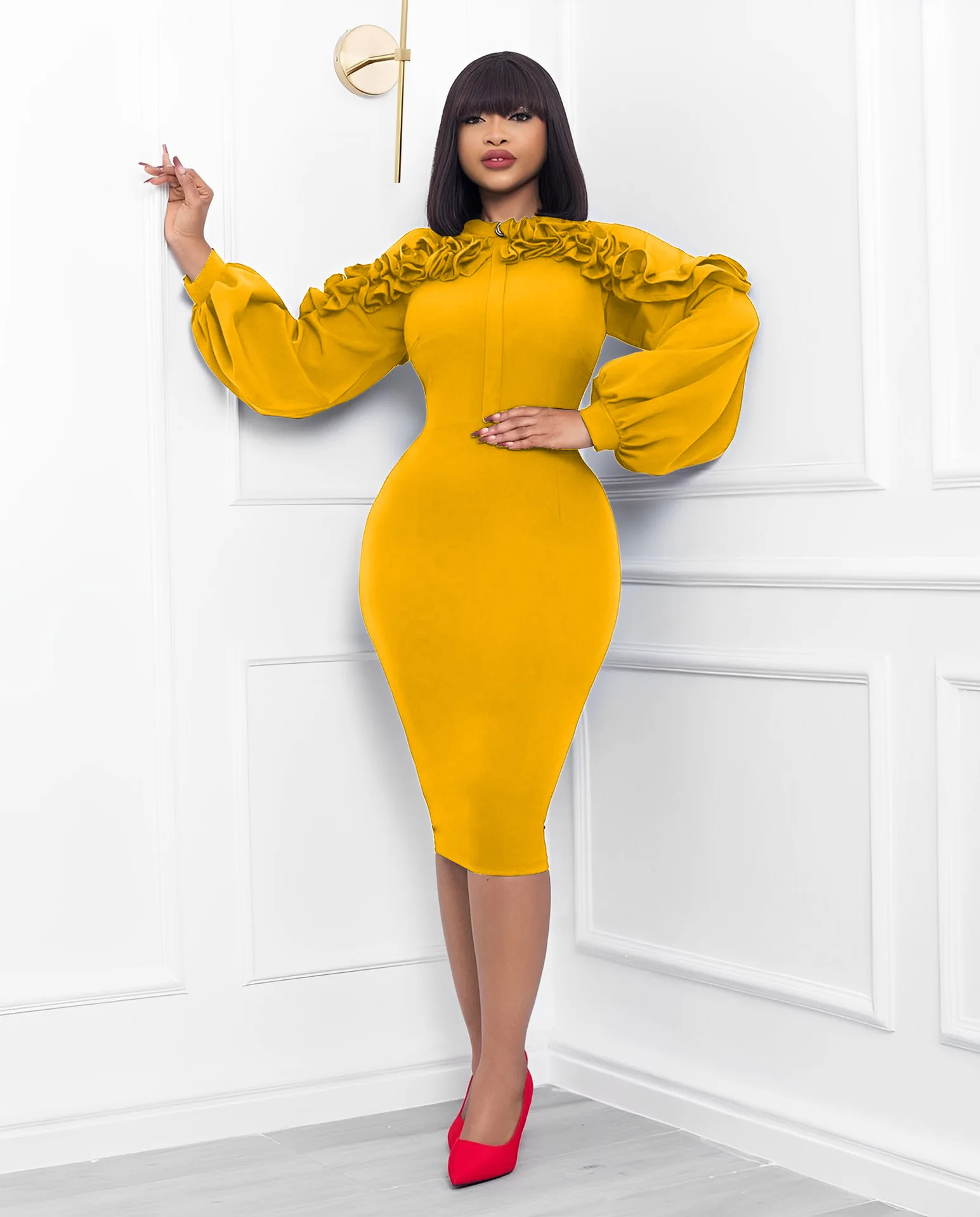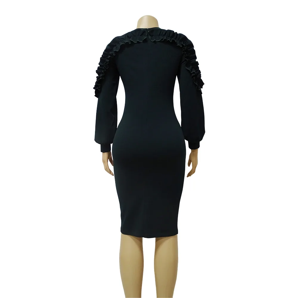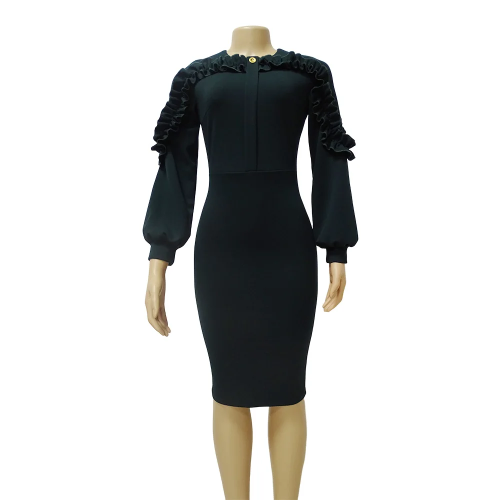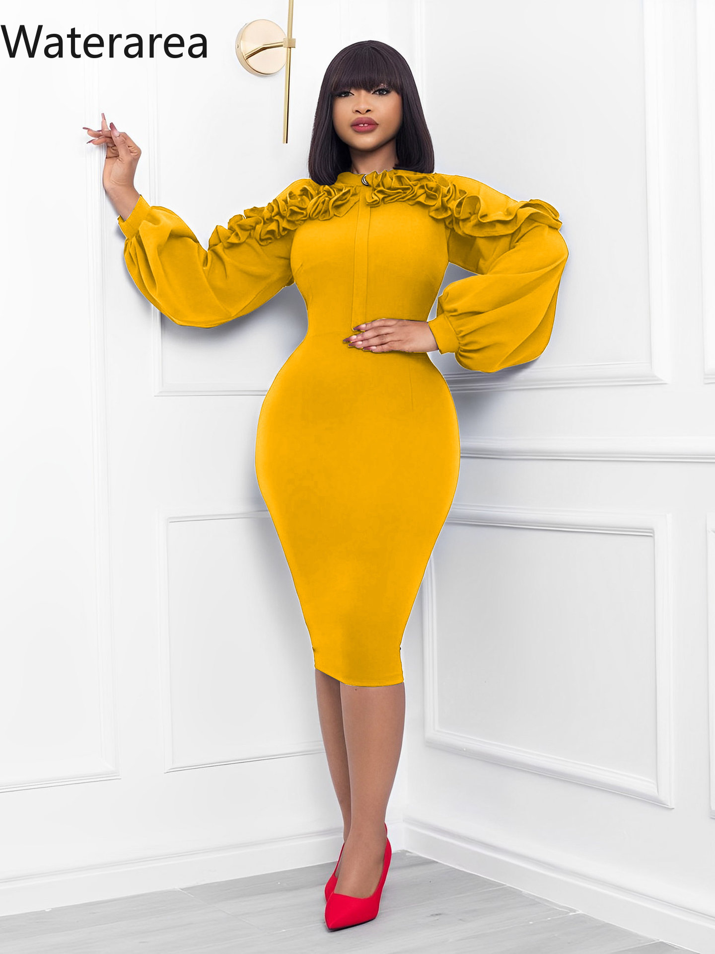 Waterarea Vintage Elegant Lady Office Pencil Dress Long Lantern Sleeve Ruched Slim Bodycon Party Midi Sexy Dresses Vestido