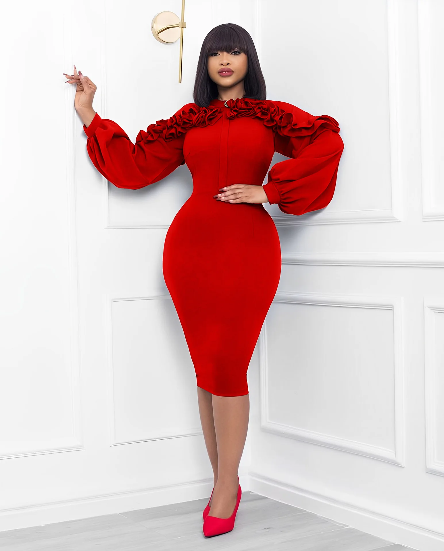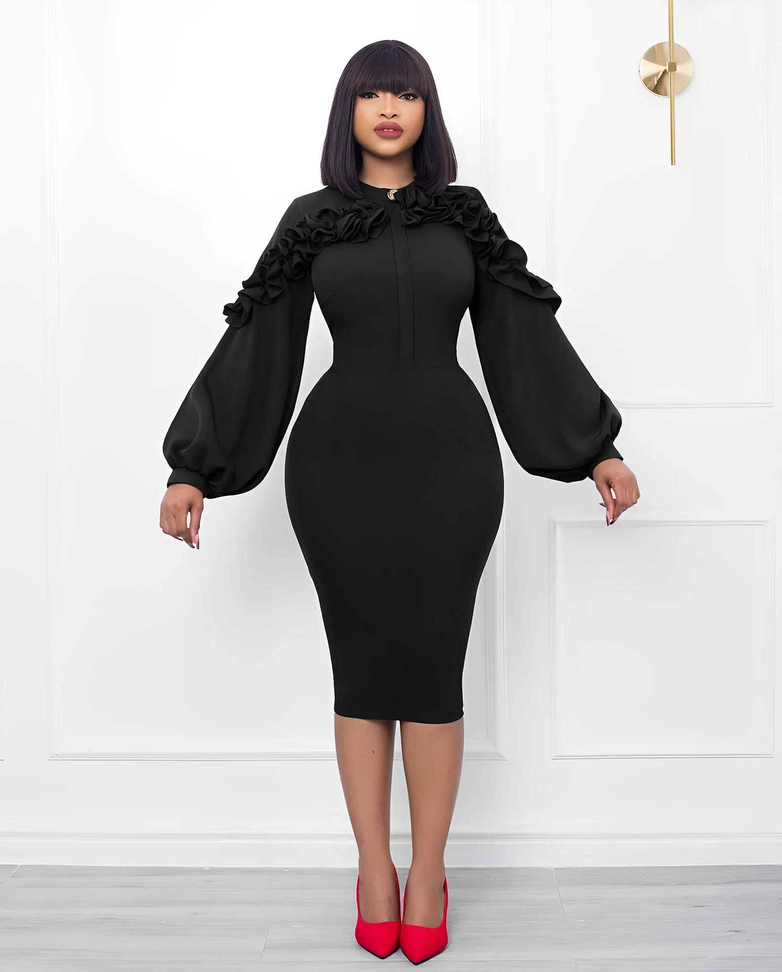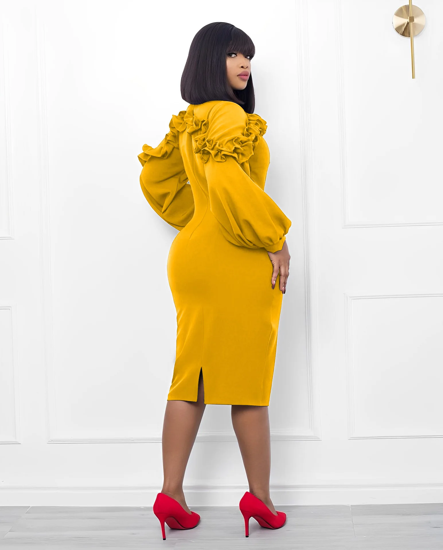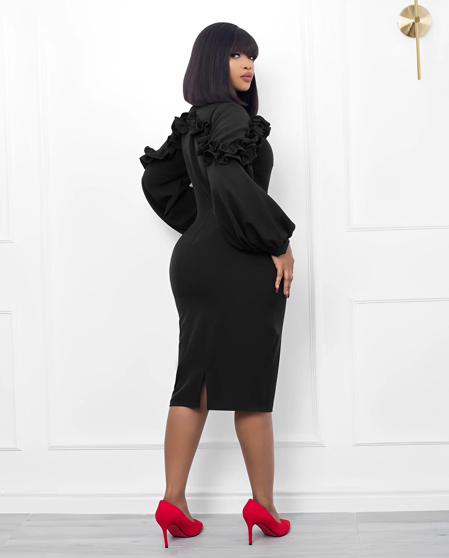 Waterarea Vintage Elegant Lady Office Pencil Dress Long Lantern Sleeve Ruched Slim Bodycon Party Midi Sexy Dresses Vestido