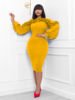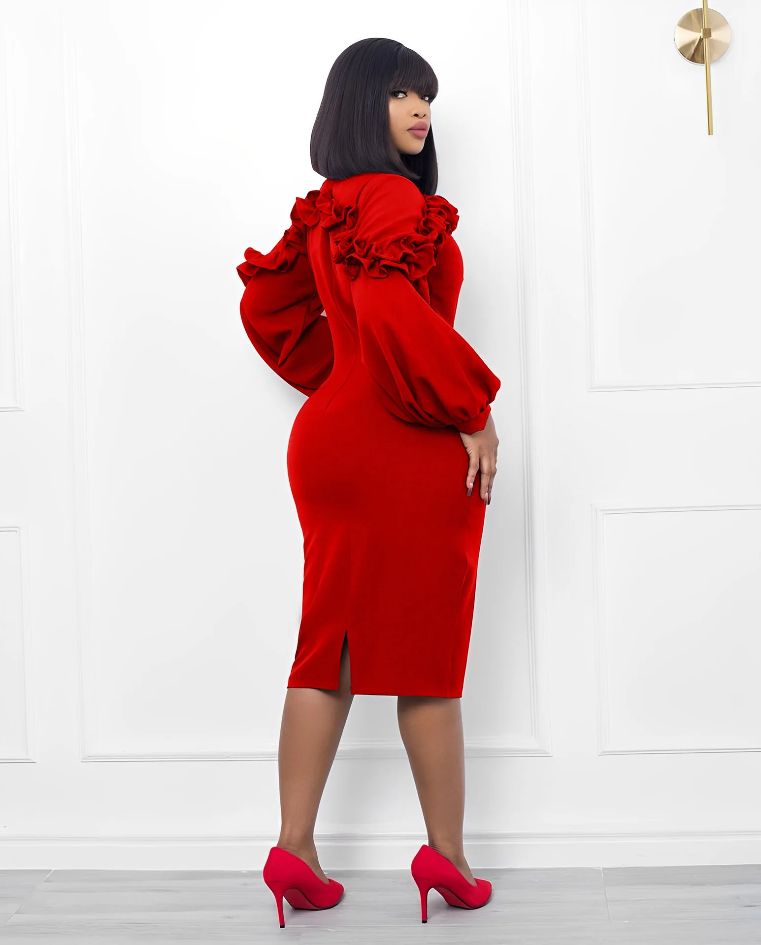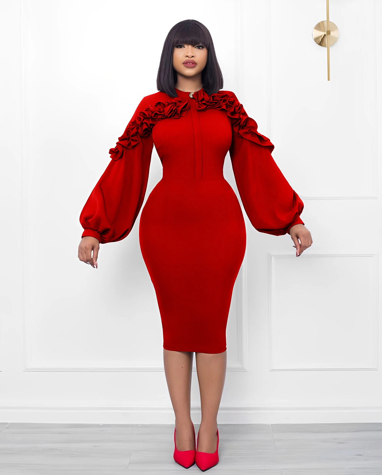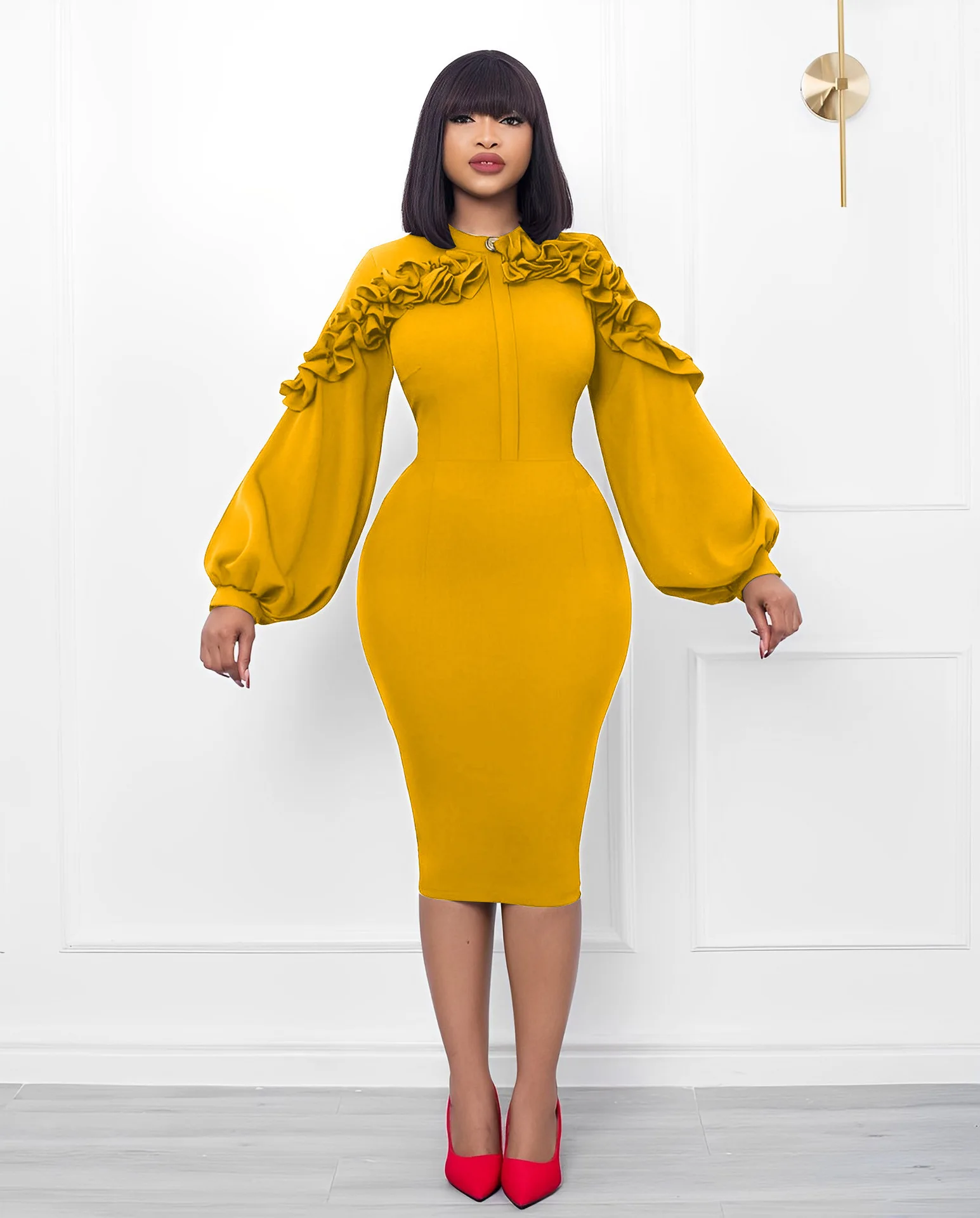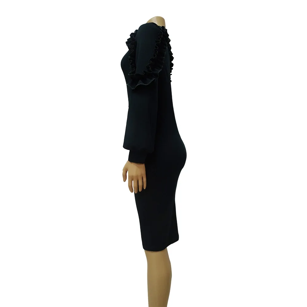 Waterarea Vintage Elegant Lady Office Pencil Dress Long Lantern Sleeve Ruched Slim Bodycon Party Midi Sexy Dresses Vestido