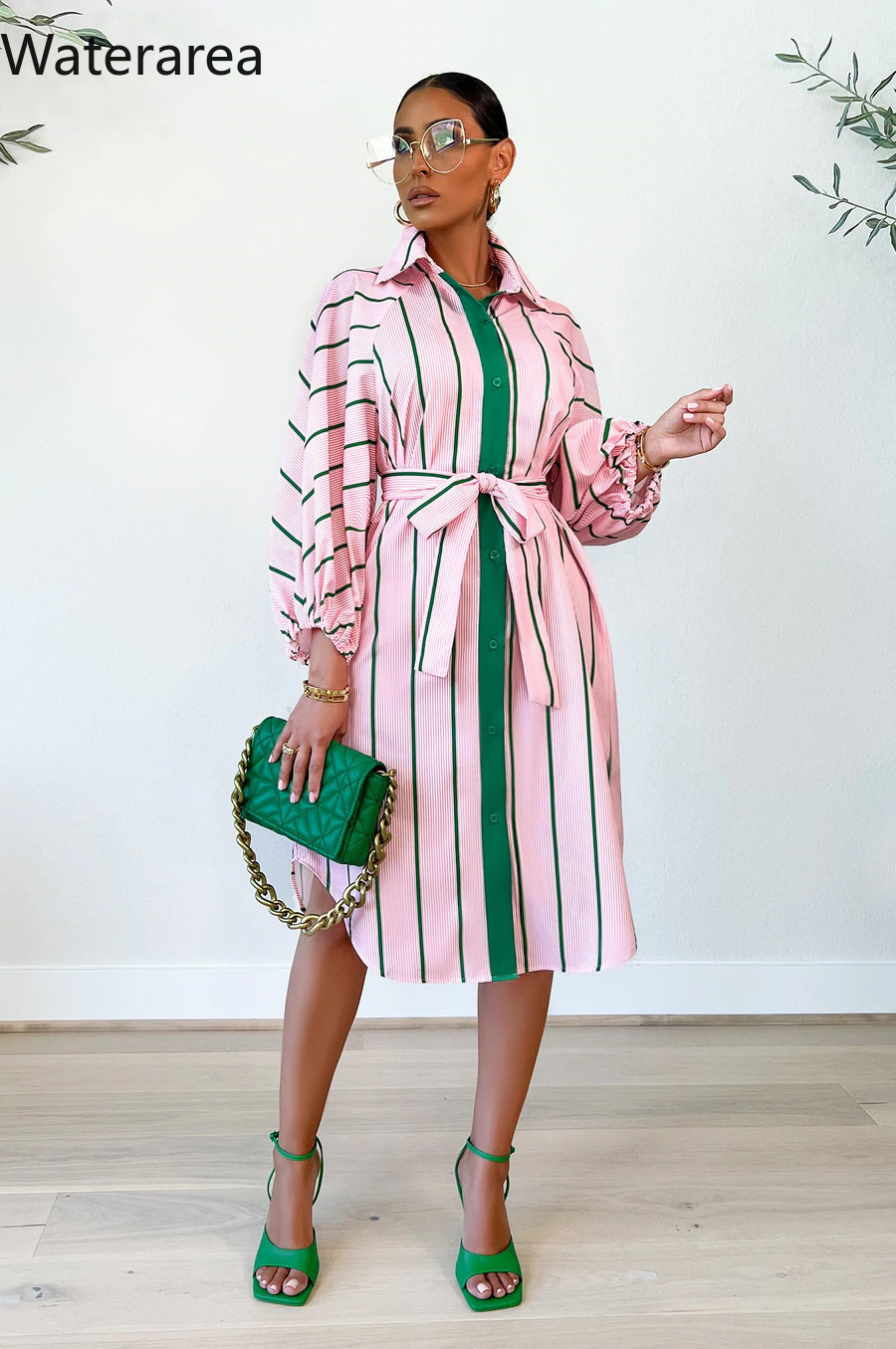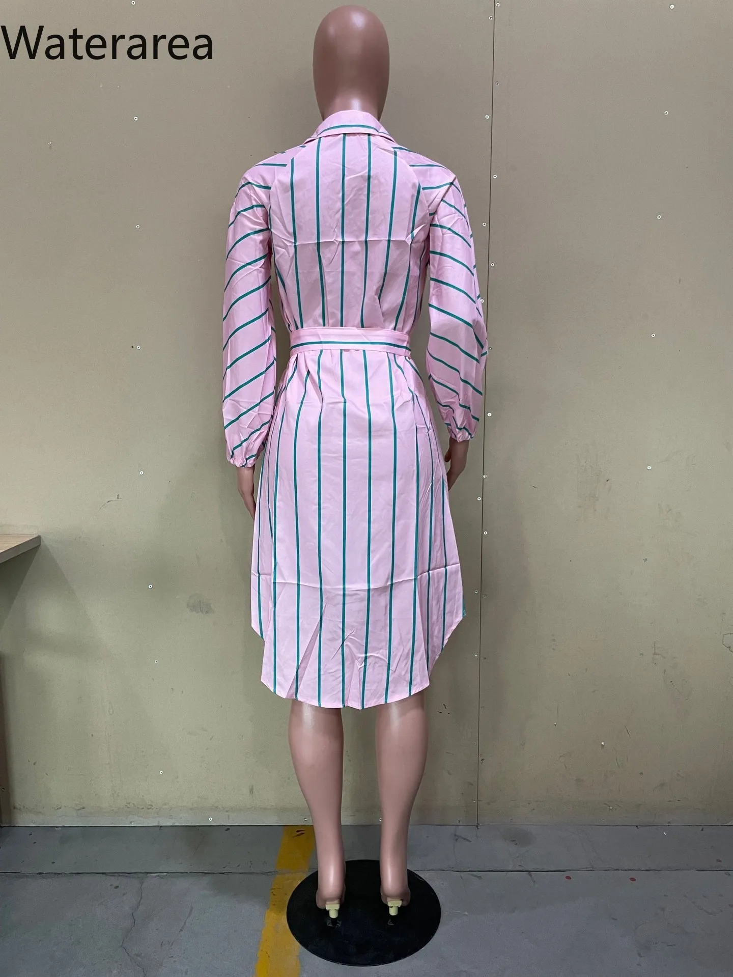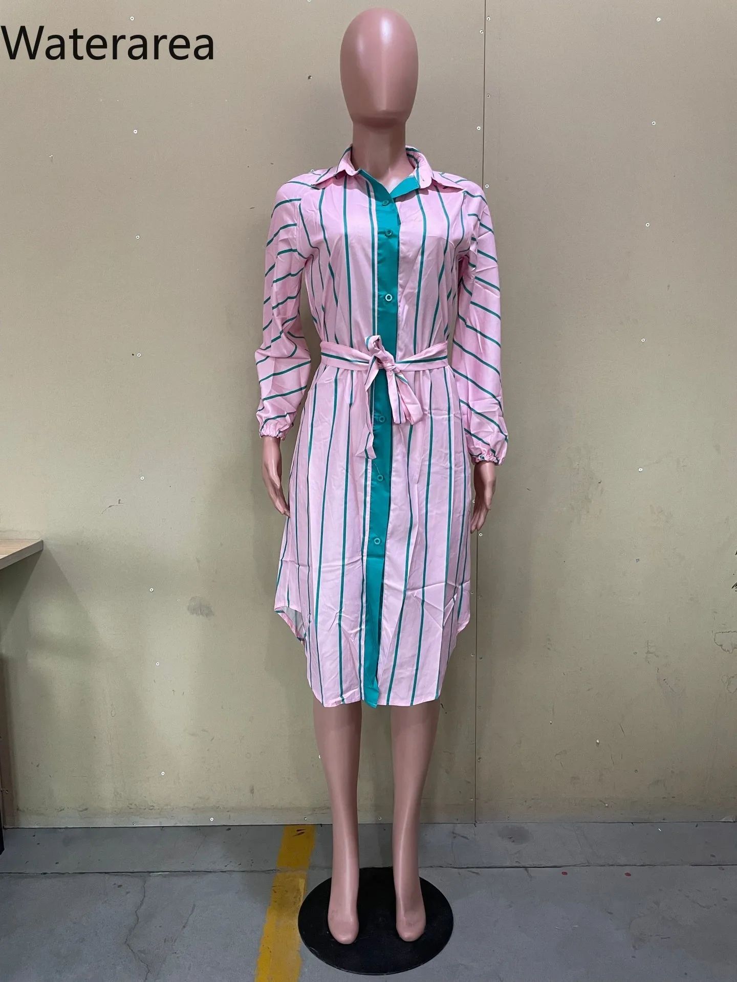 Waterarea Women's Striped Shirt Style Midi Dress Long Sleeve Button Up Elegant Office Lady Straight Dresses 2022 Spring Autumn