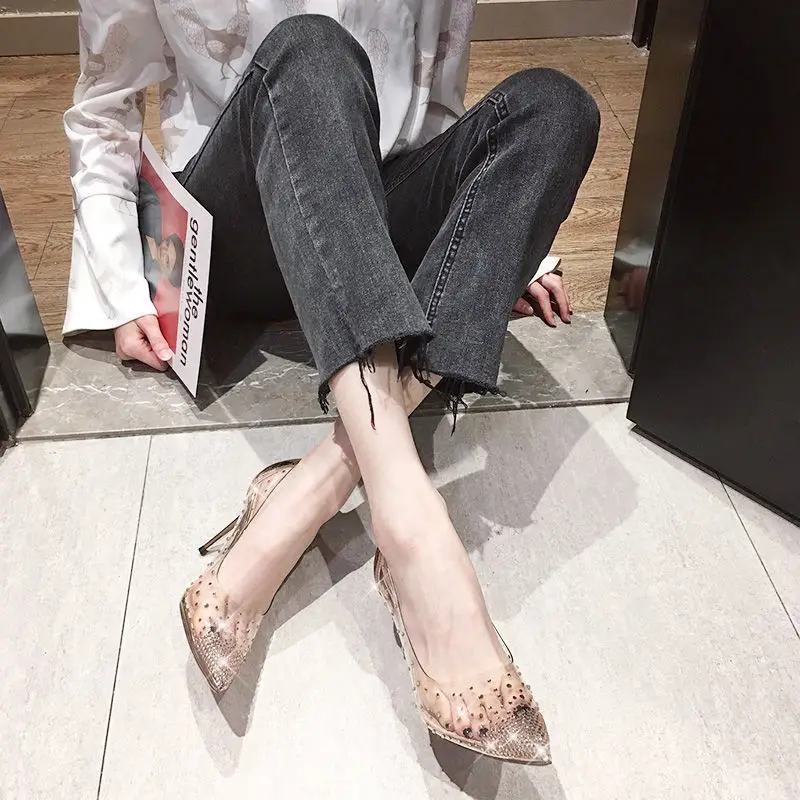 Wedding Shoes High Heels Women 2022 New Spring Summer Crystal Net Red Rhinestone Transparent Bridesmaid Pointed Stiletto Heel