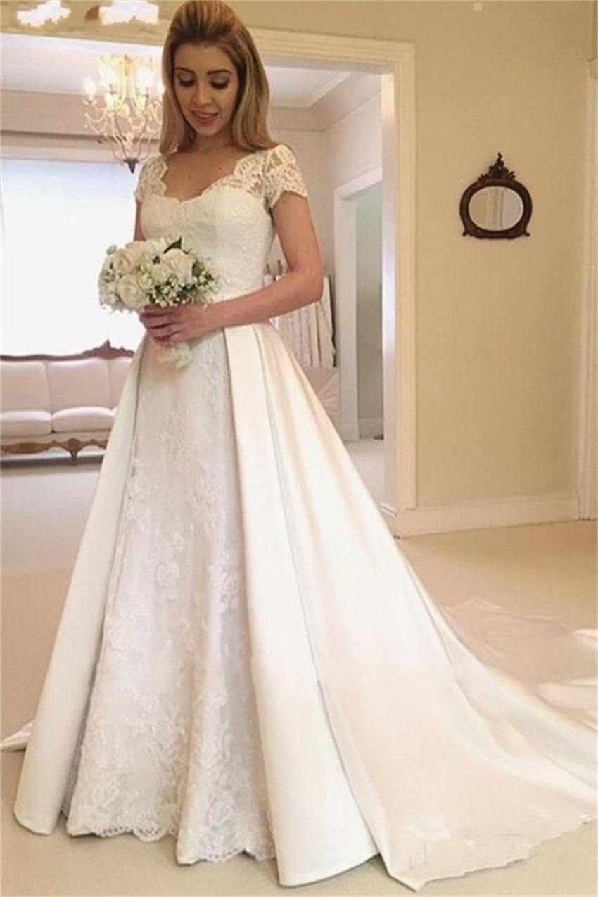 2024 Vintage Long Lace Wedding Dresses V-Neck Short Sleeves Button Back Detachable Satin Train Bridal Dreeses robe de mariee