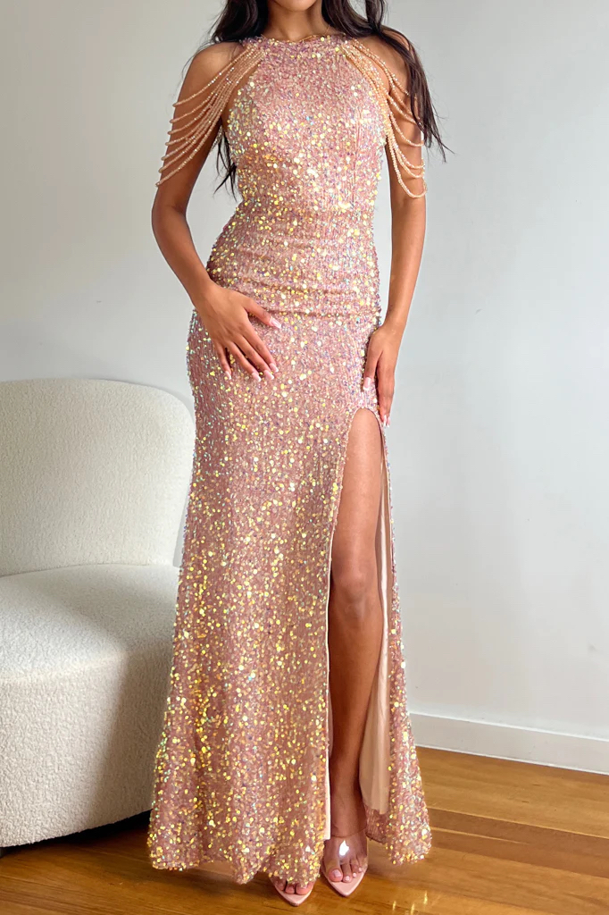 YIDINGZS Off Shoulder Beading Gold Sequin Dress Long Party Dress Women Sexy Evening Dress