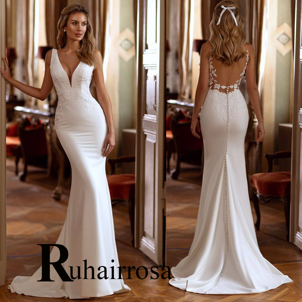 Ruhair Sexy Backless Mermaid Wedding Dresses For Women Appliques Lace V-Neck Tank Button Satin Custom Made Vestidos De Novia