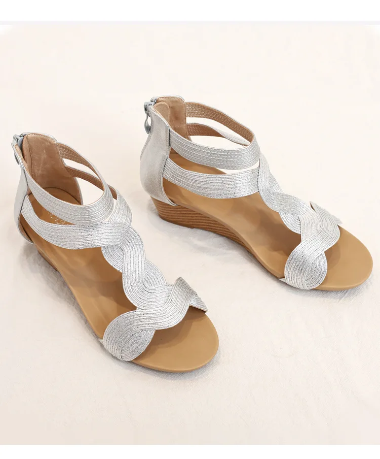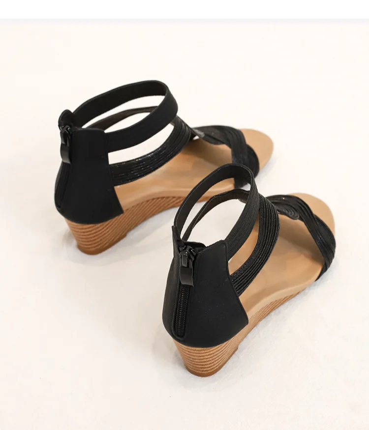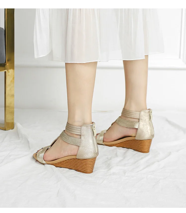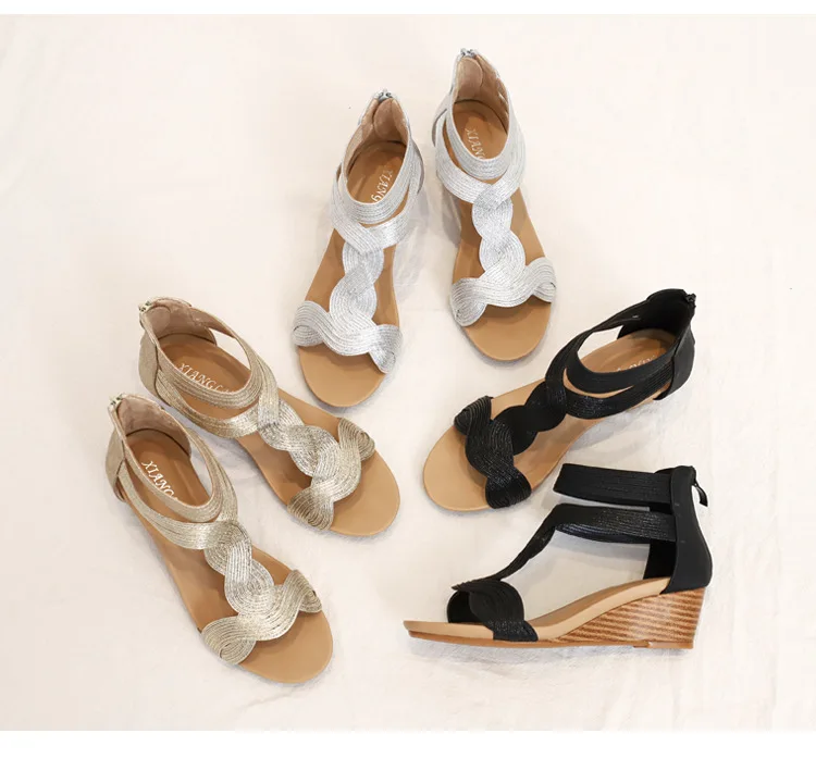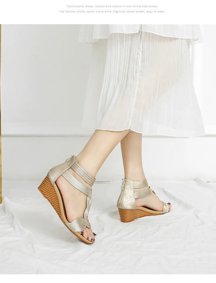 Wedge heel round toe sandals Xia Xian thin bag heel side hollow women's shoes casual back zipper Roman sandals