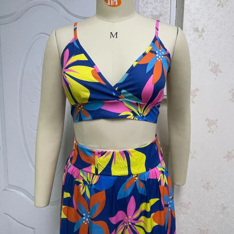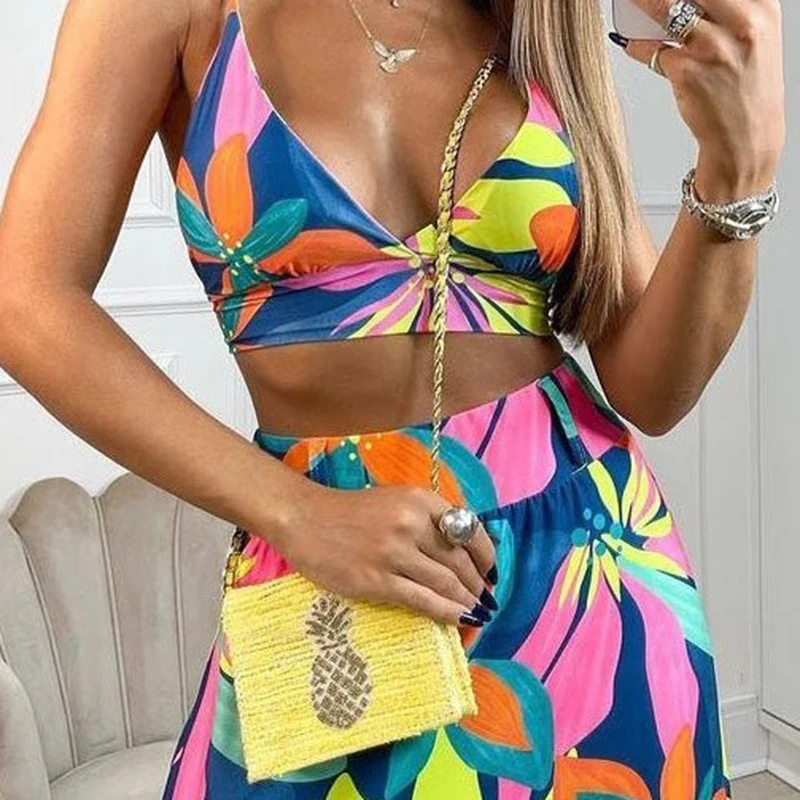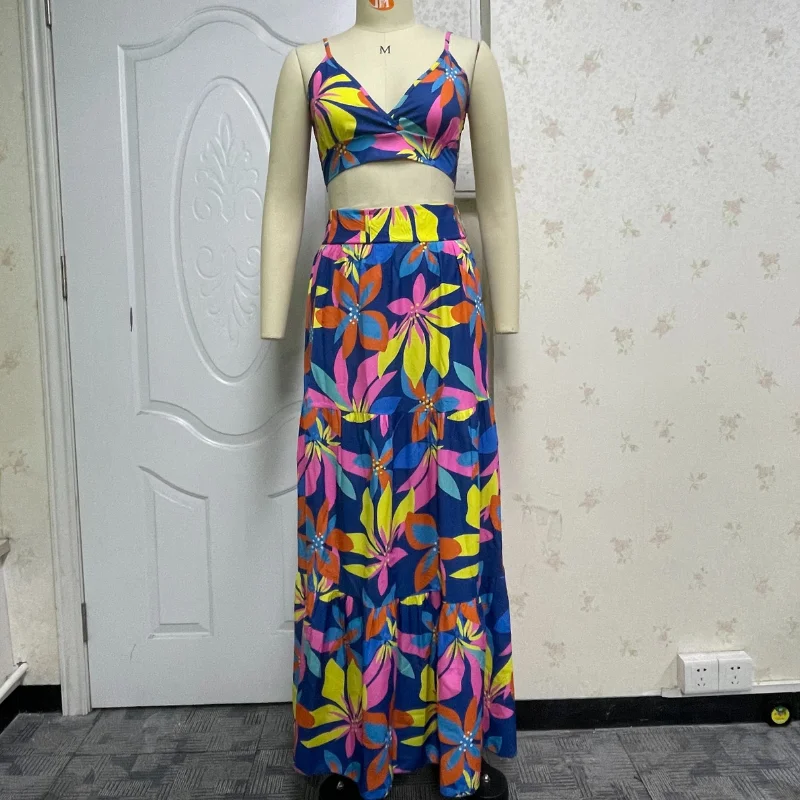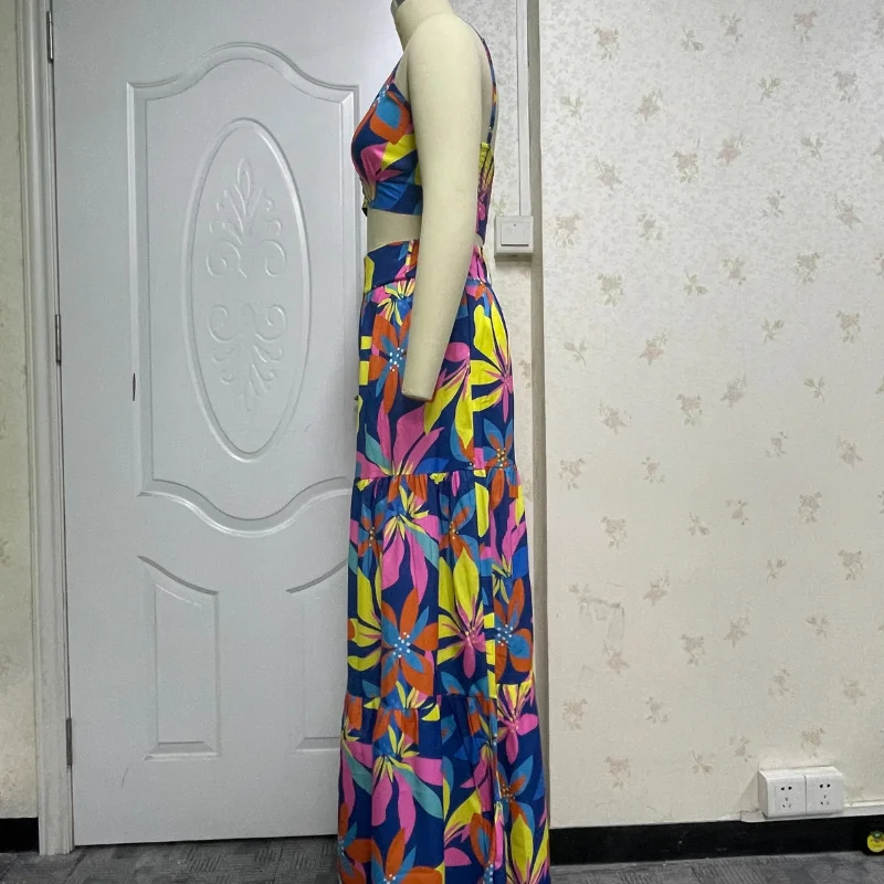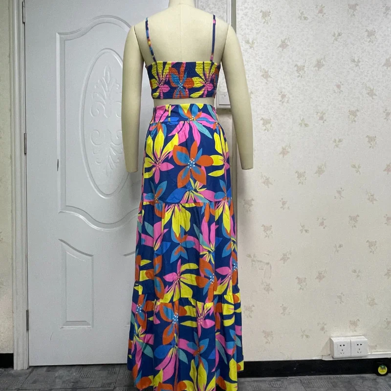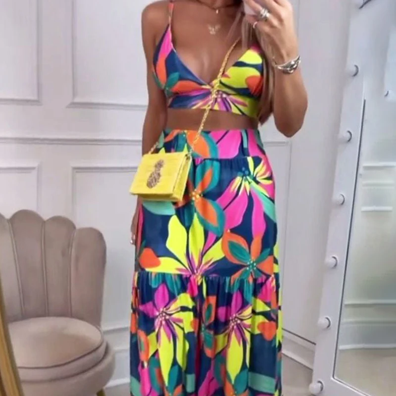 Wefads Two Piece Sets Sleeveless Printed Skirt Two-Piece Sexy Tops Elegant Long Dress Beach Suit