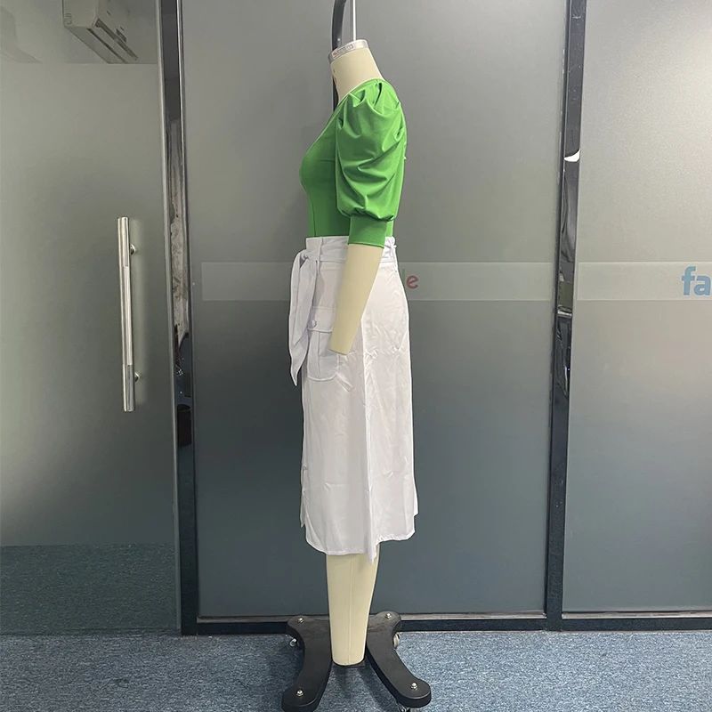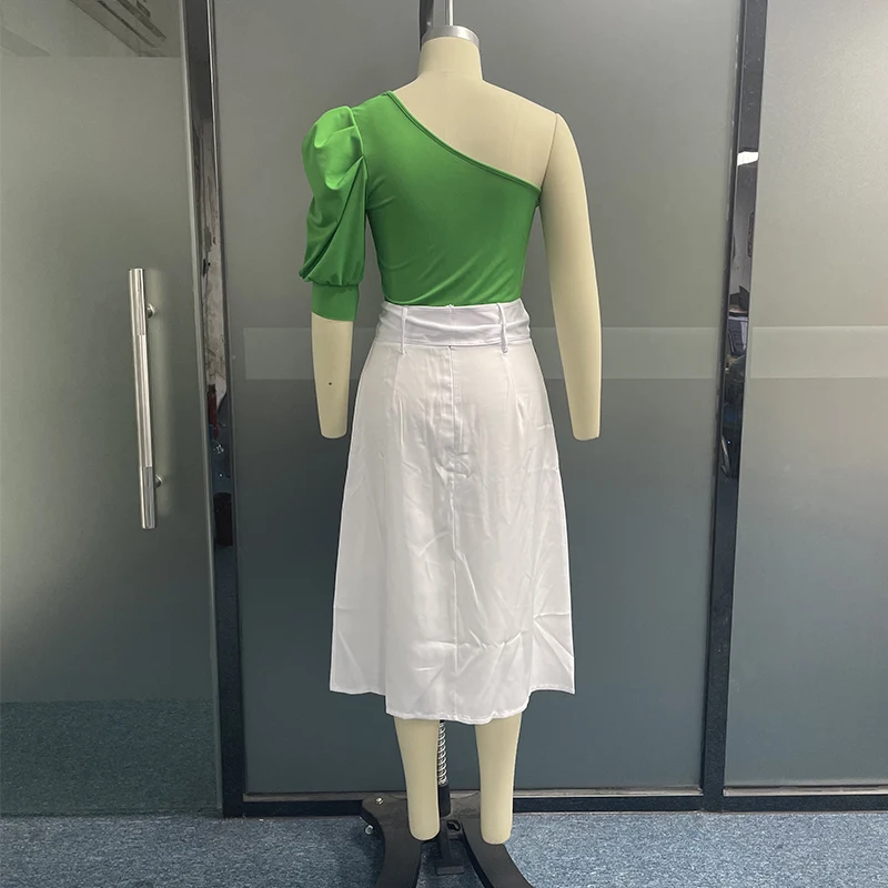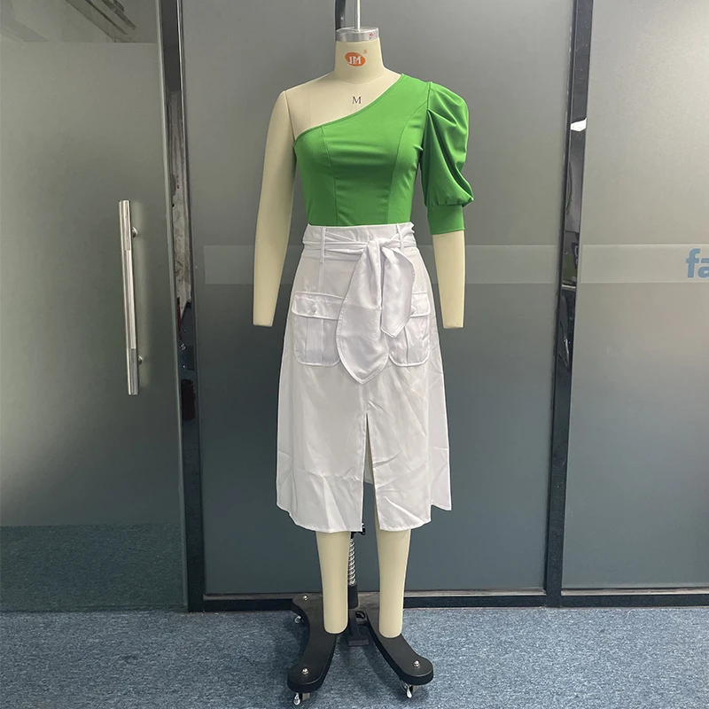 Wefads Women Two Piece Set Summer Single Shoulder Solid Puff Sleeve Top Lace Up Slit With Pockets Mid Skirt Sets High Streetwear