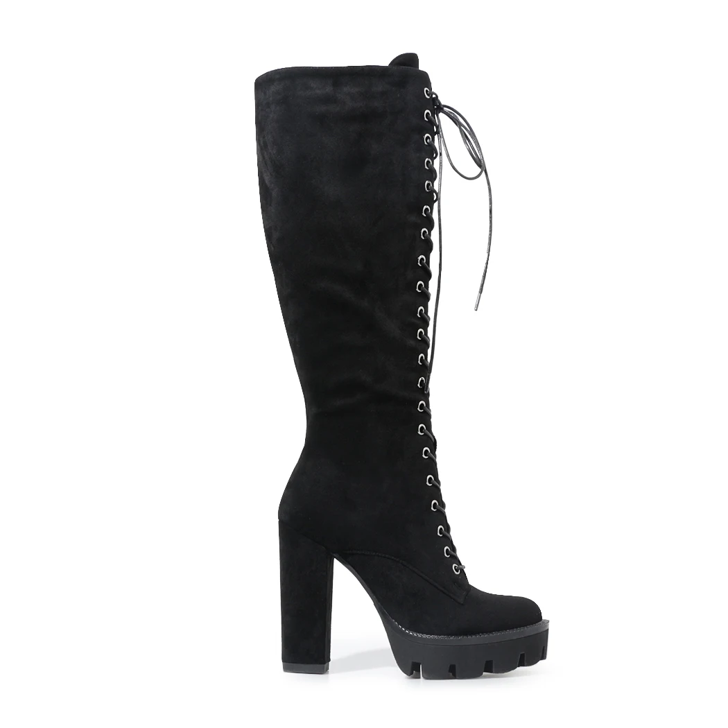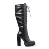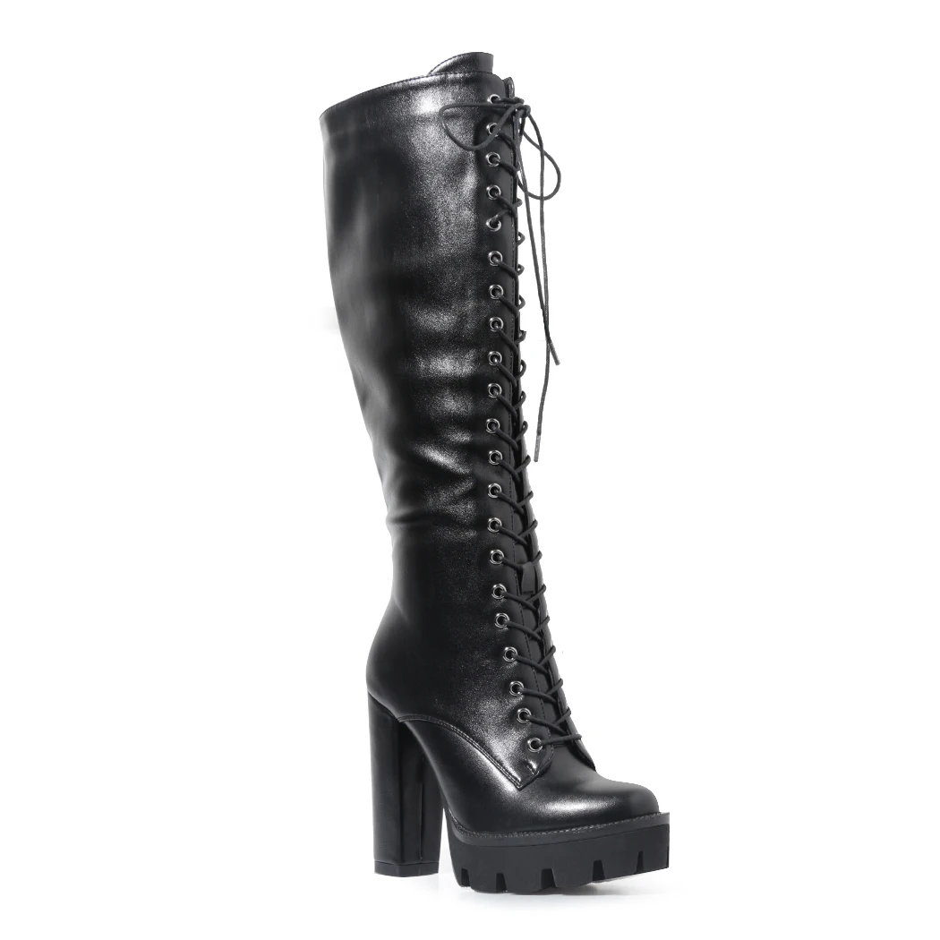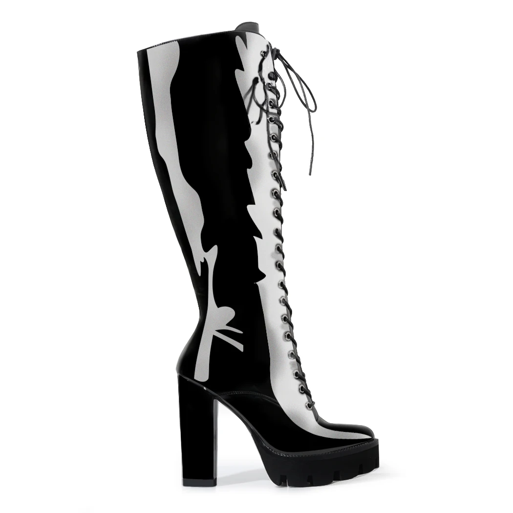 WETKISS Women Patent Leather Knee High Boots Slip On Platform Thick High Heels Cross Tied Zip Shoes Round Toe High Boot
