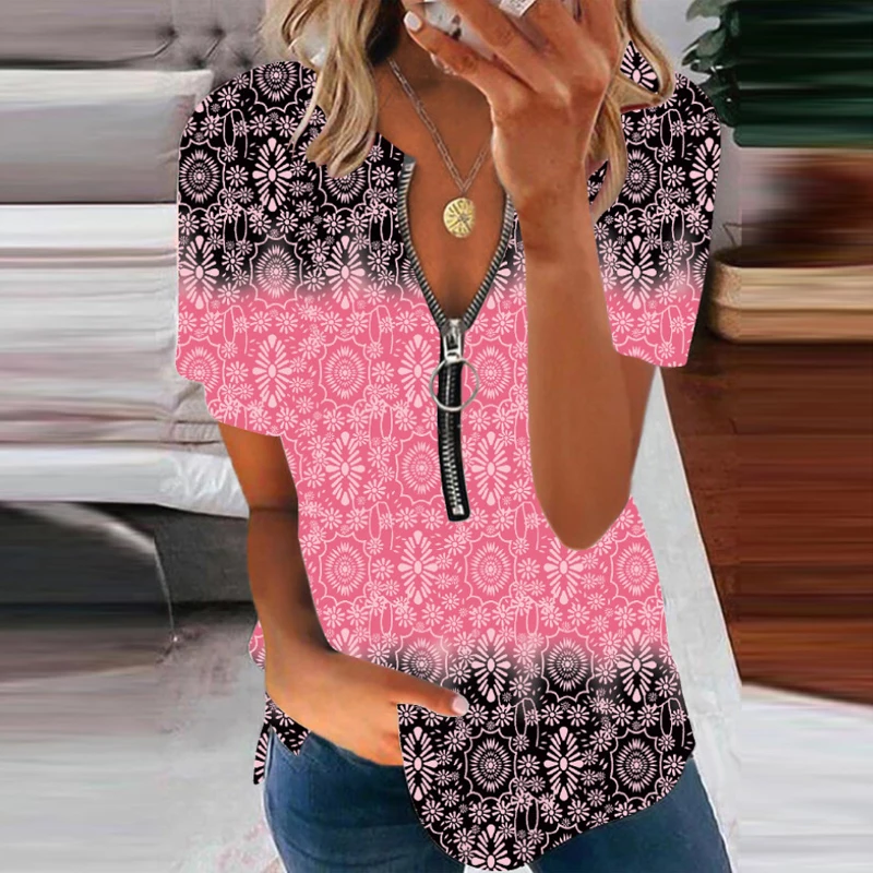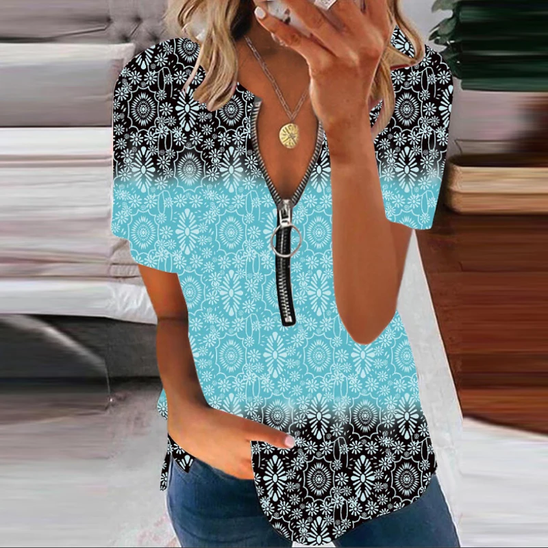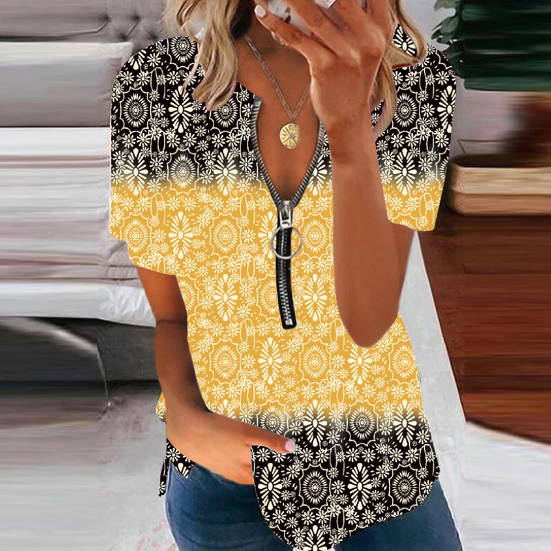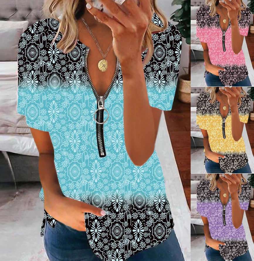 Woman Casual Shirt 2021 Summer Loose Sexy Zipper V Neck Printed Pullover Ladies Blouse Fashion Vintage Short Sleeve Elegant Tops