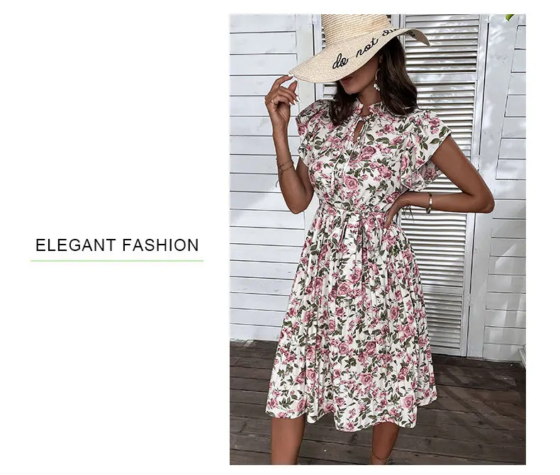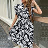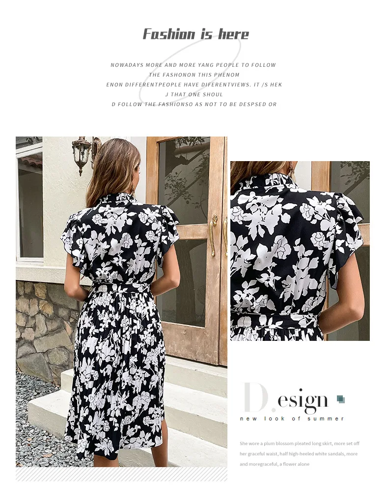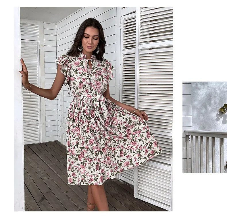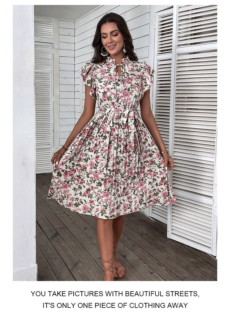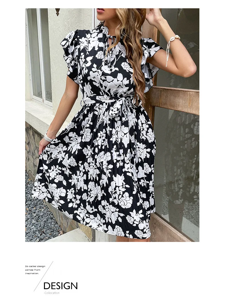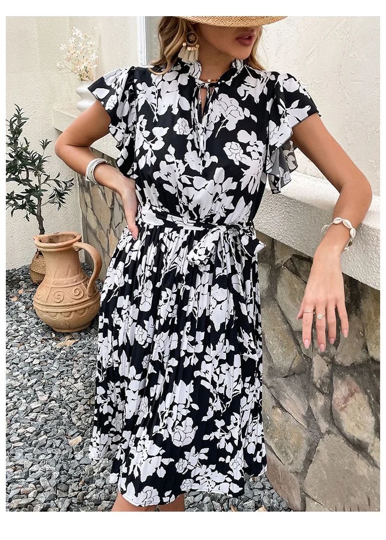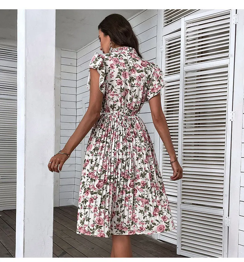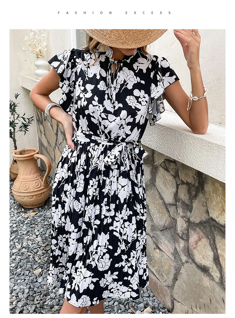 Woman Elegant Summer White Dress Beach Holiday Casual Sashes Flounced Edge Vestidos Flower Print Pleated Dresses Party Dress