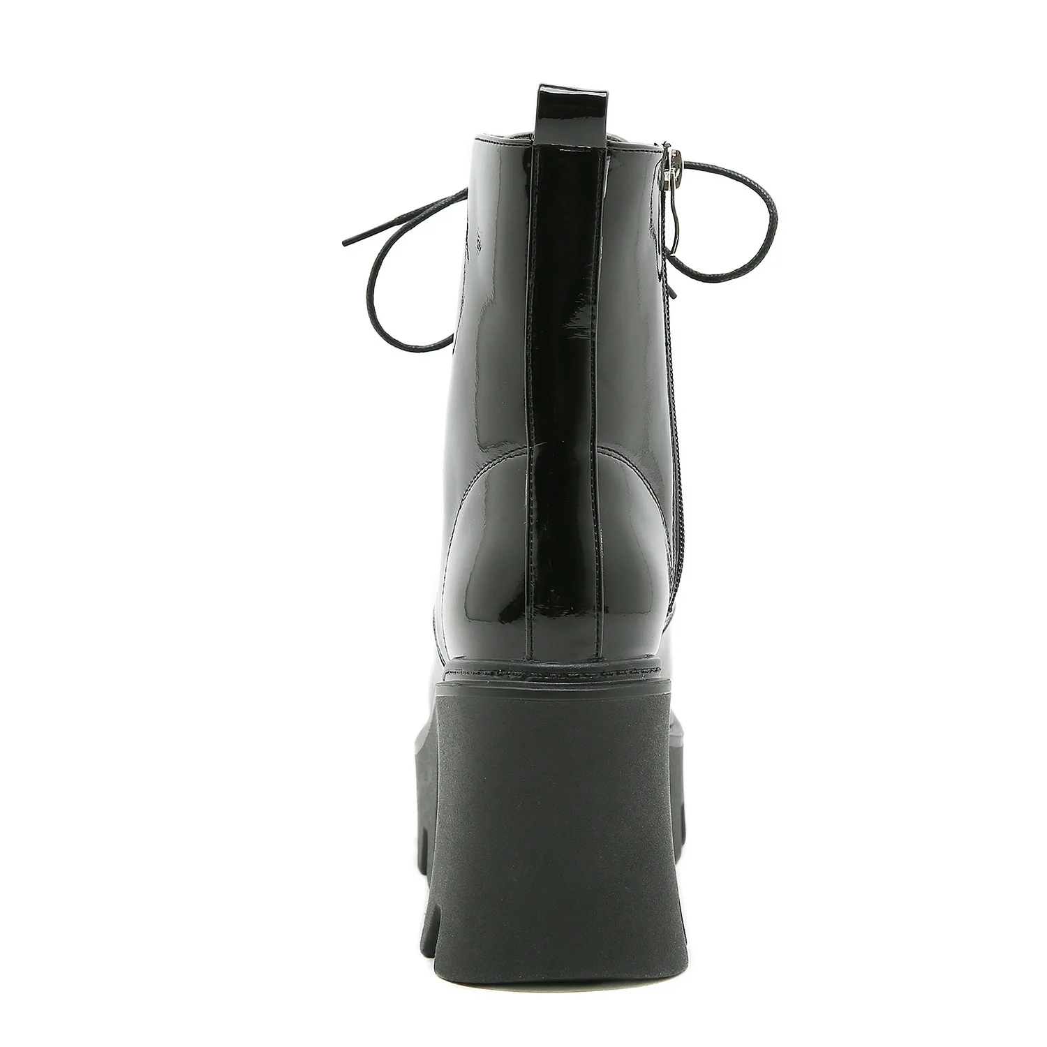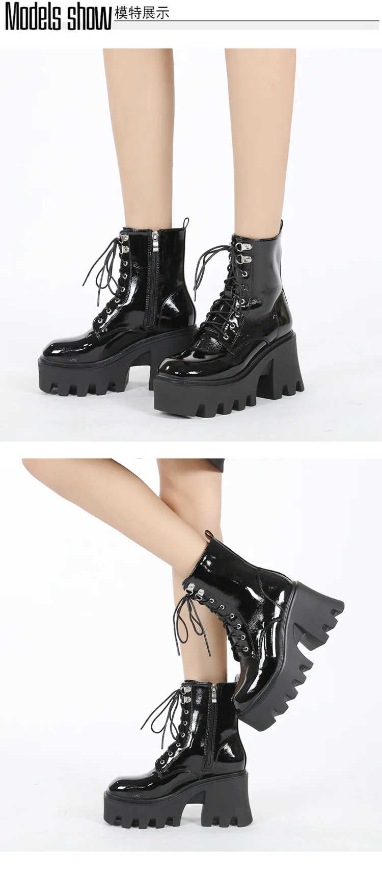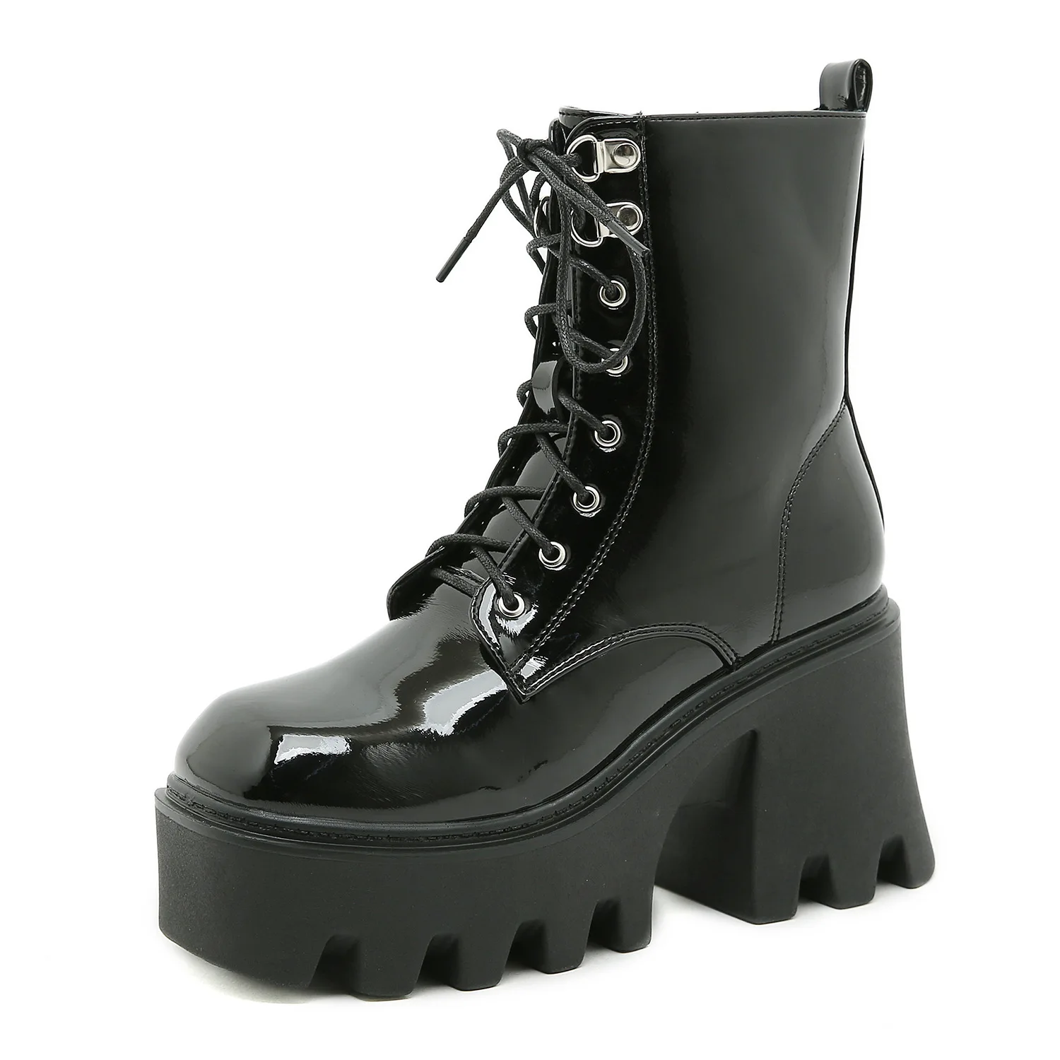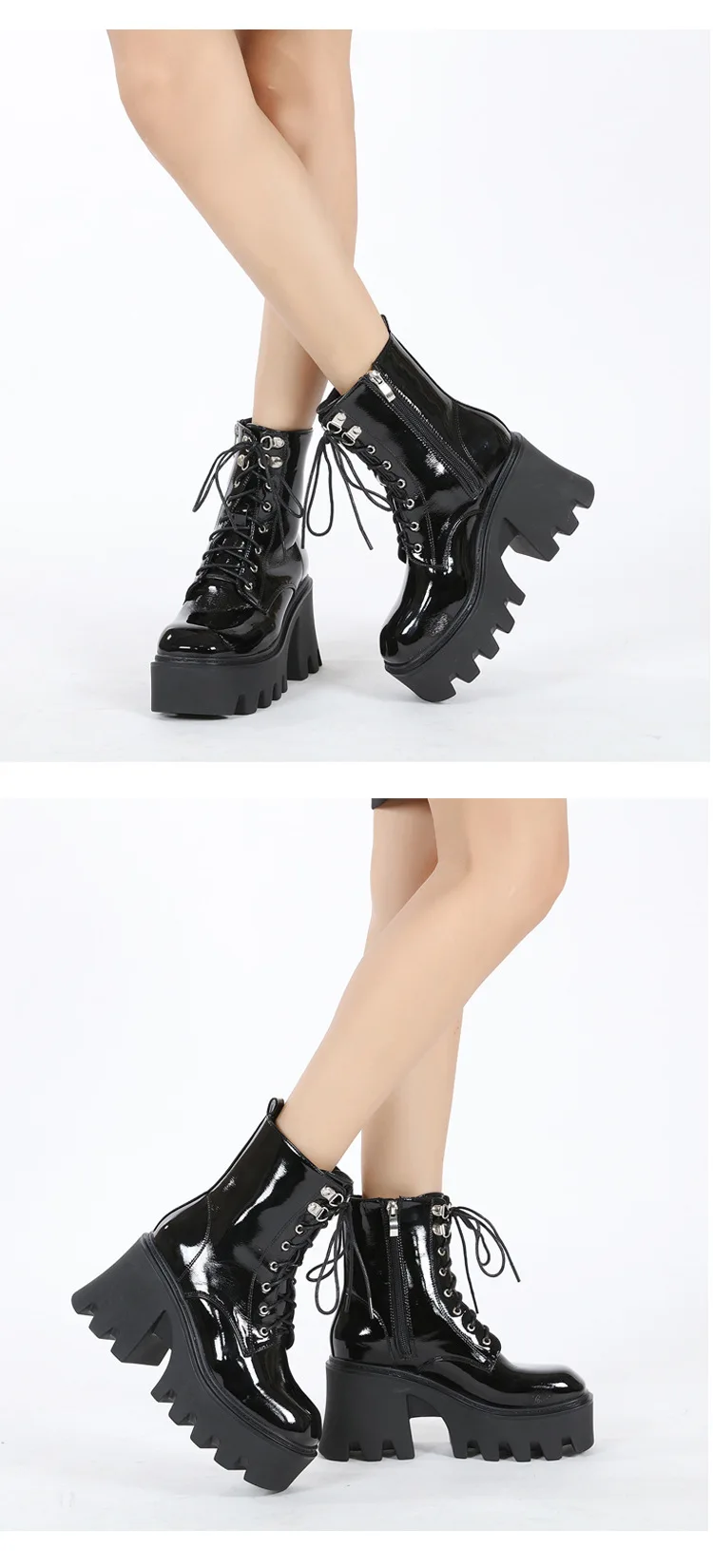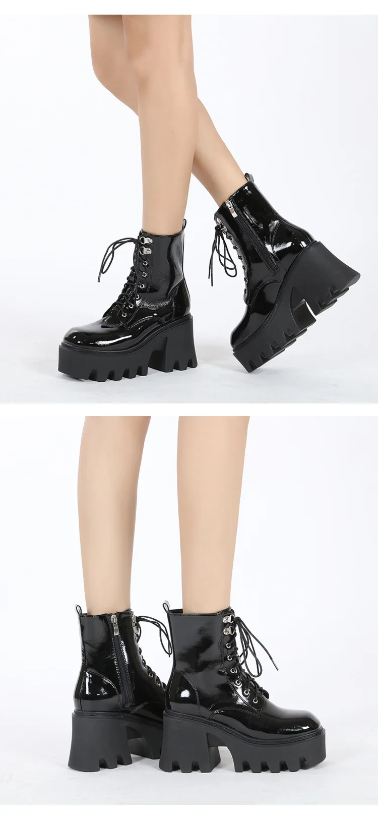 Woman Lace Autumn Boots Womens Ladies Chunky Wedge Platform Black Patent Leather Ankle Boots Punk Goth New Arrival588