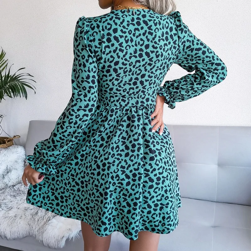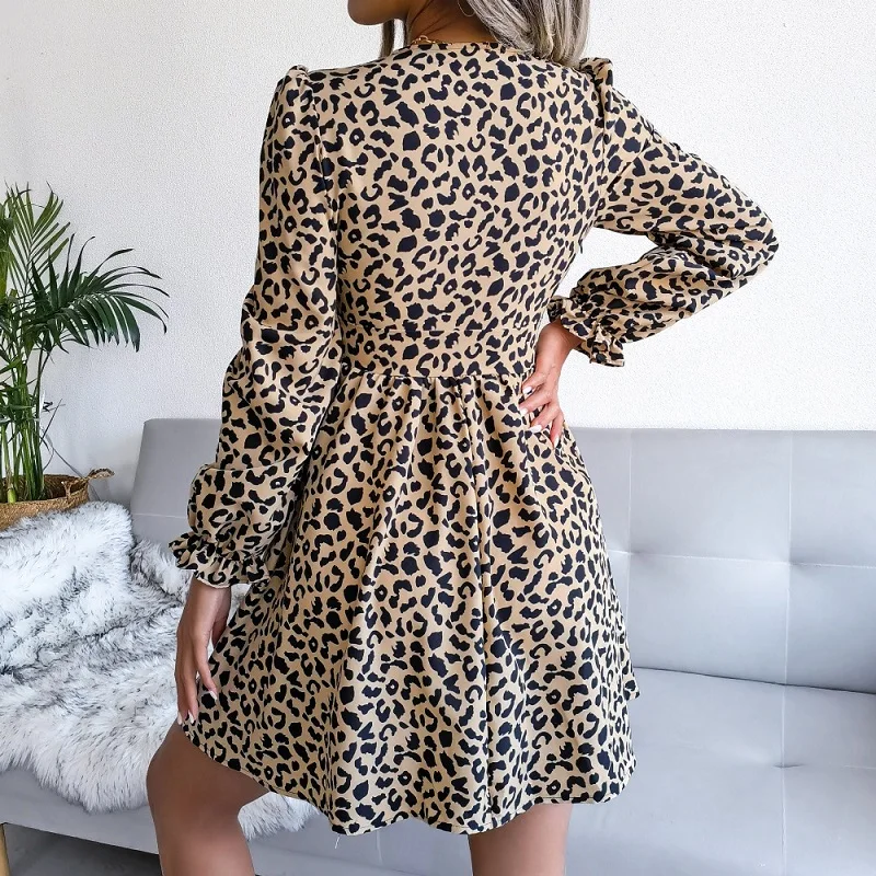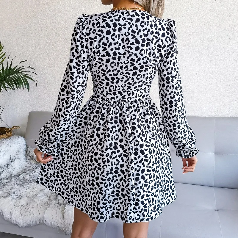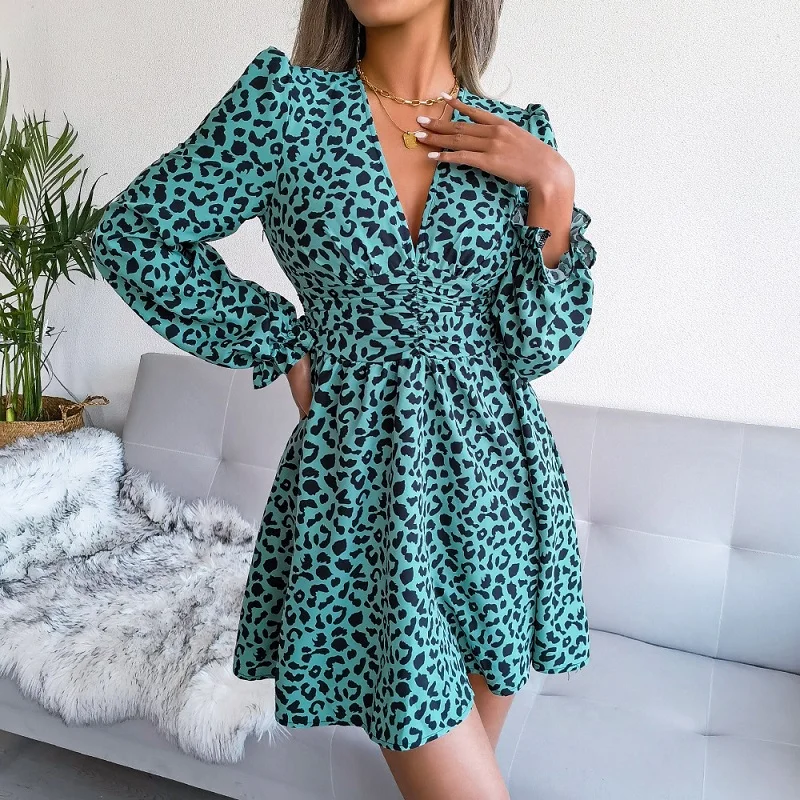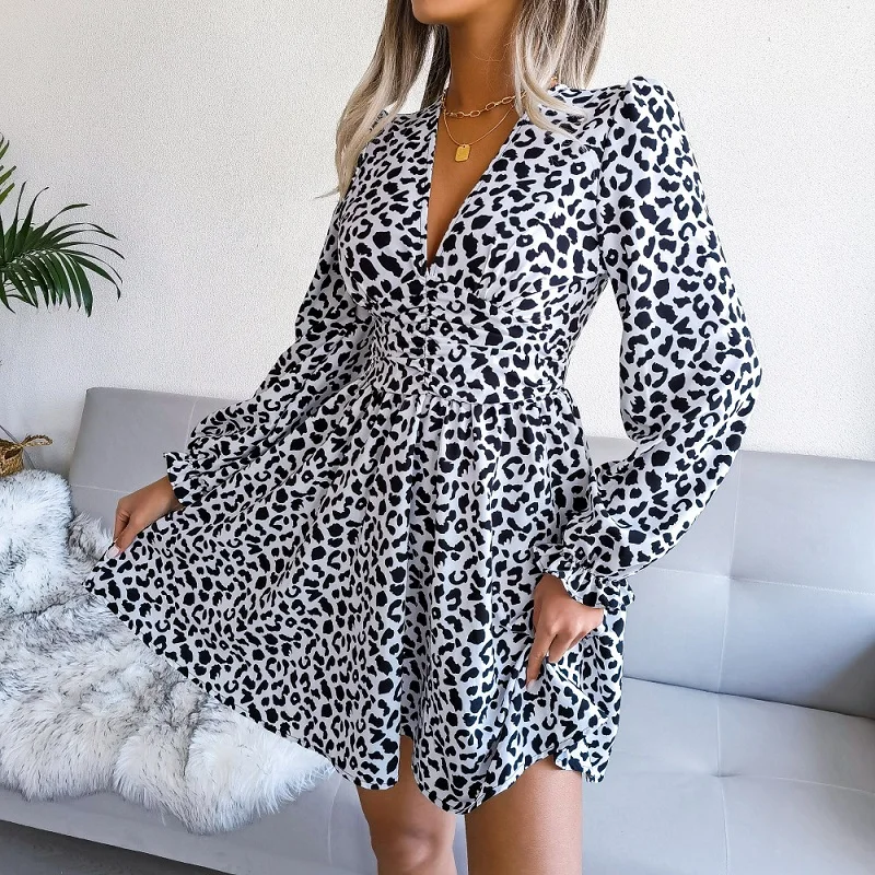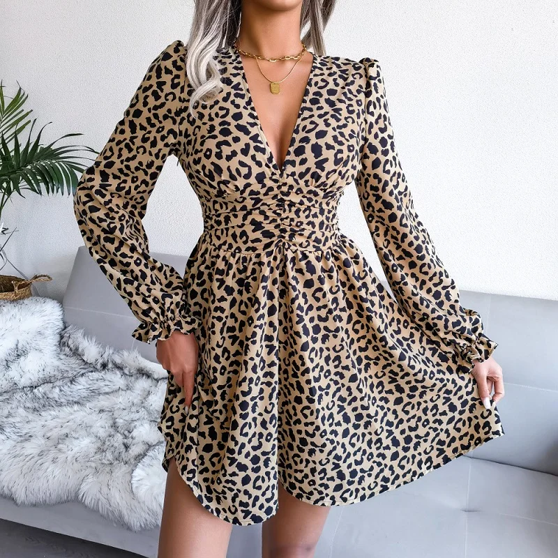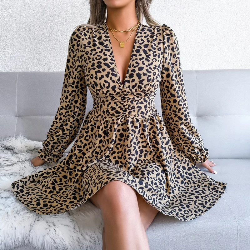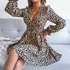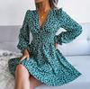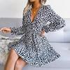 Women Autumn Deep V-Neck Sexy Waist Vintage Elegant Thin Lace Leopard Print Long Sleeve Dress A-Shaped Short Skirt Fashion Lady