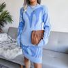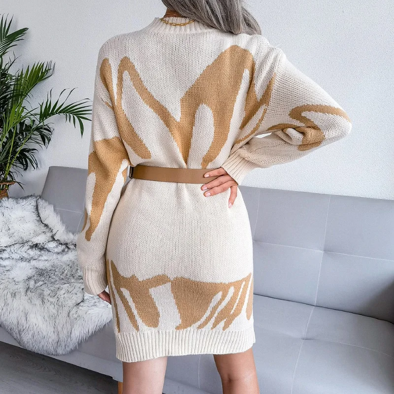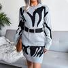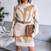 Women Autumn Winter New Fashion Elegant Geometric Pattern Long Sleeve O-Neck Pullover Loose Sweater Skirt Knitted Dresses Female