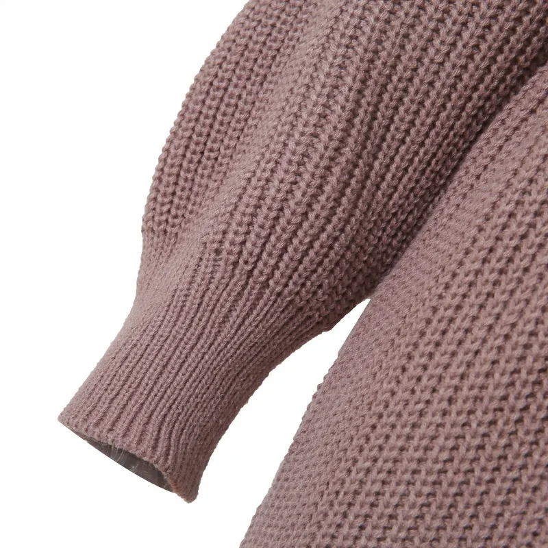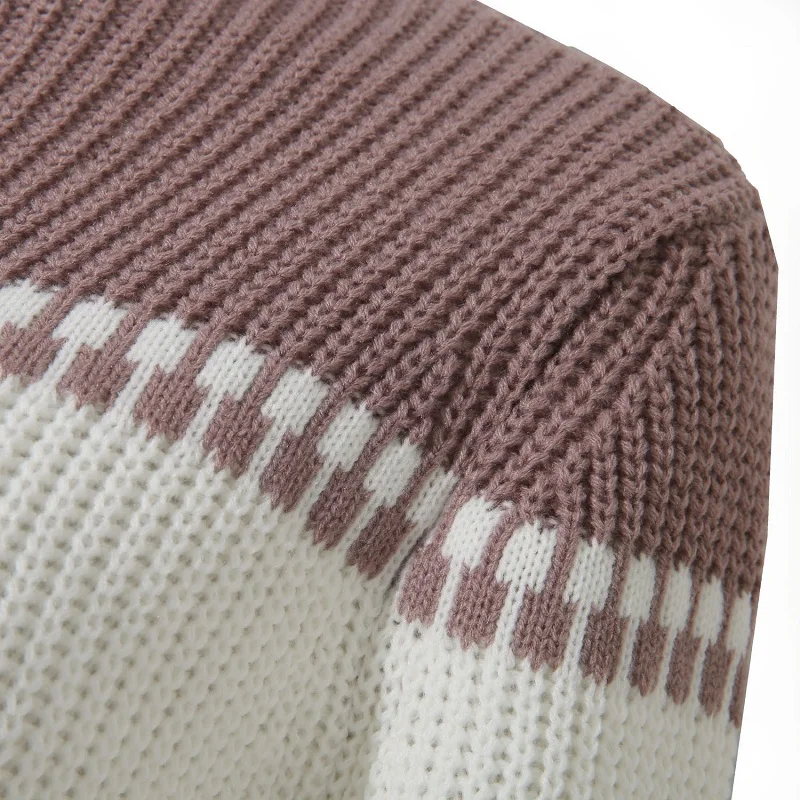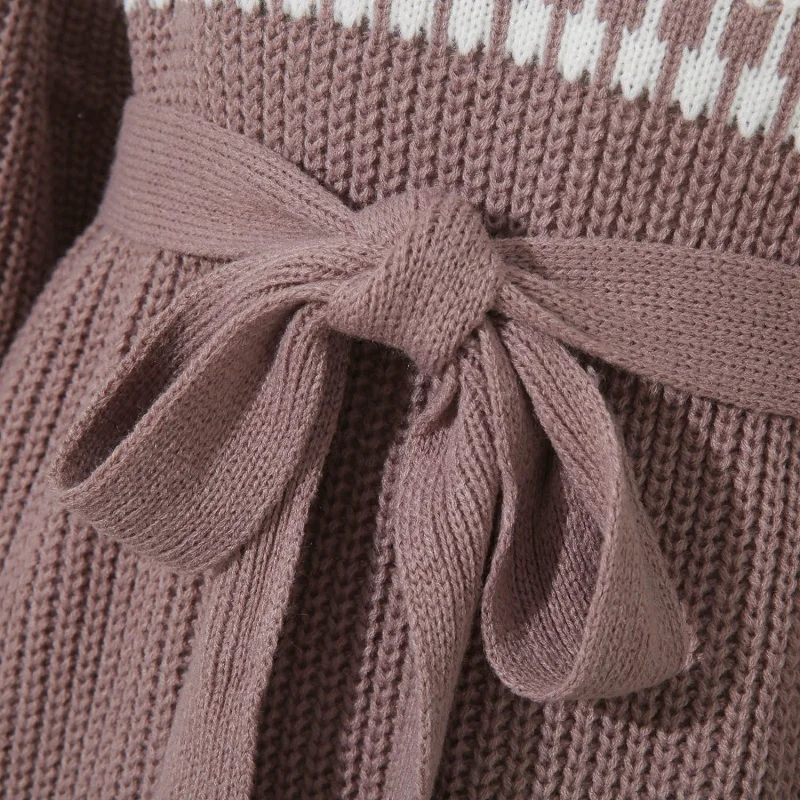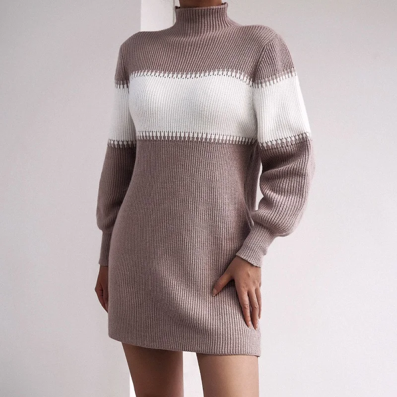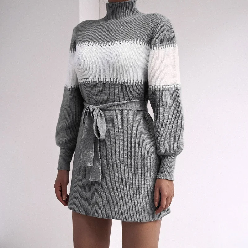 Women Autumn Winter New Products Long Sleeve Loose Contrast Color Stripe Half High Neck Belt Pullover Knitted Casual Dress Femal