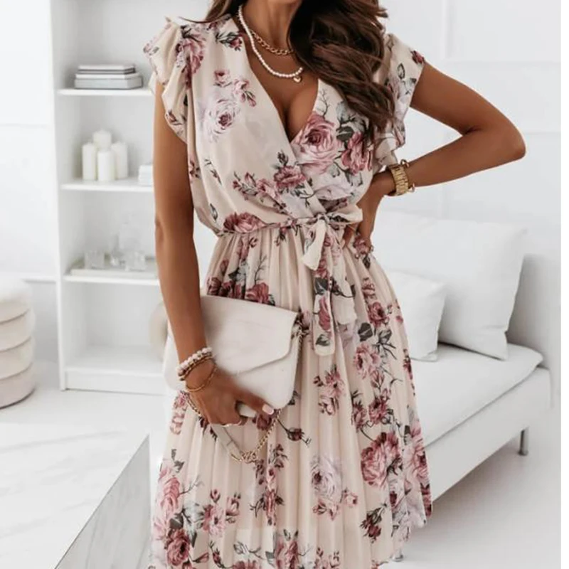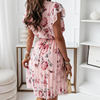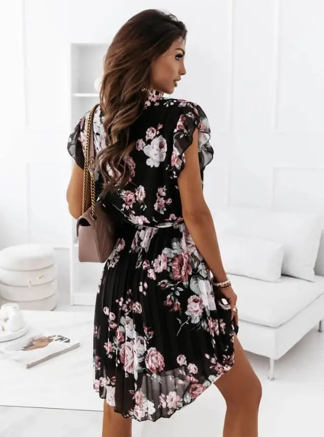 Women Chiffon Ruffles Sleeve Floral Print Mini Dress 2021 Summer Casual Deep V Neck Pink Pleated Office Ladies Dresses For Women