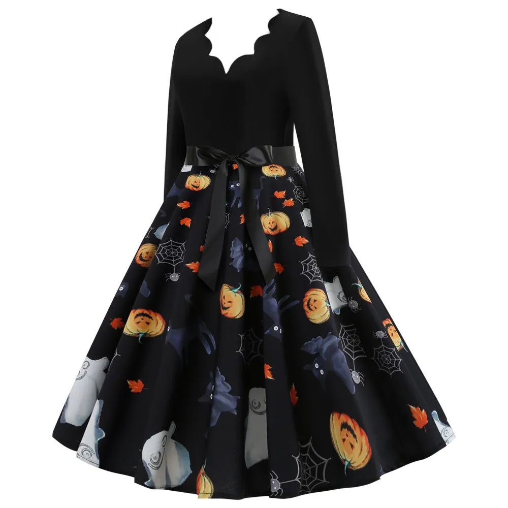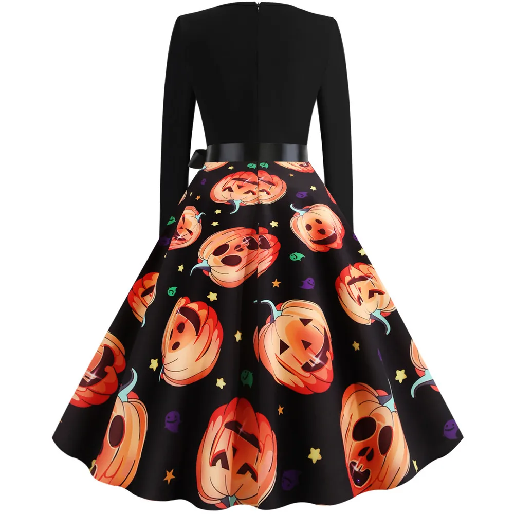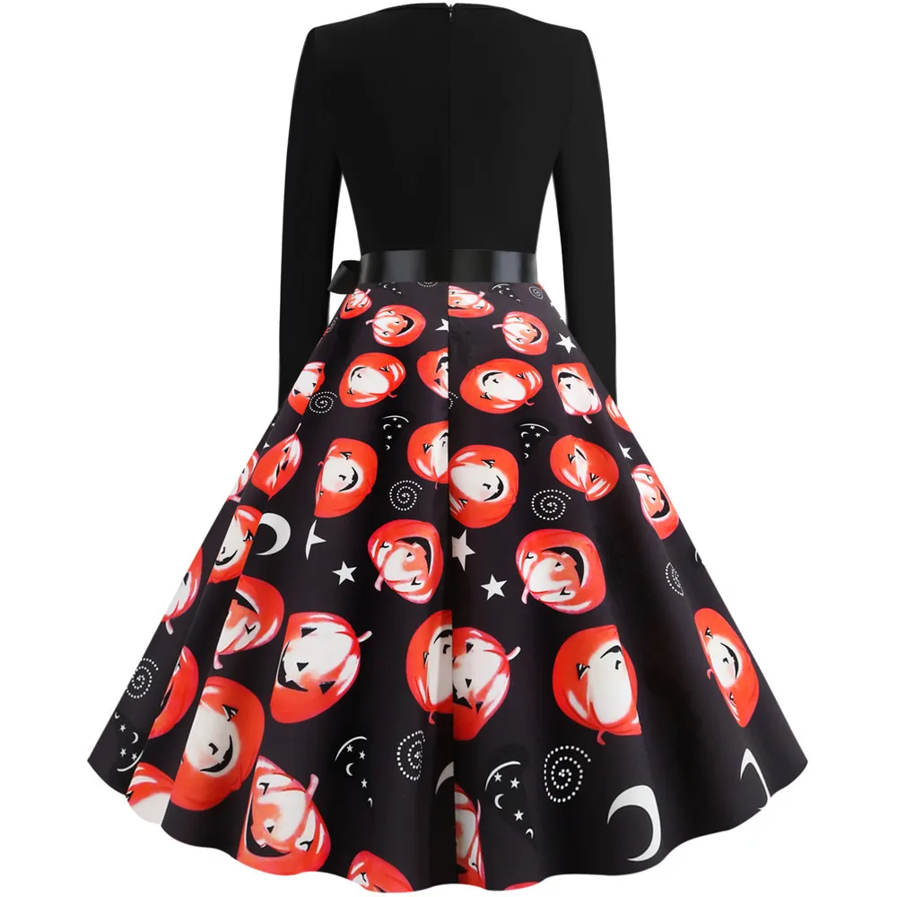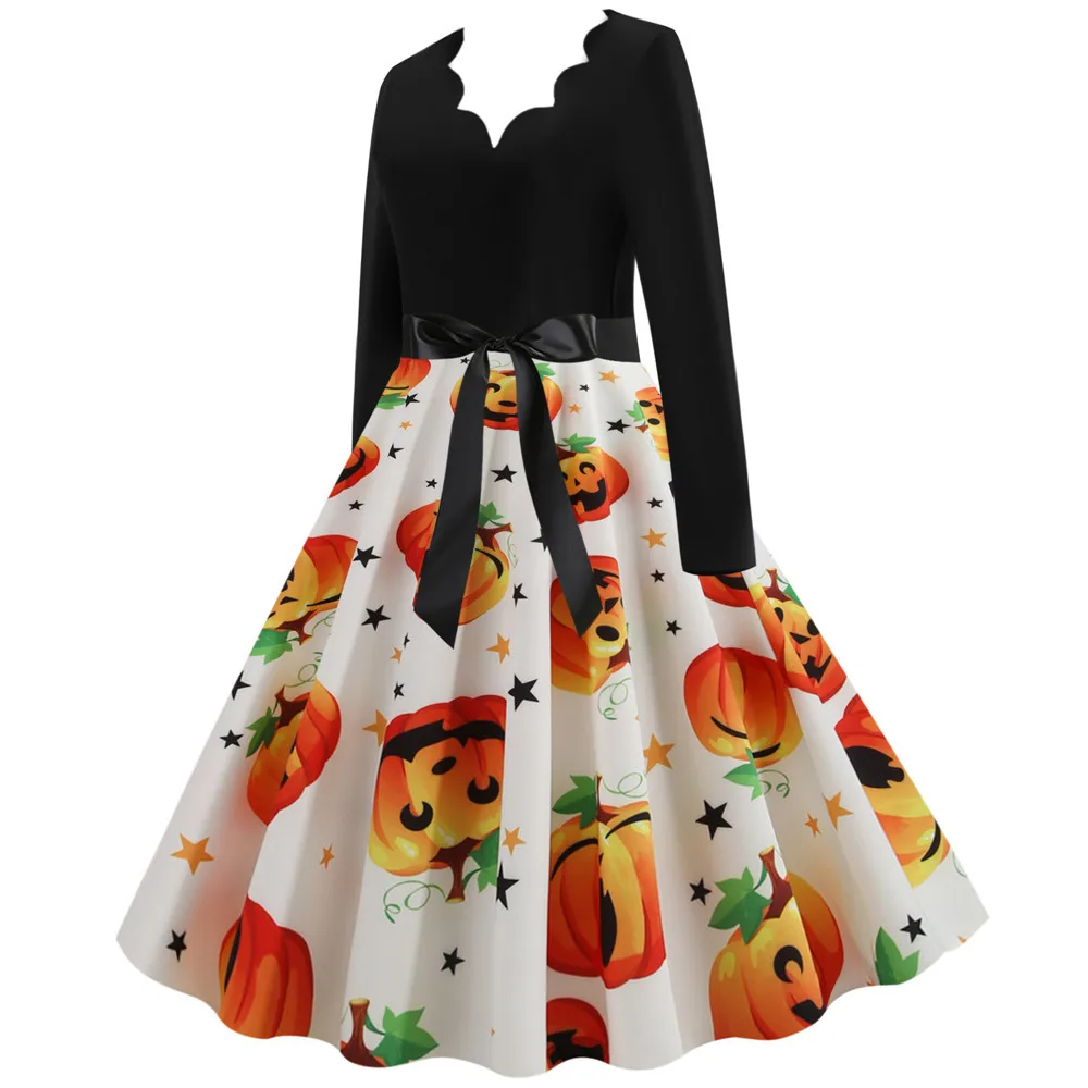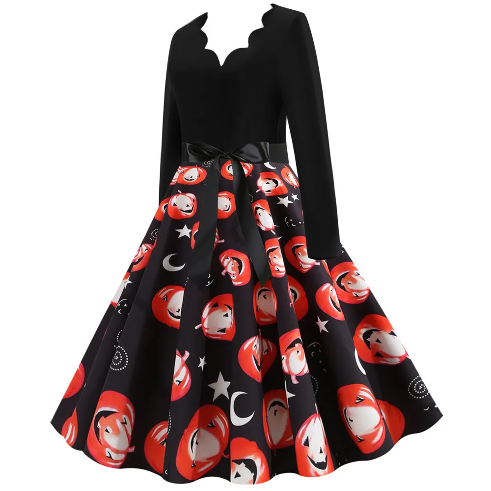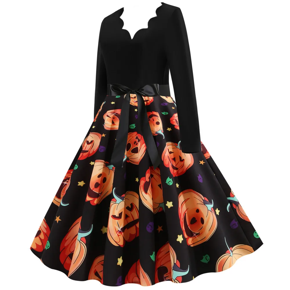 Women Christmas Dress Winter Long Sleeve V Neck Pumpkin Print Halloween Costume Party Dresses Casual Vintage S~3XL Clothing
