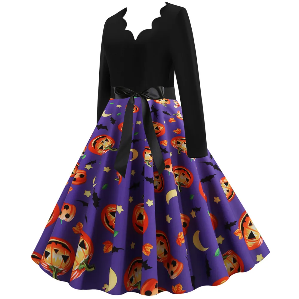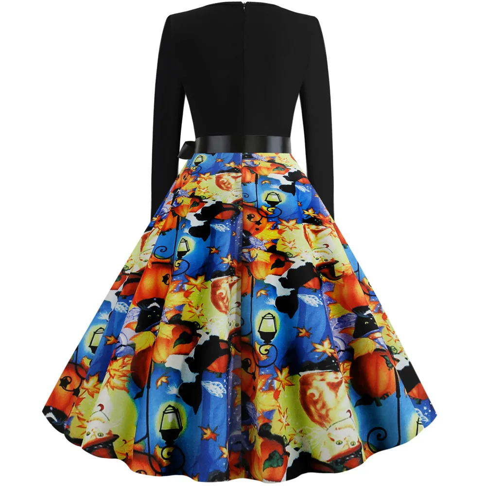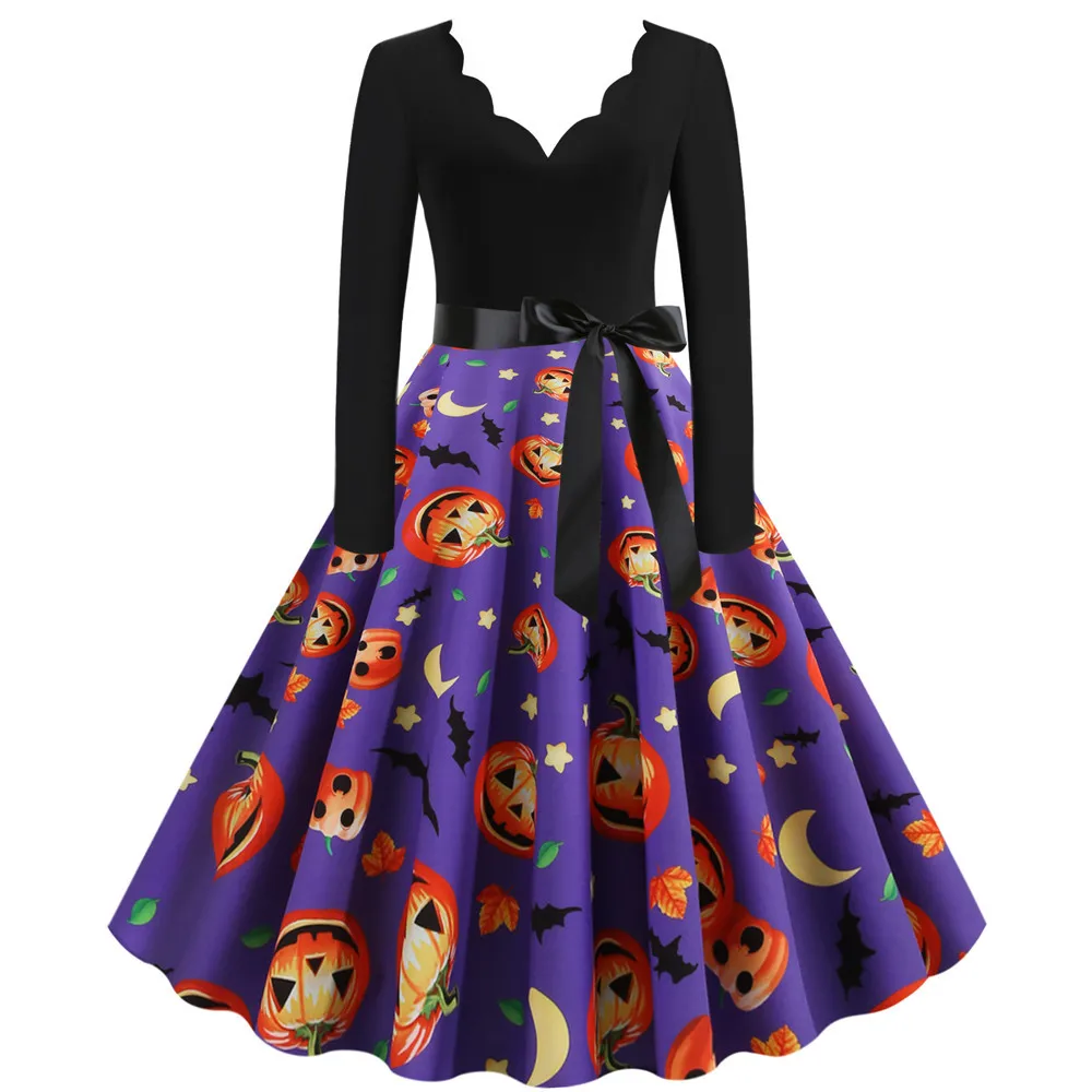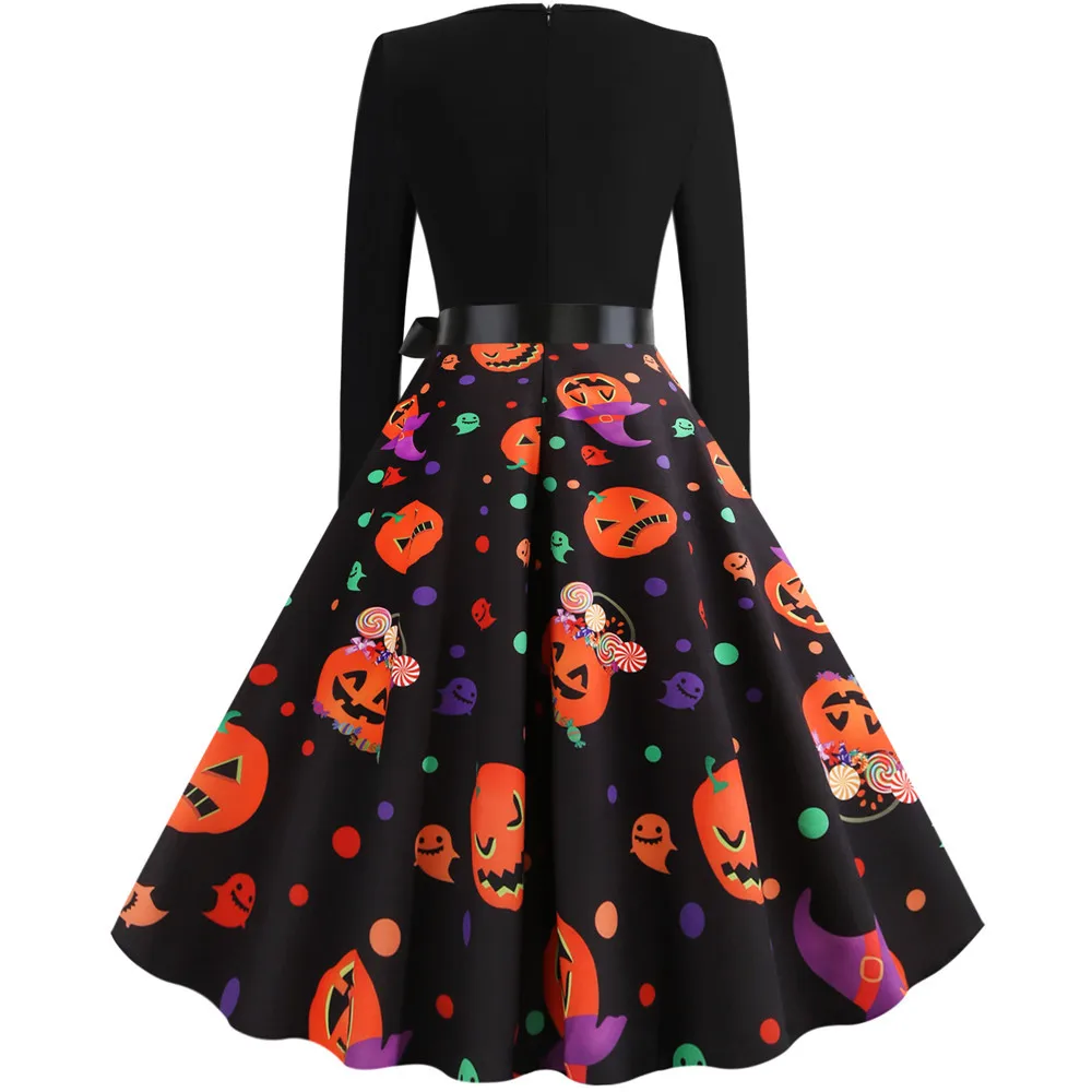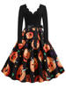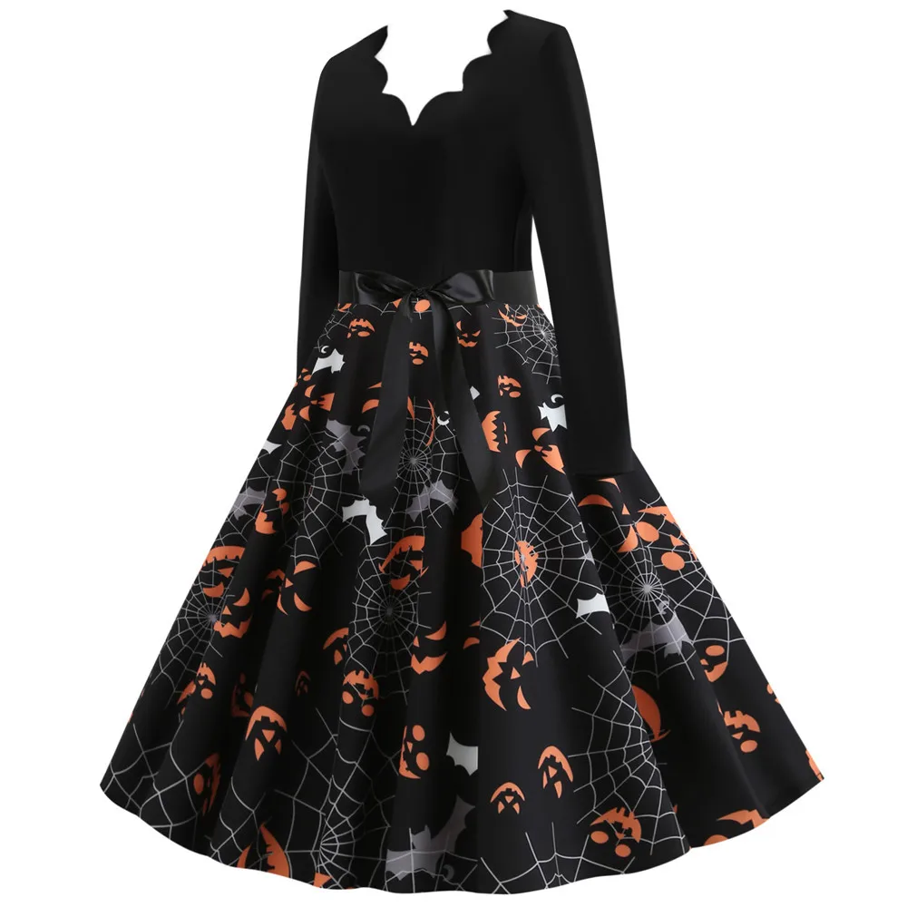 Women Christmas Dress Winter Long Sleeve V Neck Pumpkin Print Halloween Costume Party Dresses Casual Vintage S~3XL Clothing
