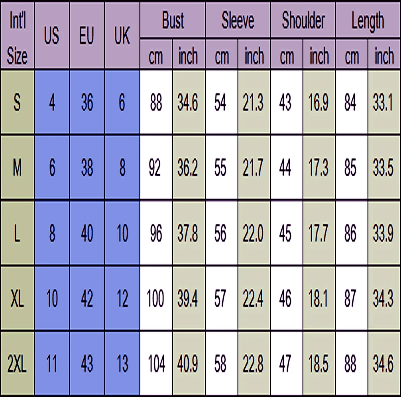 XXL:Bust:39.4″ —Shoulder: 18.1″—Length: 34.3″