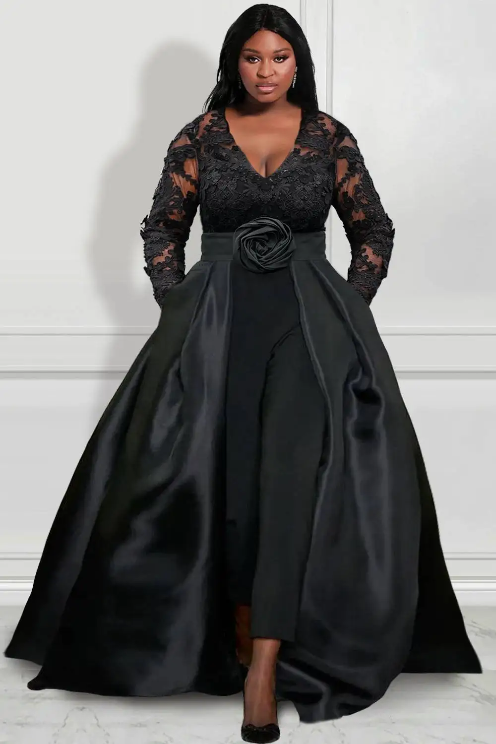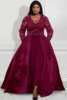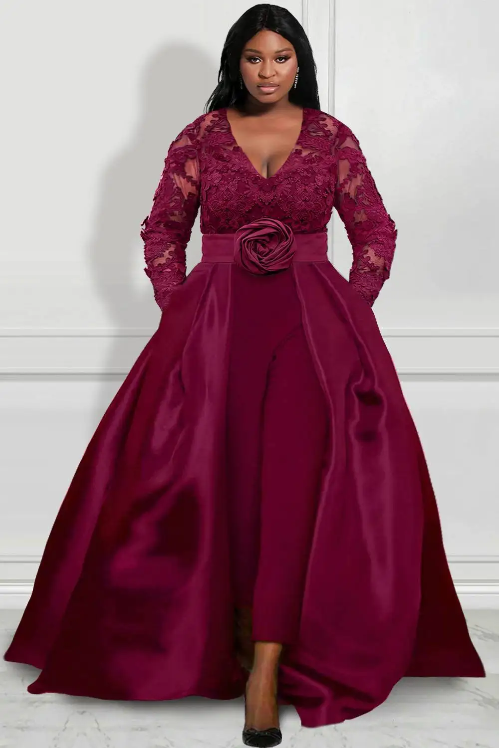 Women Design Plus Size Formal Jumpsuit Burgundy Satin V-Neck Lace Long Sleeve Overlay Skirt Jumpsuit Vestidos para mujer