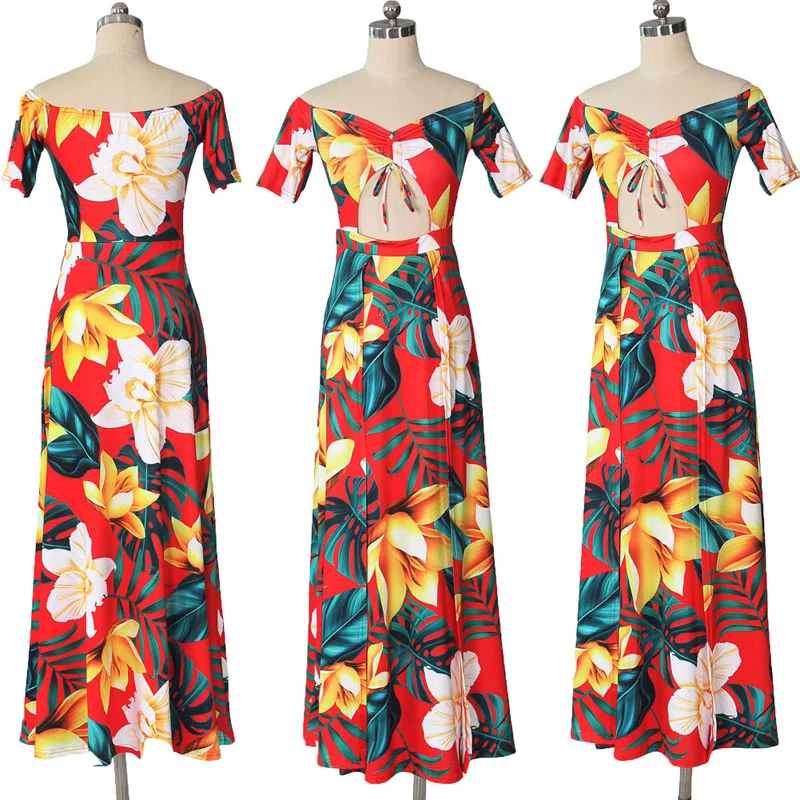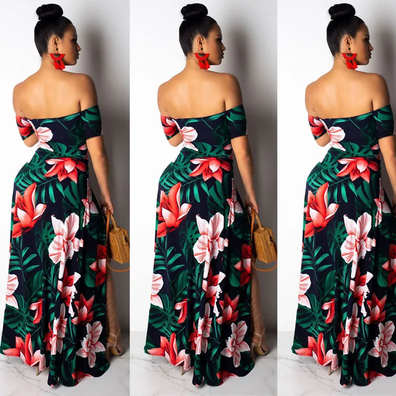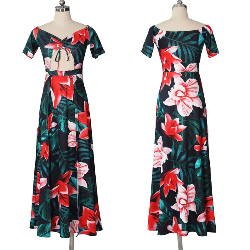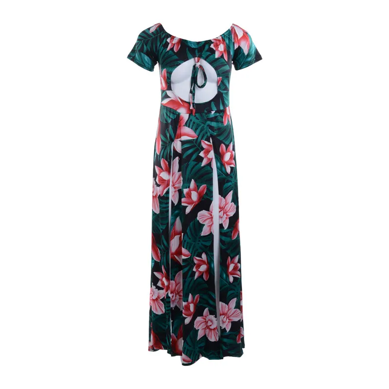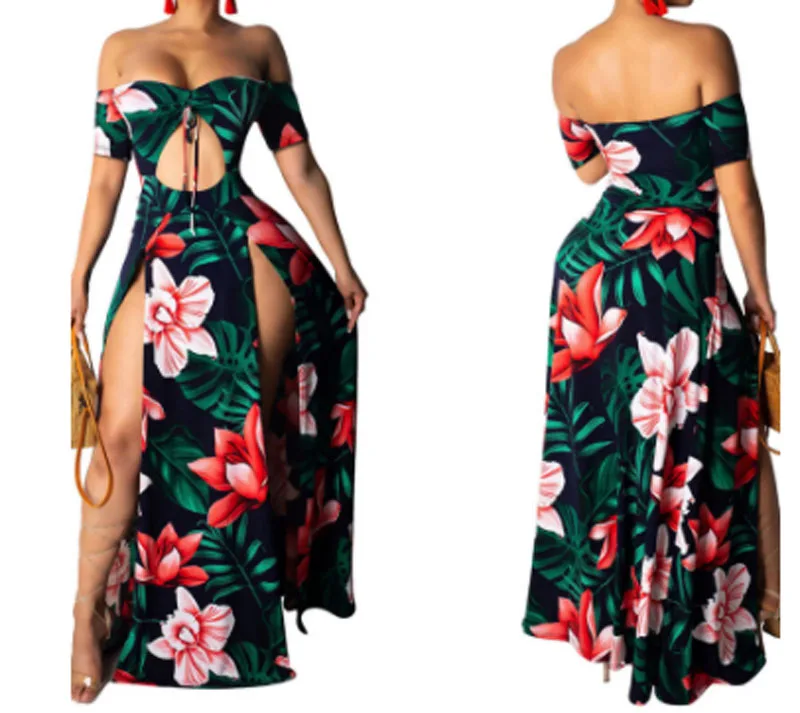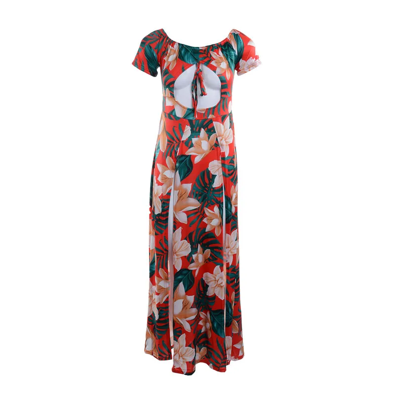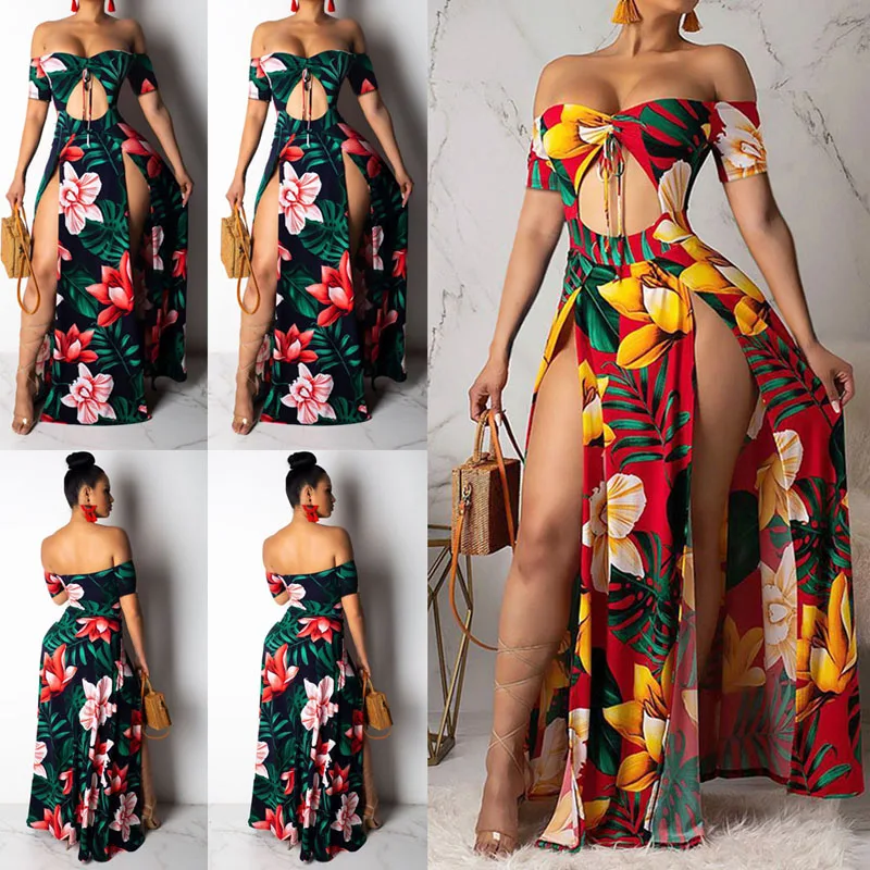 Women Dress Boho Floral Print Off-the-Shoulder Short Sleeve Hollow Split Long Maxi Evening Party Ladies Beach Summer Sundress