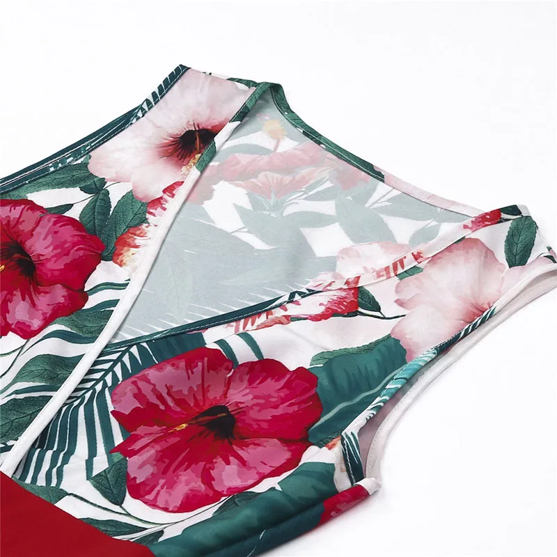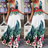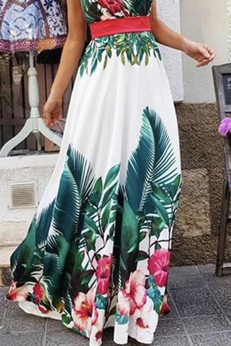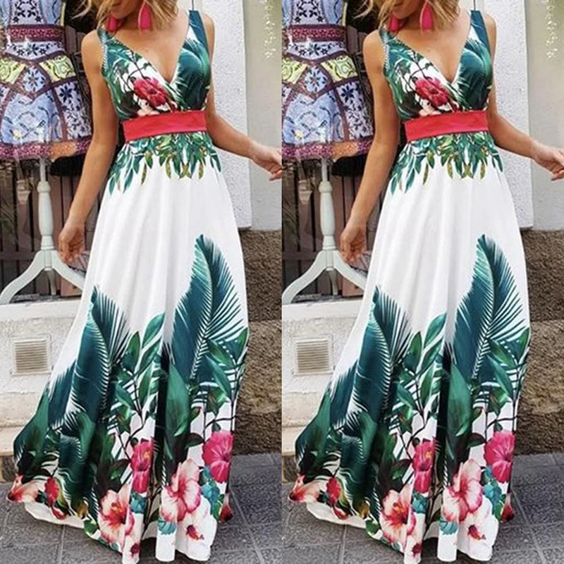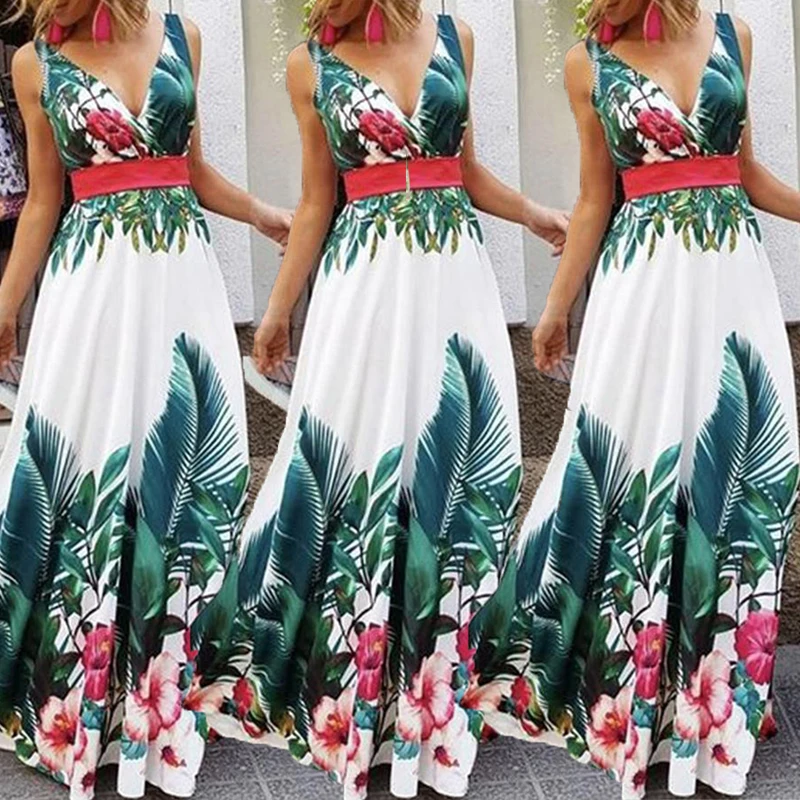 Women Dress Lady Summer Holiday Floral Print Beach Boho Maxi V-Neck Evening Party Sundress Sleeveless High Waist Clothing