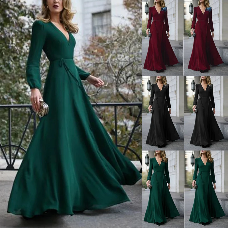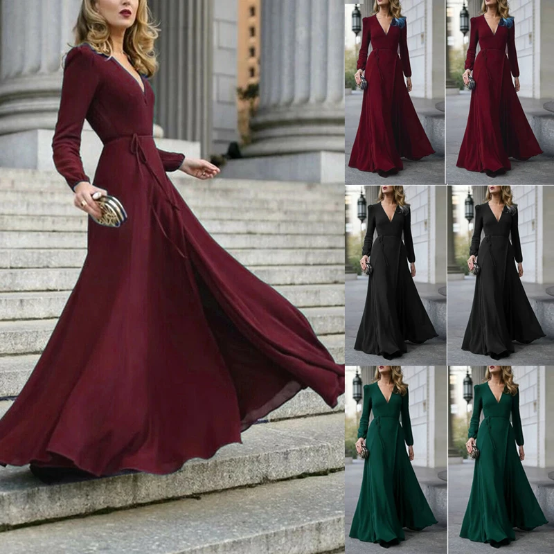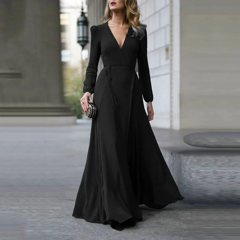Women Dress Sexy Formal Maxi V-Neck Long Sleeve Solid Color Bandage Office Ladies Evening Party Prom Gown Elegant Ruffle Clothes