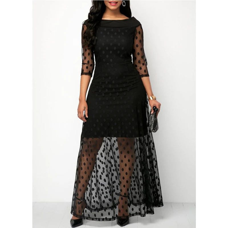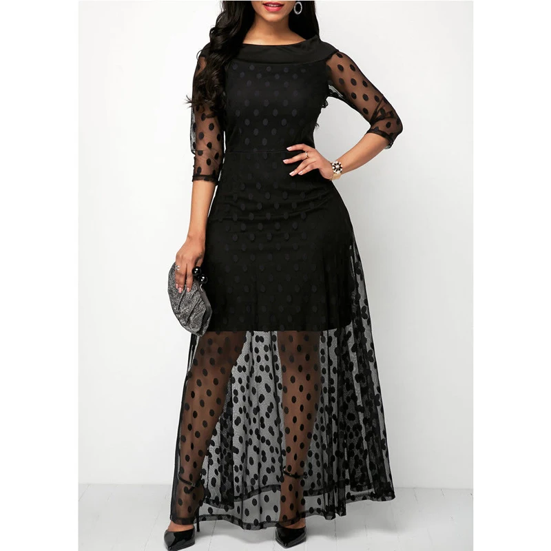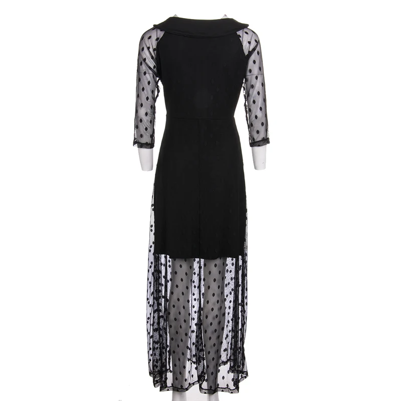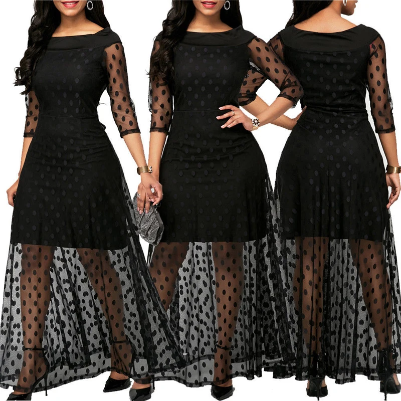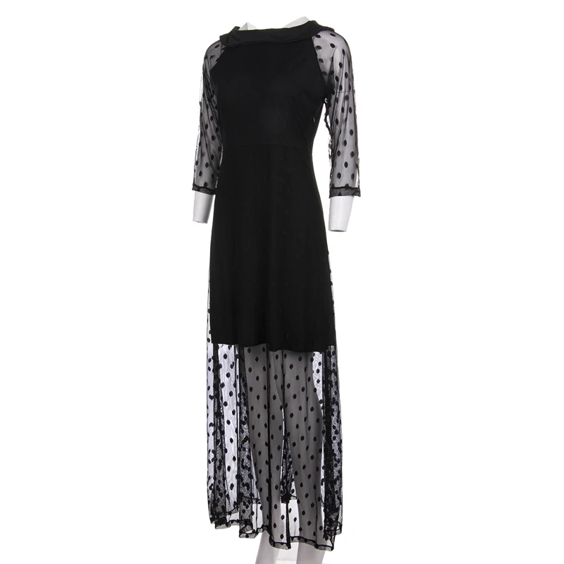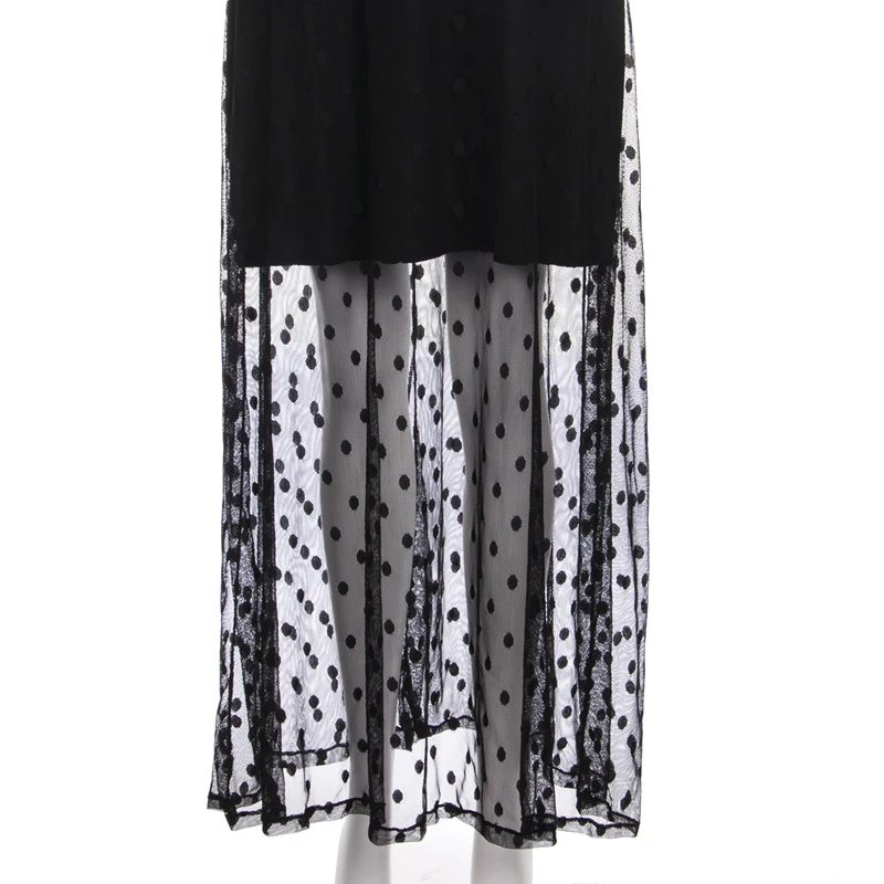 Women Dress Summer New Black Polka Dot Print Mesh Long Maxi Beach Elegant Ladies Tulle Lace Hollow Out Sexy Clothing