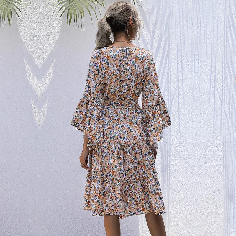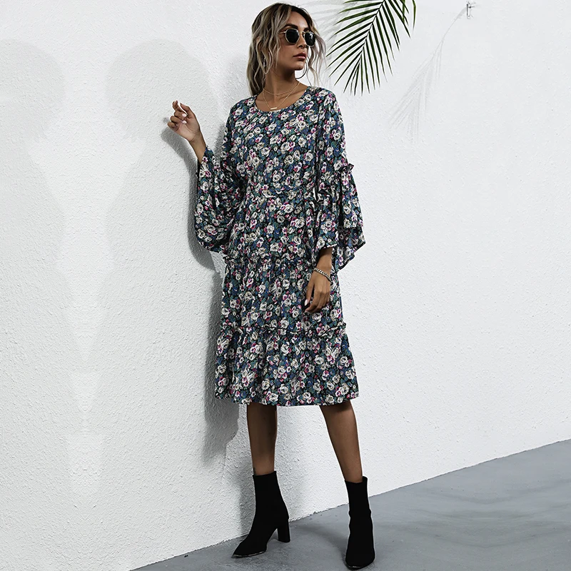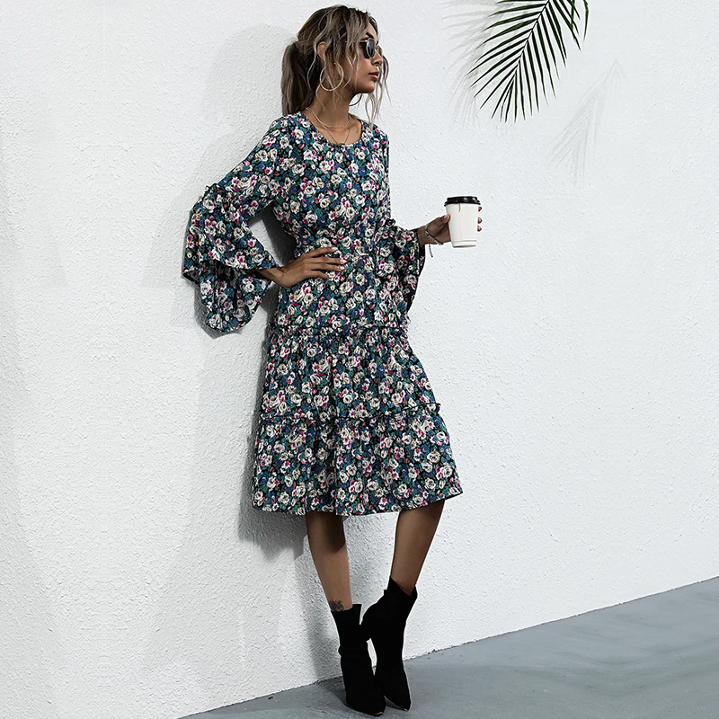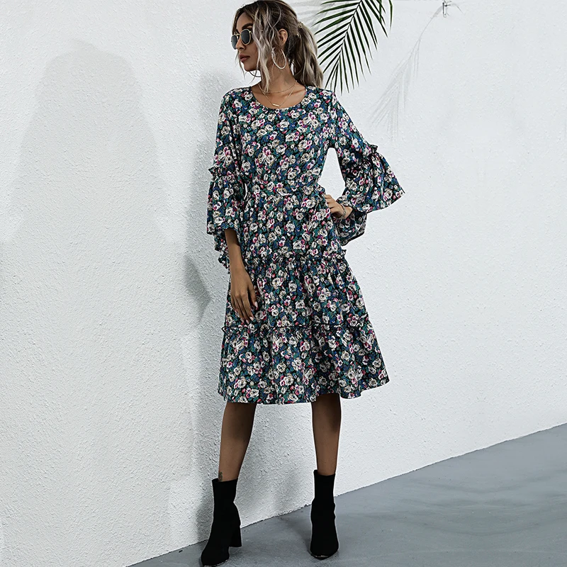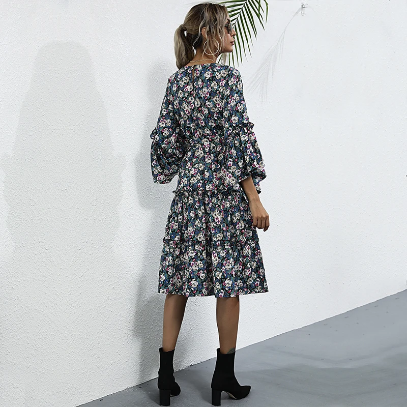 Women Elegant Cascade Ruffled Midi Dress Autumn O Neck Commute OL Shirt Dress Female Casual Holiday Dress New Floral Dress