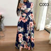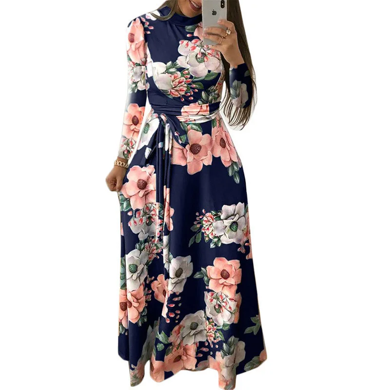 Women Elegant Long Sleeve Flower Print Long Dress Women Casual Slim Sashes O-neck High Waist Robe Party Maxi Vestidos