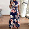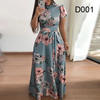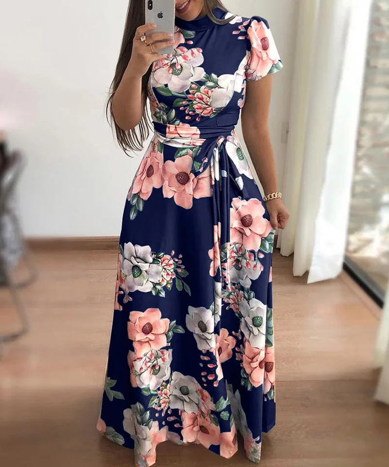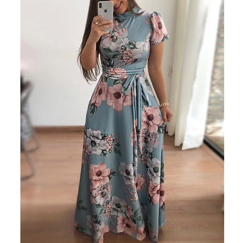 Women Elegant Short Sleeve Flower Print Long Dress Women Casual Slim Sashes O-neck High Waist Robe Party Maxi Vestidos