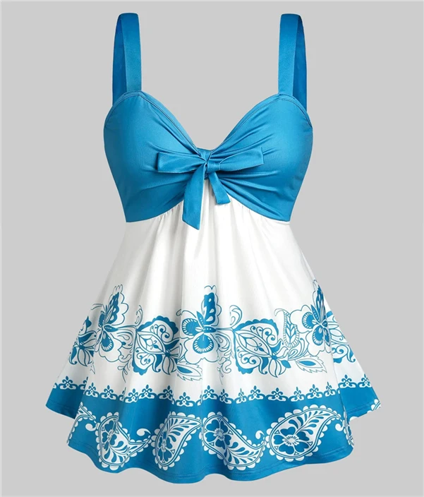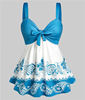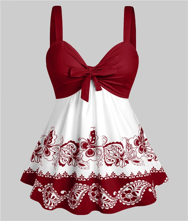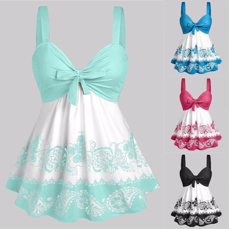 Women Fashion Floral Print Front Tie Tank Top Summer Casual V Neck Tops Ladies Casual Bow Front Loose Vest Plus Size
