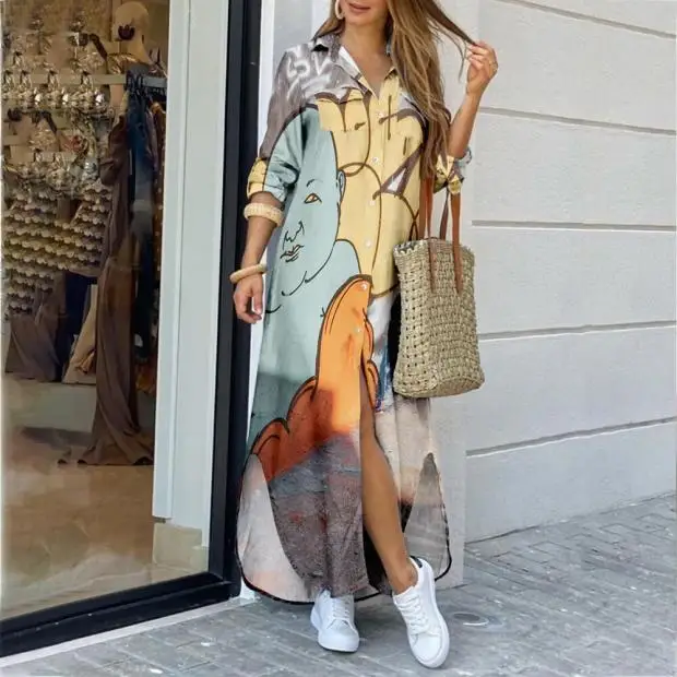 Women Fashion Shirt-style Button Dress Ladies Casual Long Streetwear Dresses Loose Home Commuter Print Summer Dress Vestidos