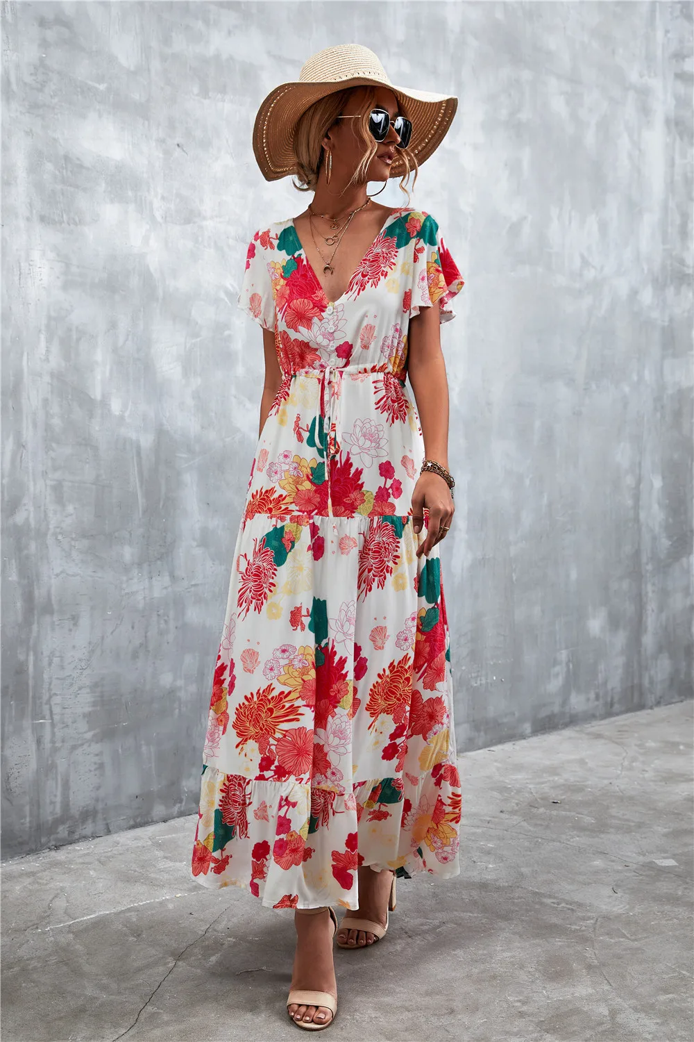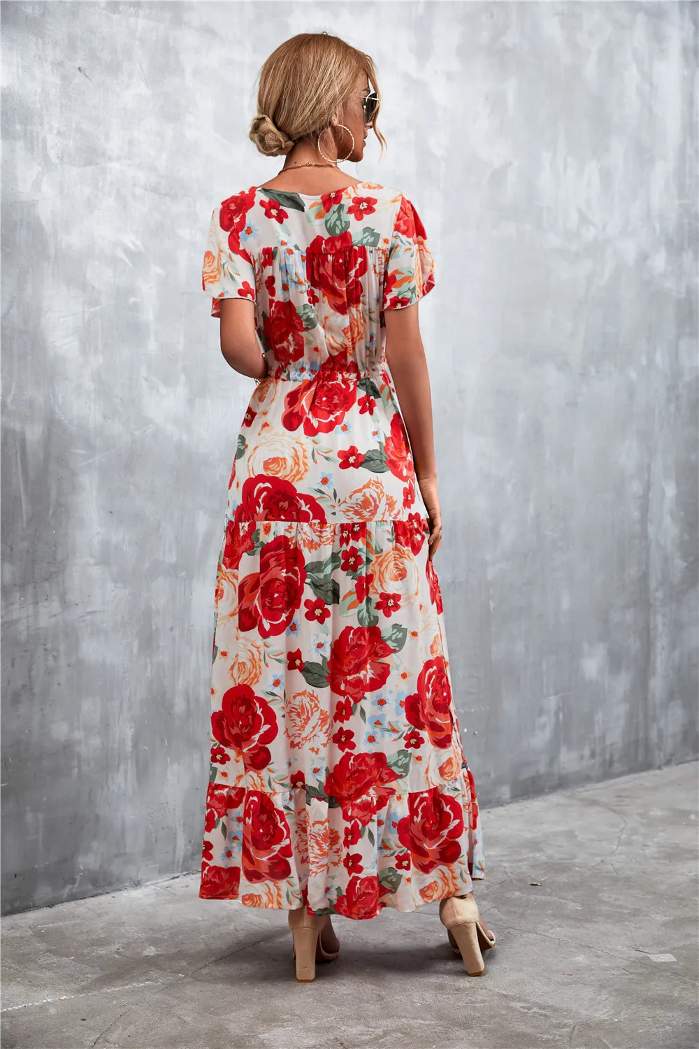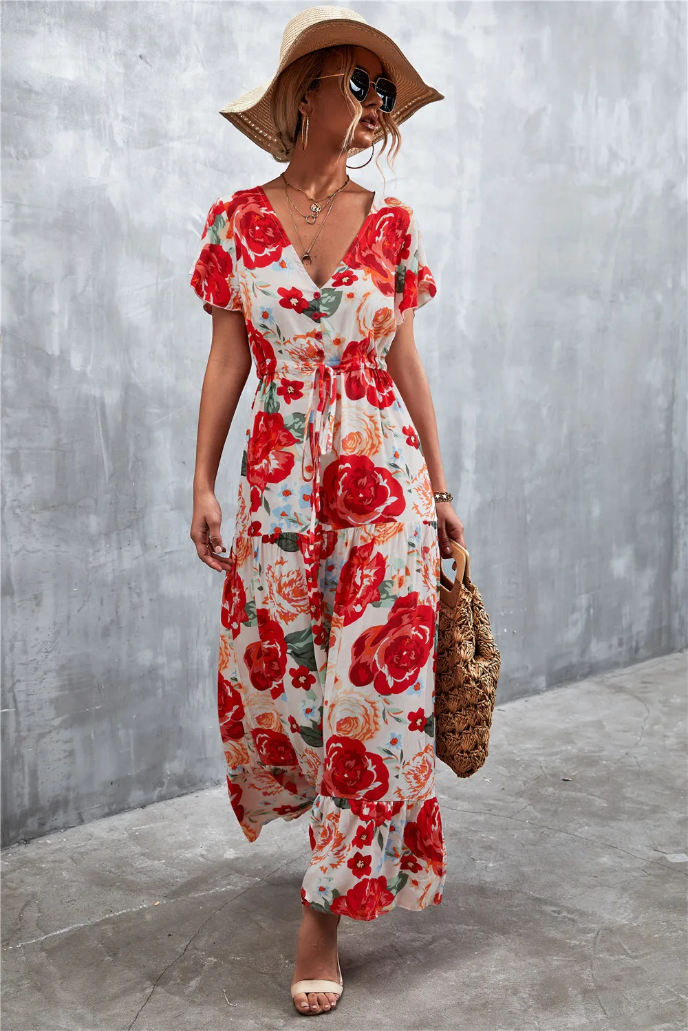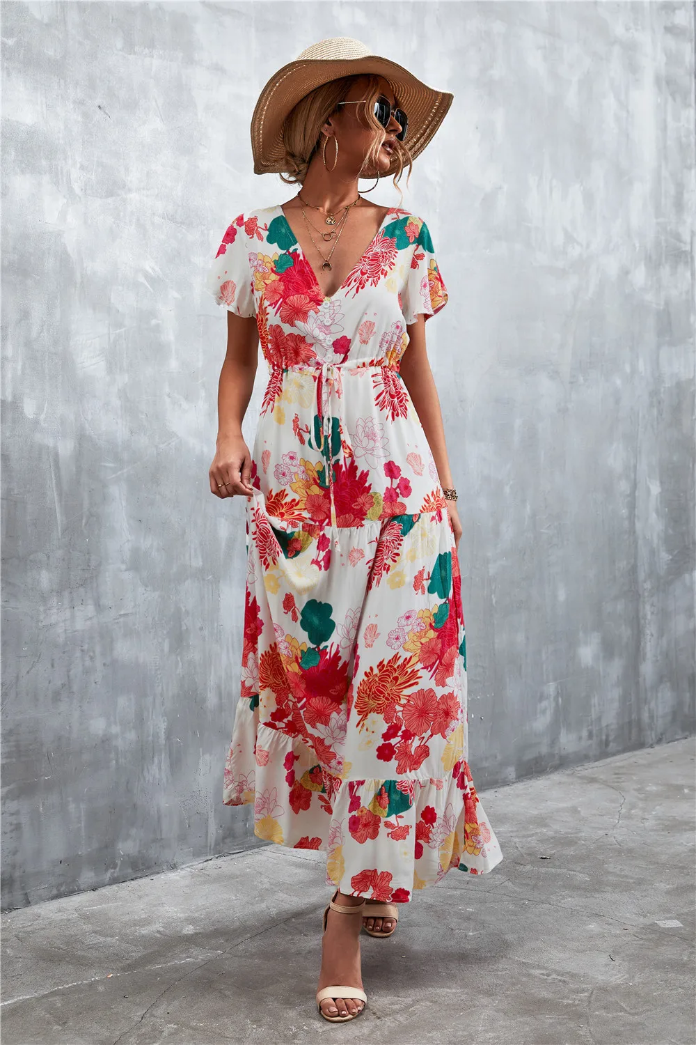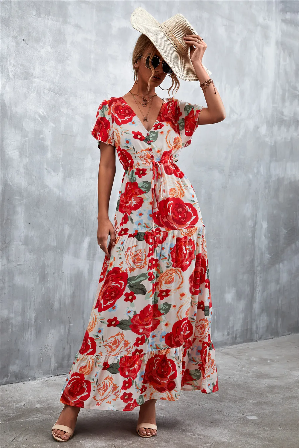 Women Floral Print Short Sleeve Beach Bohemian Maxi Dress Robe Ladies V-neck Boho Dresses Vestidos Ropa De Mujer 2022 Fashion