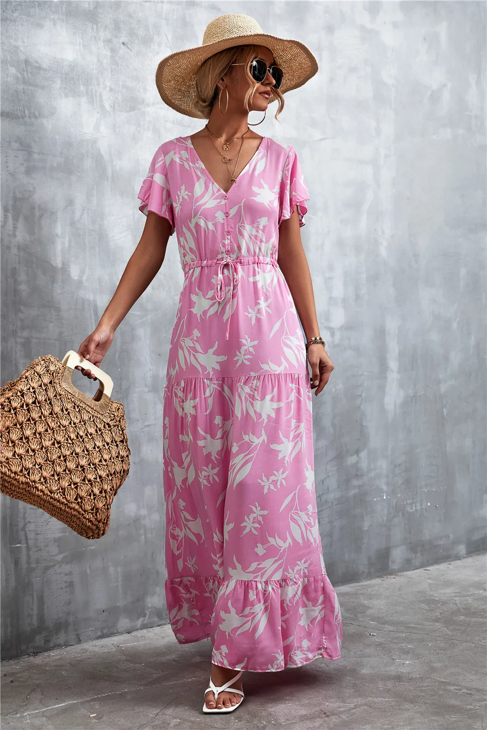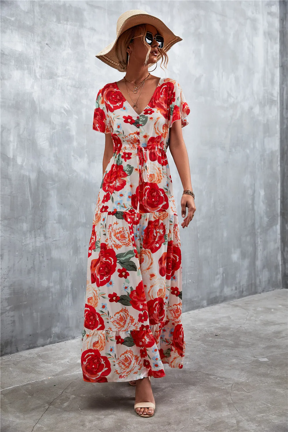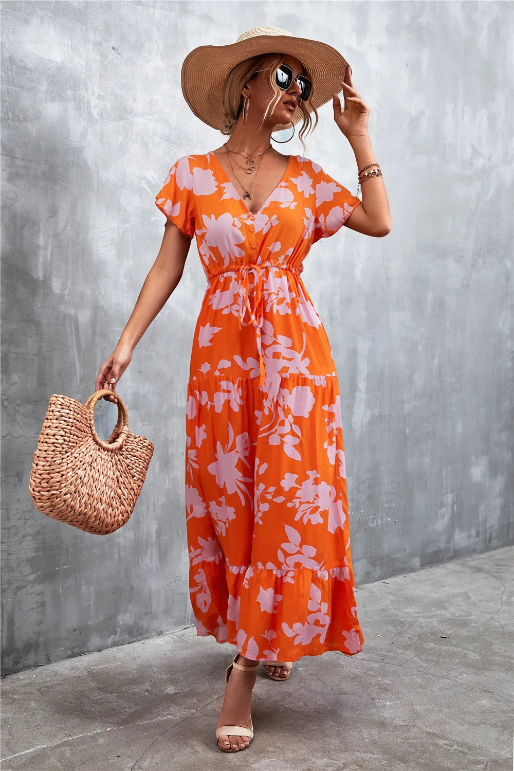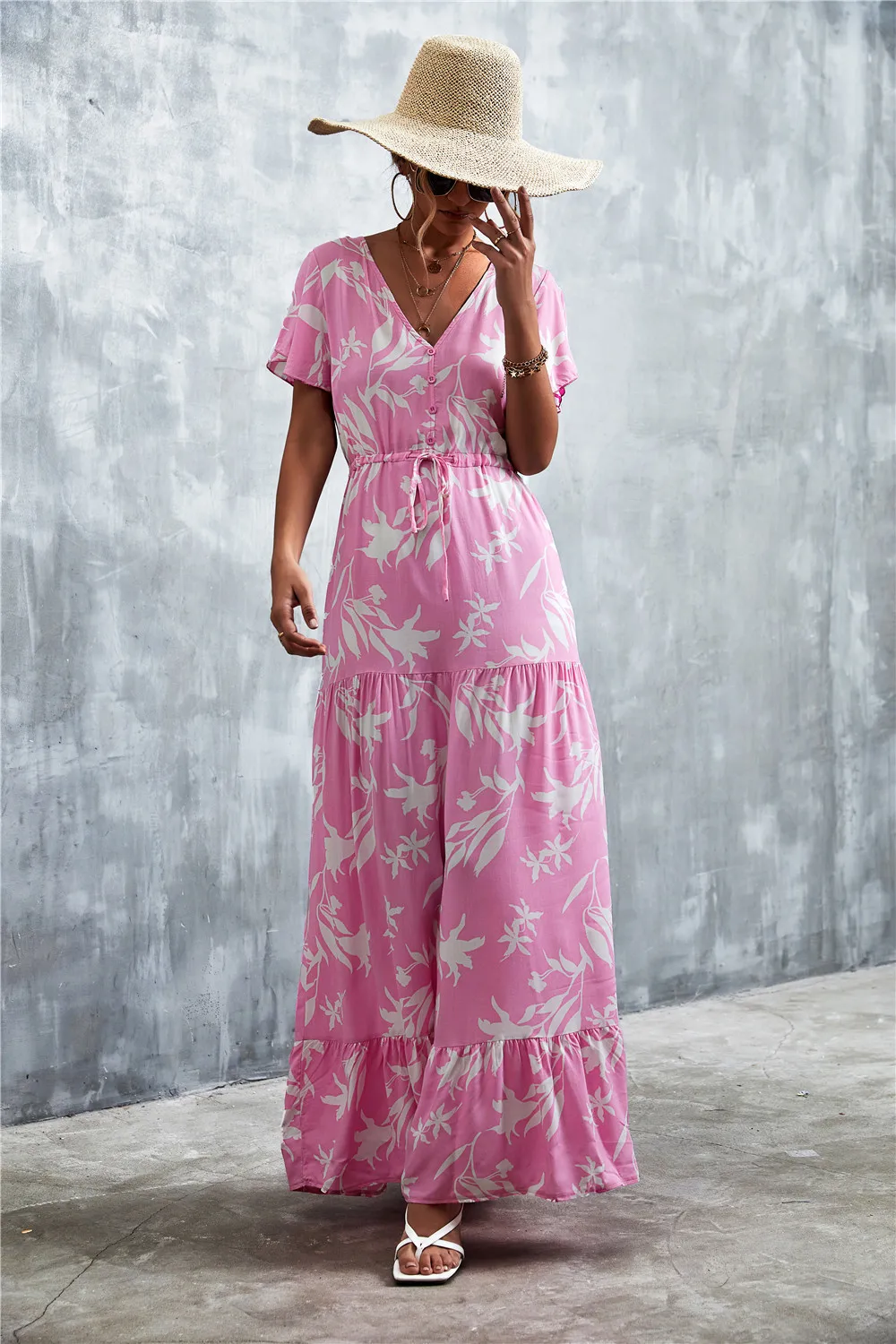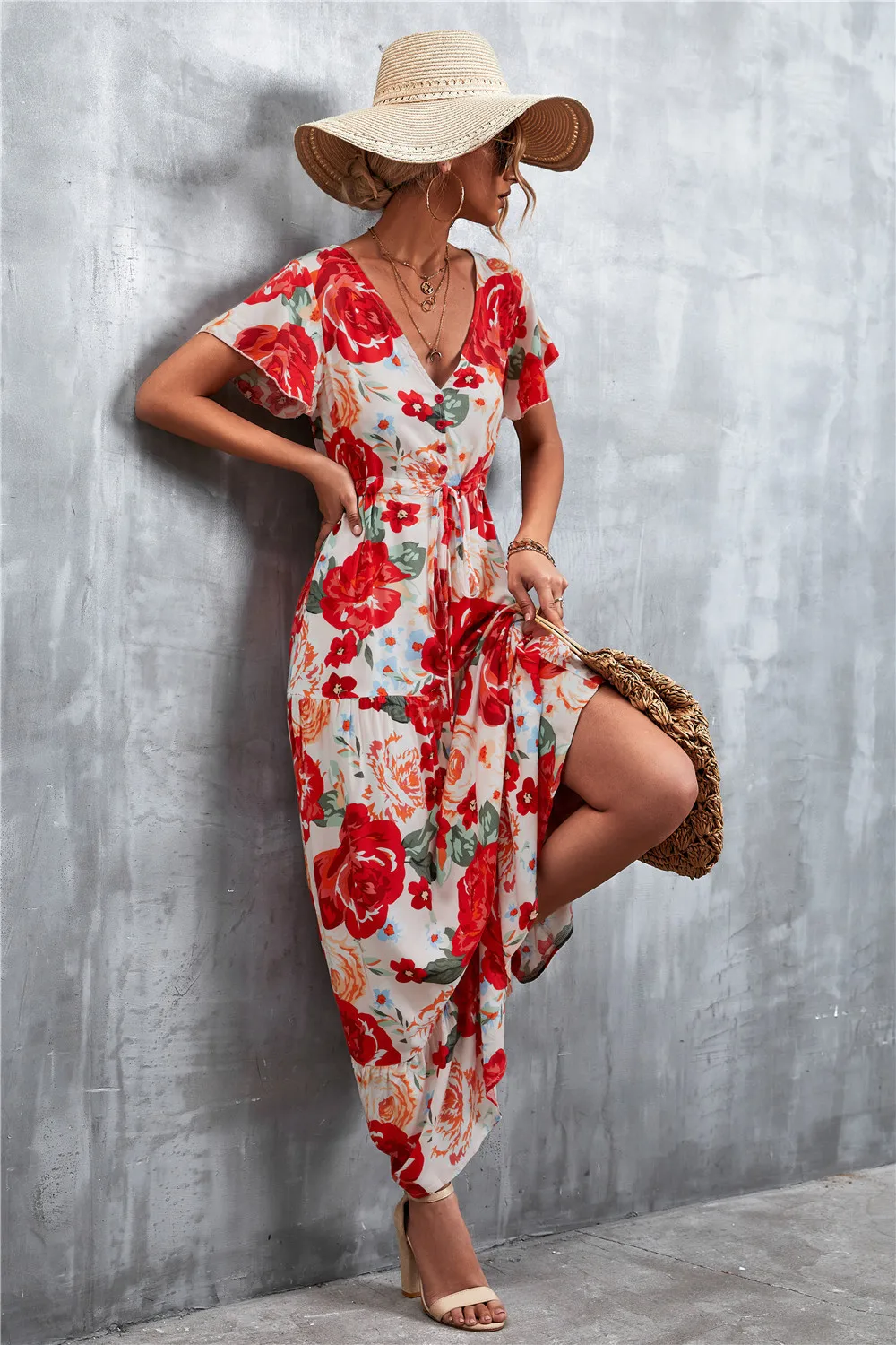 Women Floral Print Short Sleeve Beach Bohemian Maxi Dress Robe Ladies V-neck Boho Dresses Vestidos Ropa De Mujer 2022 Fashion