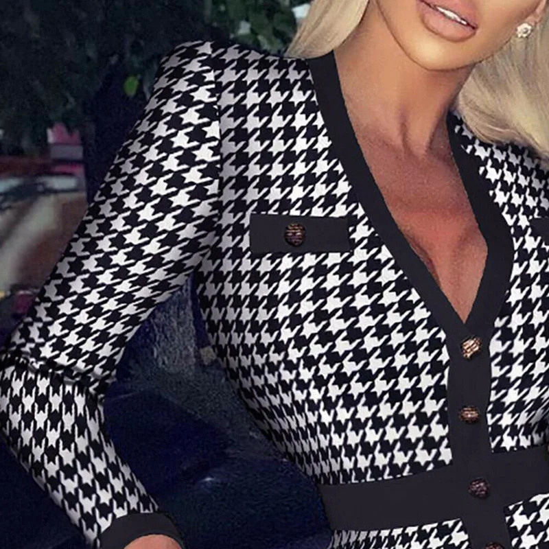 Women Houndstooth Print Split Dress Sexy Deep V-neck Button Party Dresses Spring Autumn Long Sleeve Bodycon Office Lady Dresses