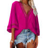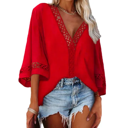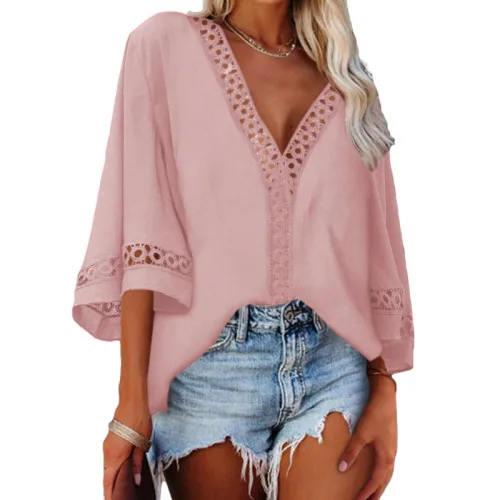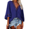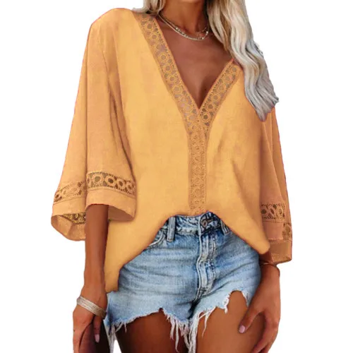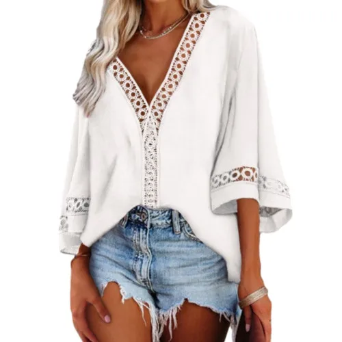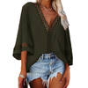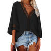 Women Lace V Neck Shirt 3/4 Bell Sleeve Casual Loose Shirt Tops Lace Patchwork Tops Women Loose Fit Solid Color Blouse Spring
