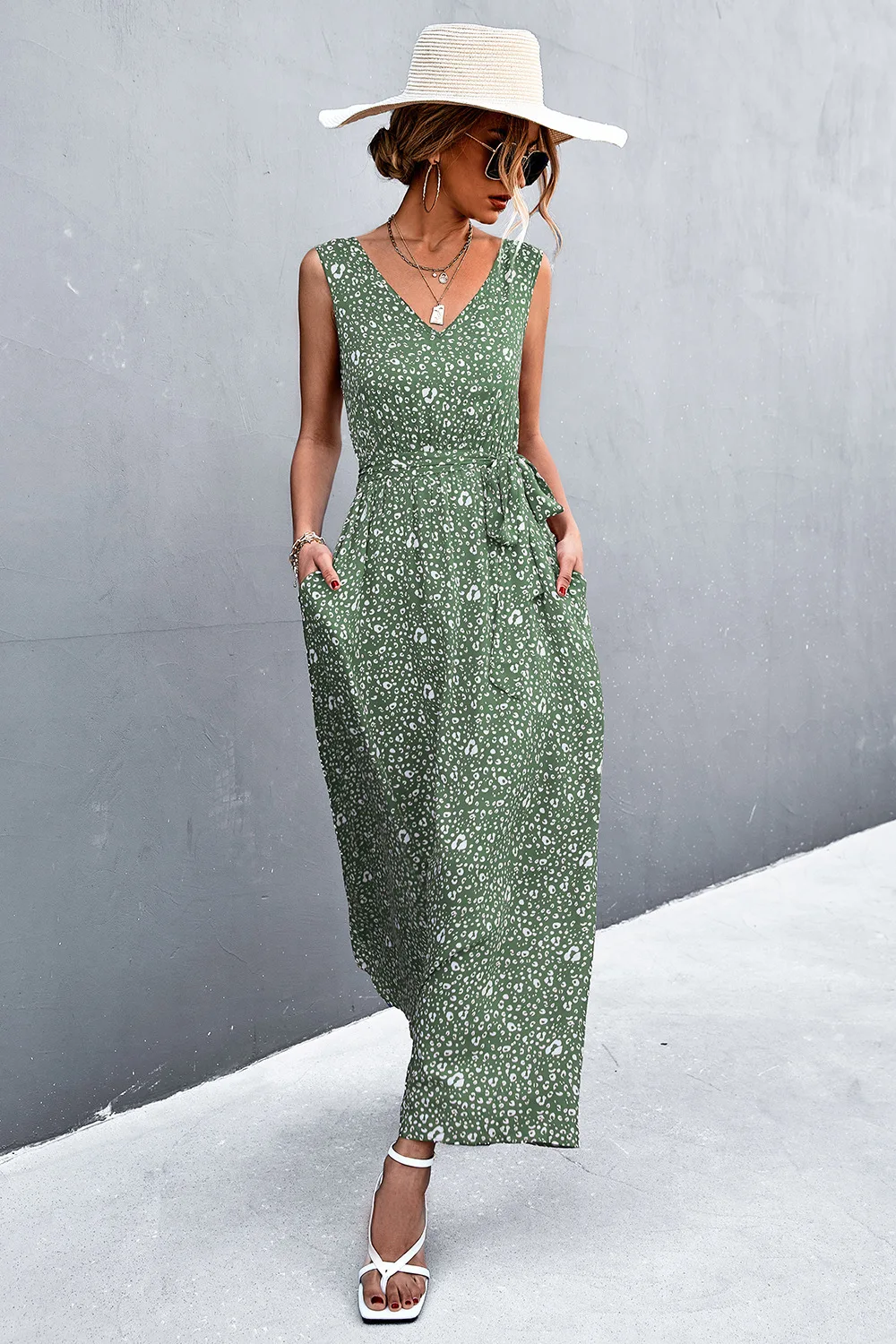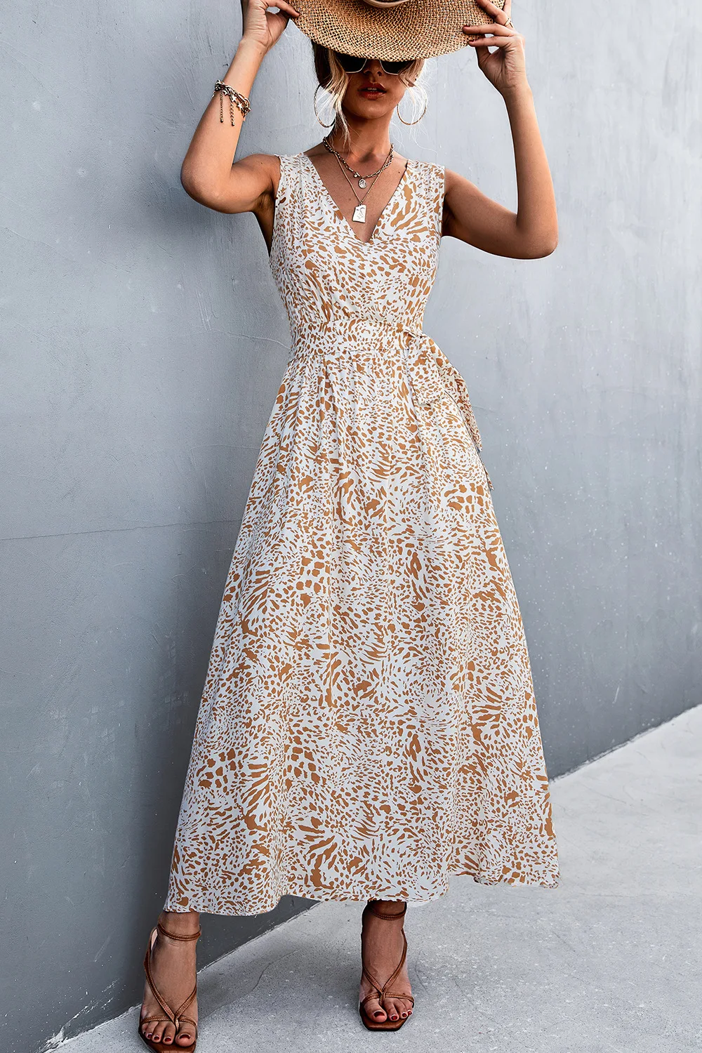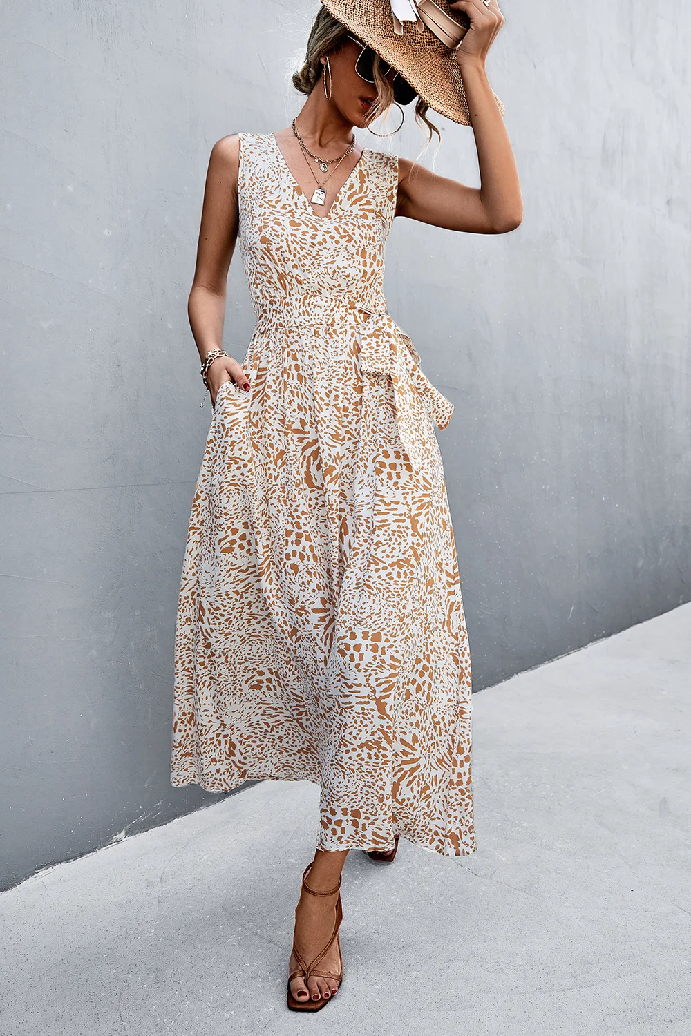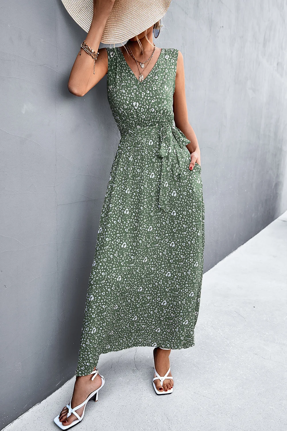 Women Leopard Print Sleeveless Beach Bohemian Maxi Dress Ladies V-neck Belt Boho Sundress Vestidos Fahion Big Swing Maxi Dresses